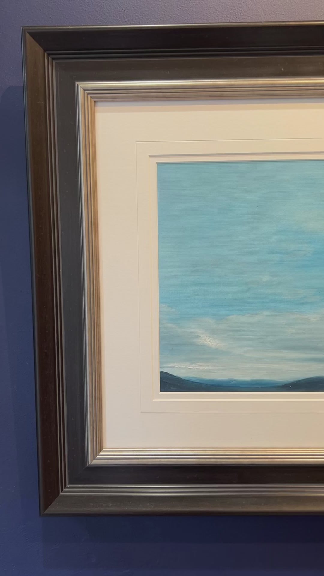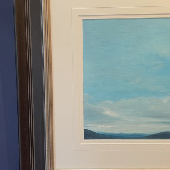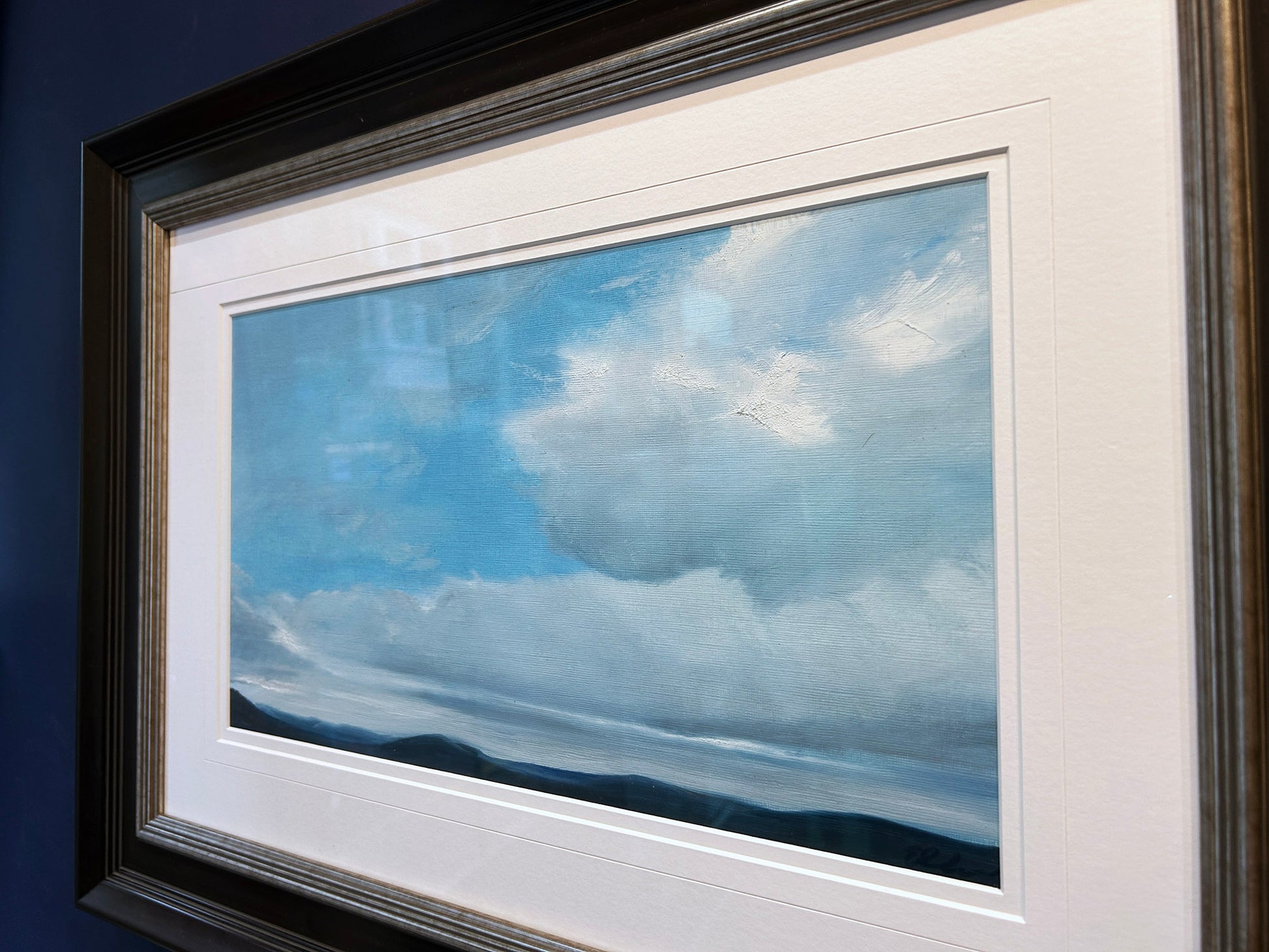 This expansive skyscape evokes the hush of a highland afternoon. Wisps of luminous cloud drift across a boundless blue, their painterly softness forming a delicate contrast with the distant silhouette of rolling hills. The gentle layering of greys and whites captures the movement of wind above the moors, while the long format of the composition enhances the sense of open air and freedom. Mounted within a wide white border and elegantly framed in a dark, silver-trimmed moulding, the artwork radiates quiet majesty. A contemplative moment suspended above the landscape – timeless, boundless, and serene.