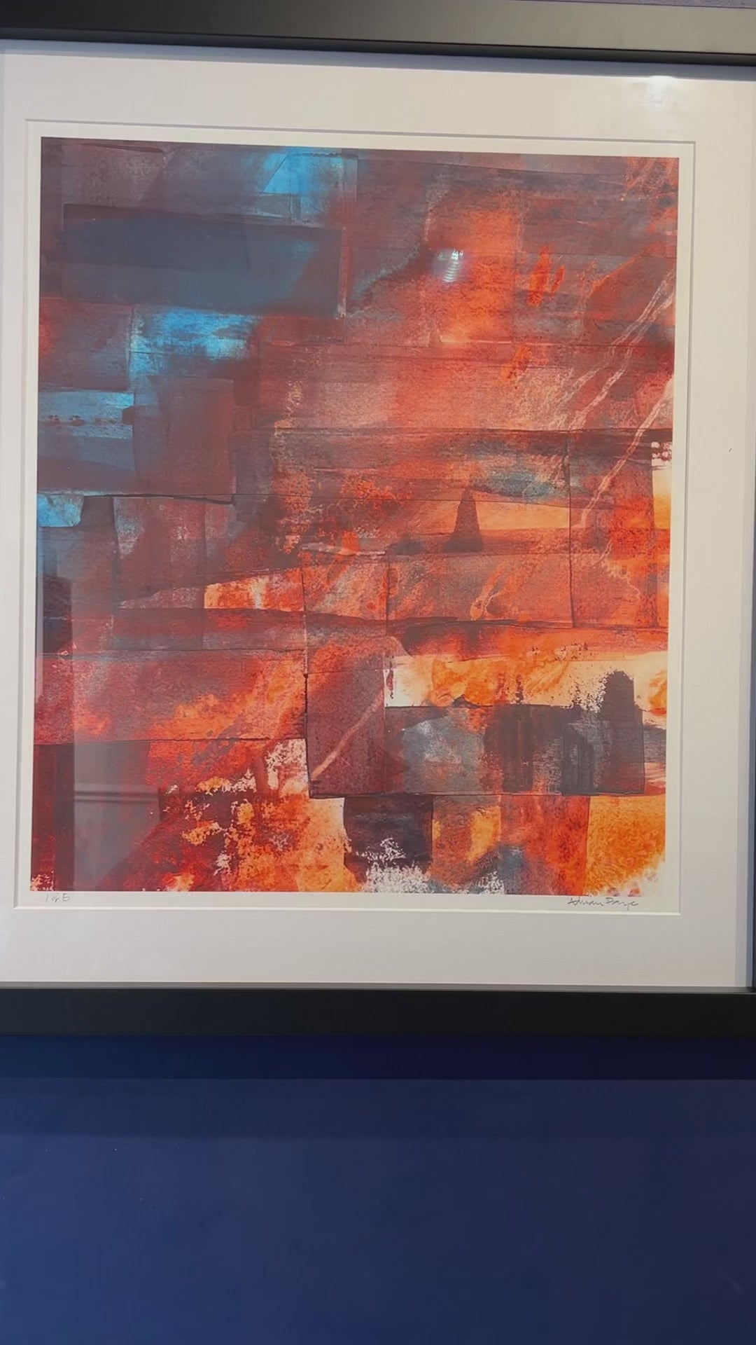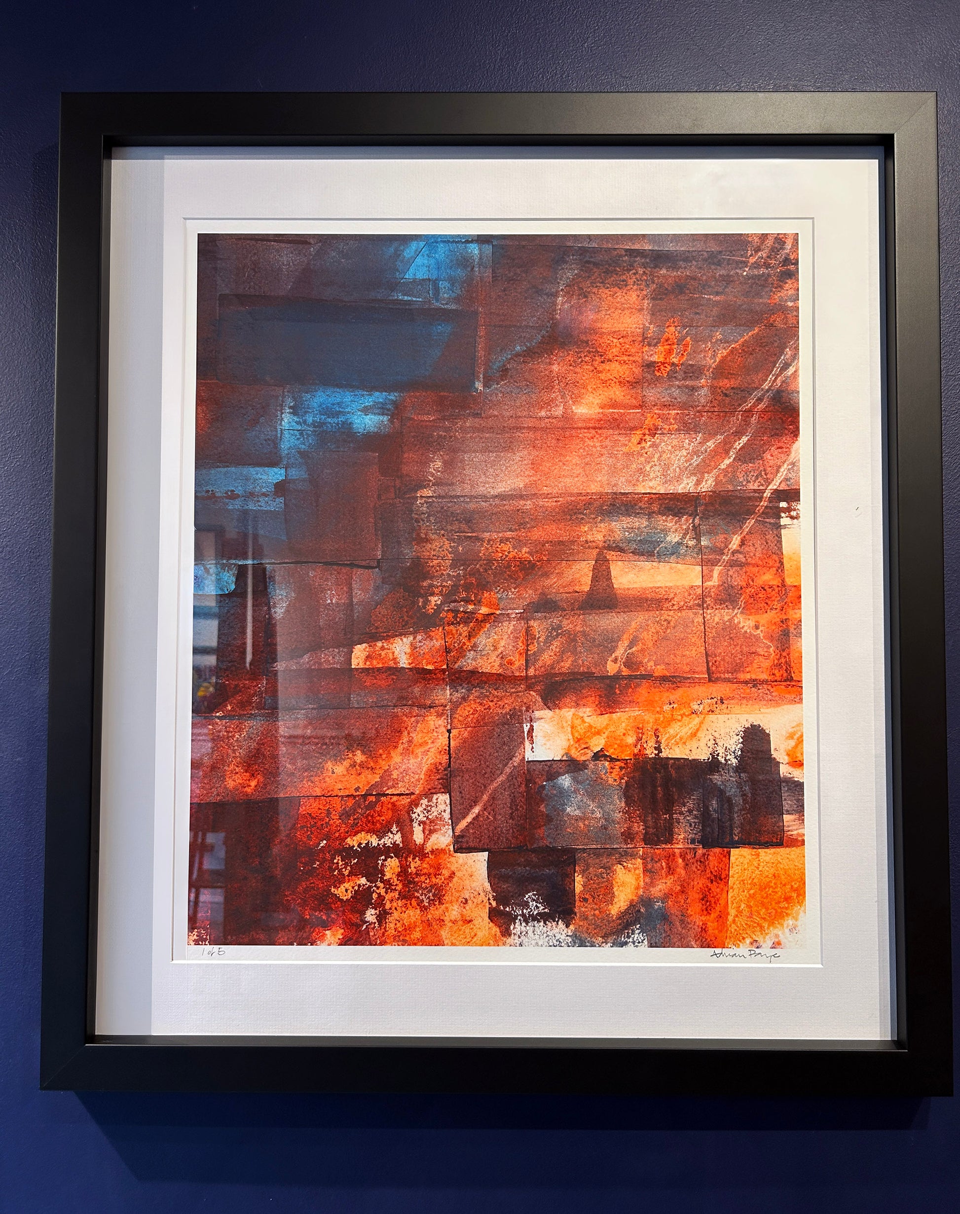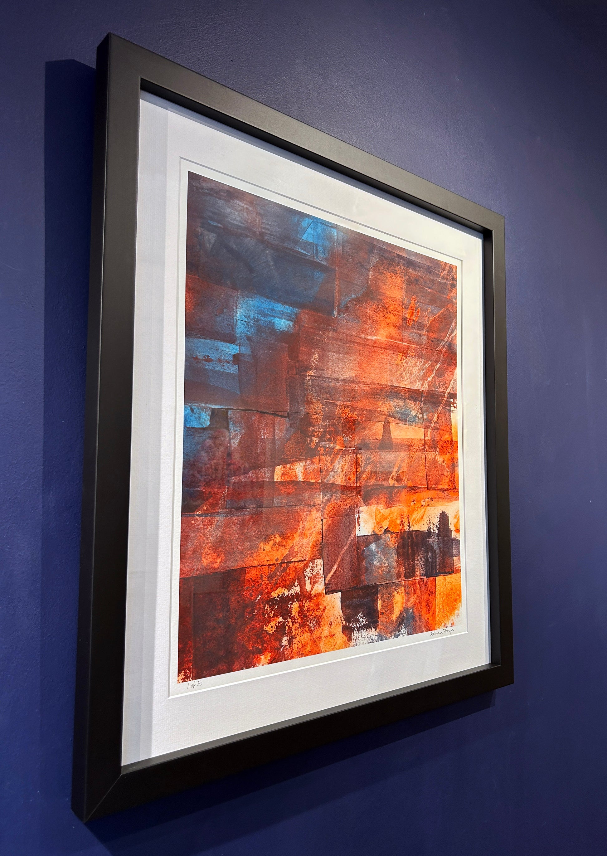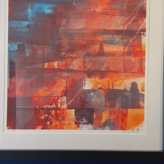 This captivating piece by Adrian Paye layers rich, earthen tones with glimmers of fiery orange and cool blue, creating the impression of weathered surfaces and elemental forces. The composition feels both architectural and organic, as if ancient walls hold the memory of fire, rust, and light. Textural contrasts invite the viewer to explore each mark and layer, discovering new details upon every glance. The fragmented, collage-like effect draws you into a dialogue between decay and beauty, reminding us of the quiet poetry found in time-worn materials.