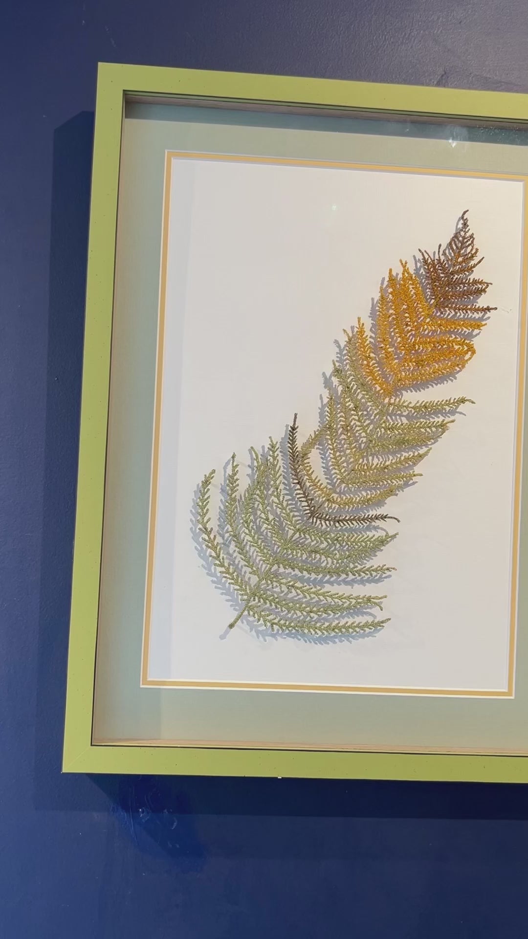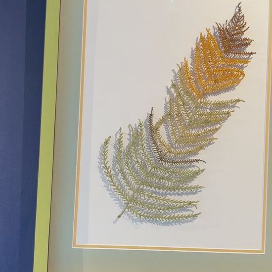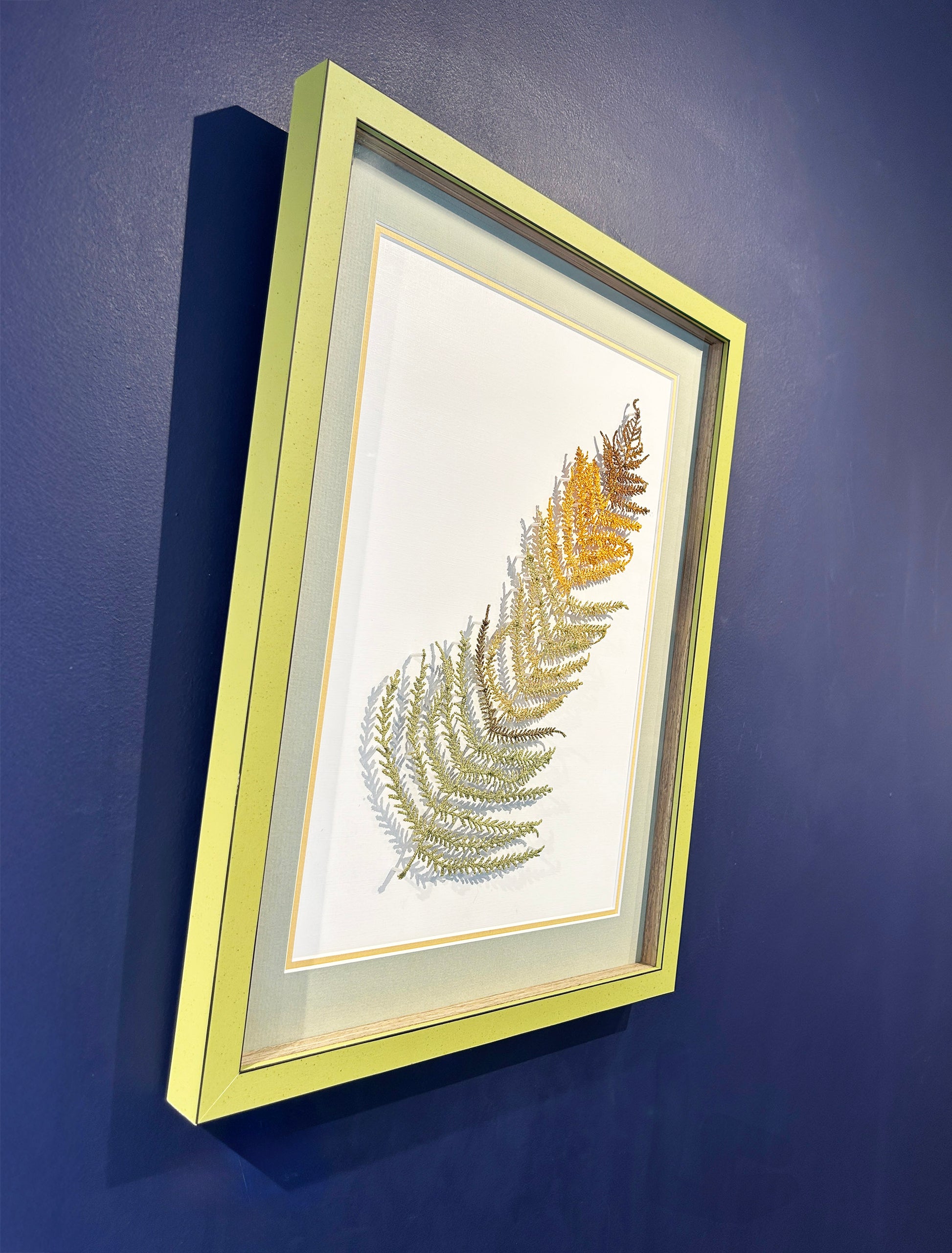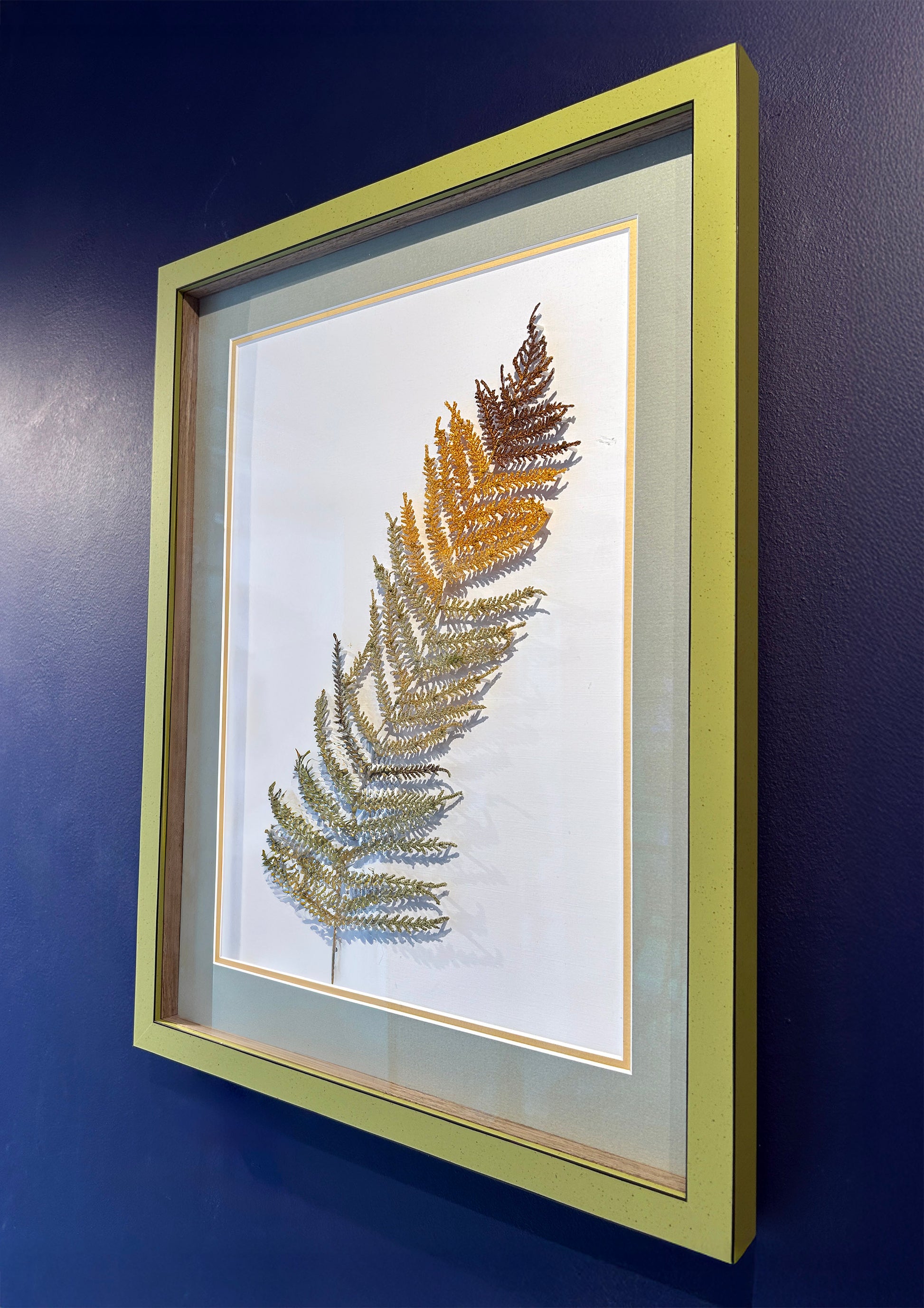 A delicate study in seasonal transition, this single fern frond curves softly across the canvas, moving from sage green through gold to deep rust. Each leaflet is intricately preserved, its fine structure gently lifted from the mount to cast whisper-light shadows onto the pale backdrop. The soft grey mount and clean white border create a calm space in which the botanical form can breathe, while the fresh green frame adds a subtle echo of spring’s renewal, balancing the autumnal tones within. Quietly sculptural and meditative in nature, the work invites stillness — a quiet moment to observe the gentle fading of the year and the grace held in nature’s small details.