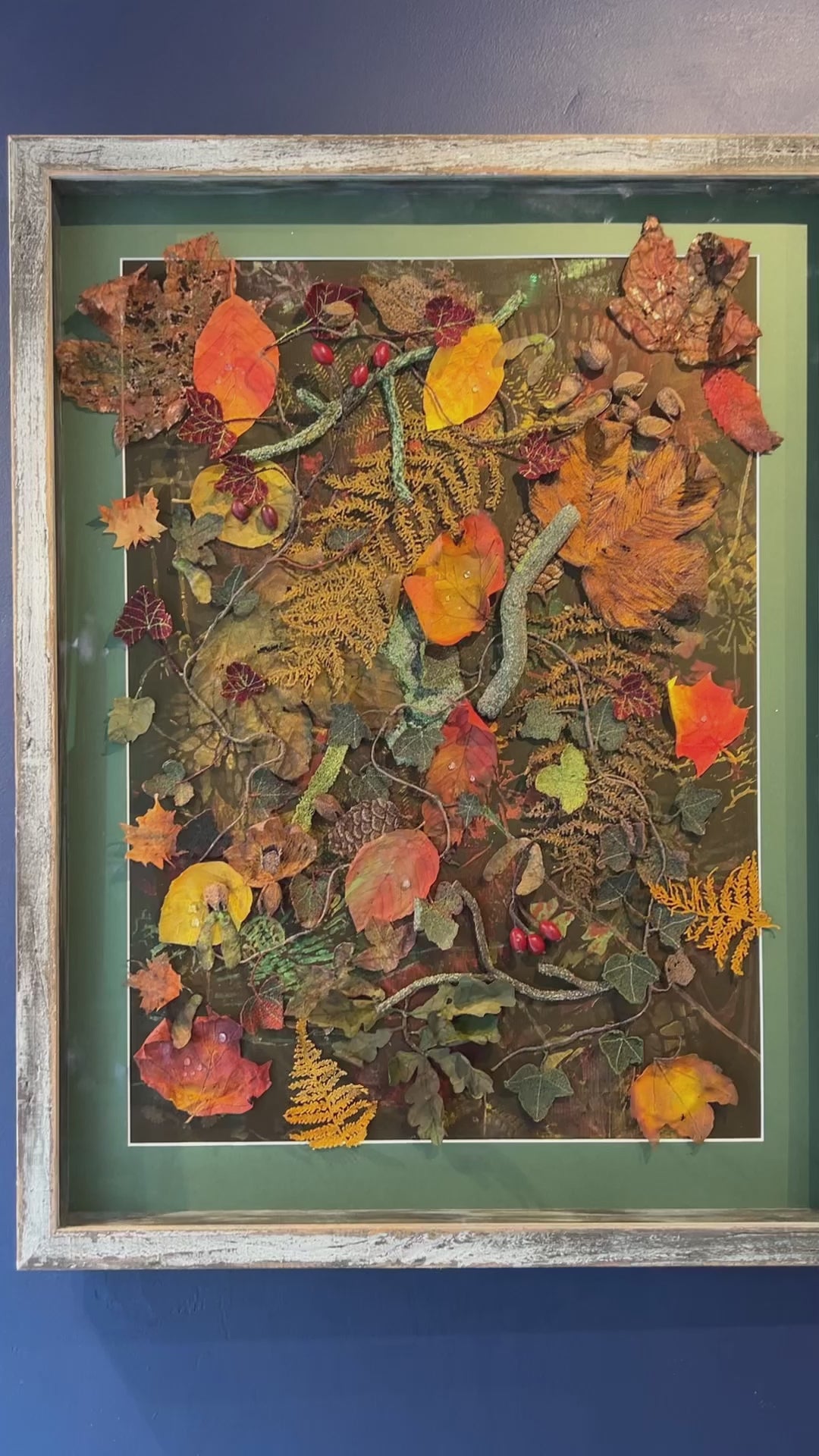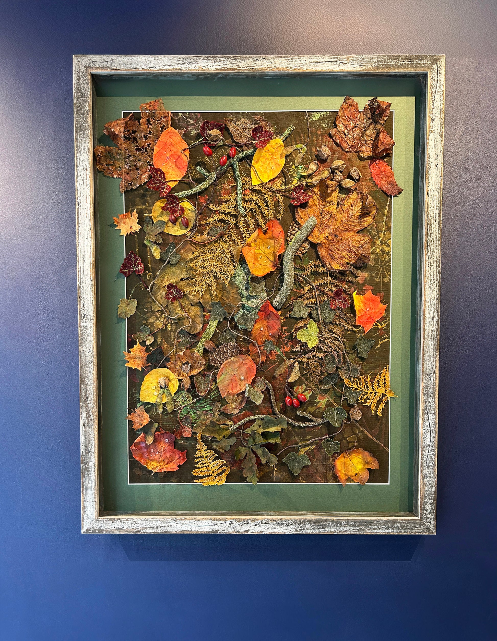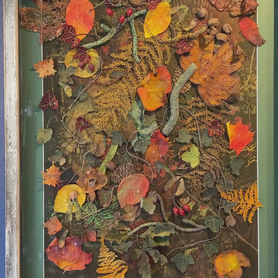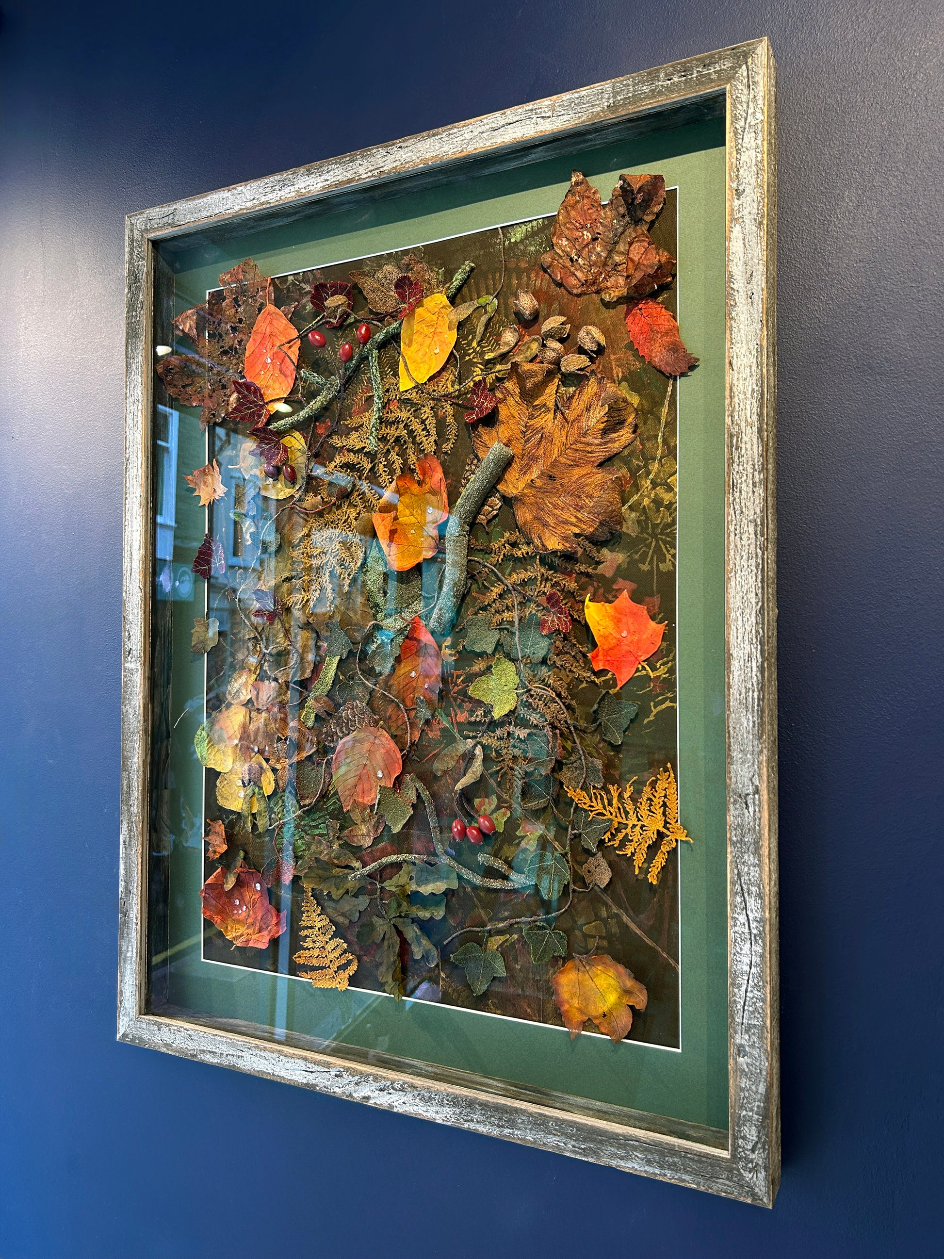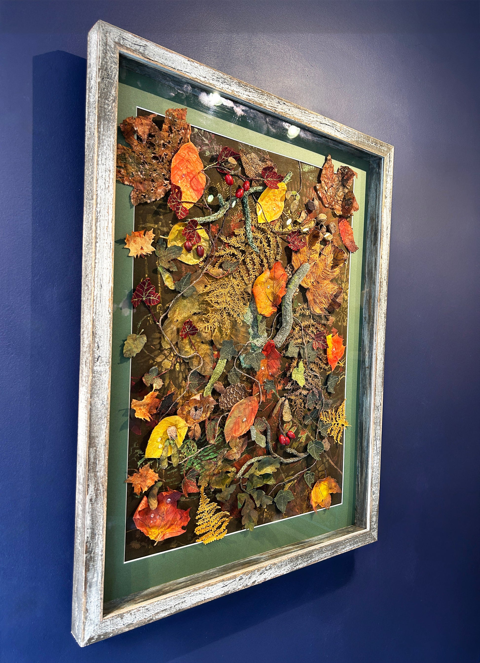 A richly textured composition that captures the quiet poetry of the woodland floor at the turning of the year. Layers of fallen leaves, twisted twigs, rose hips, and golden ferns are delicately arranged and slightly raised from the mount, allowing soft shadows to form and giving the piece a sculptural presence. Each element — from the brittle edges of the maple leaves to the soft sheen of acorns — is rendered with care, drawing the eye into a tapestry of deep russets, ochres, and mossy greens. Set against a deep green surround and enclosed in a weathered wooden frame with a silvered patina, the overall effect is immersive and organic — a serene celebration of nature’s fading glory, held still in time.