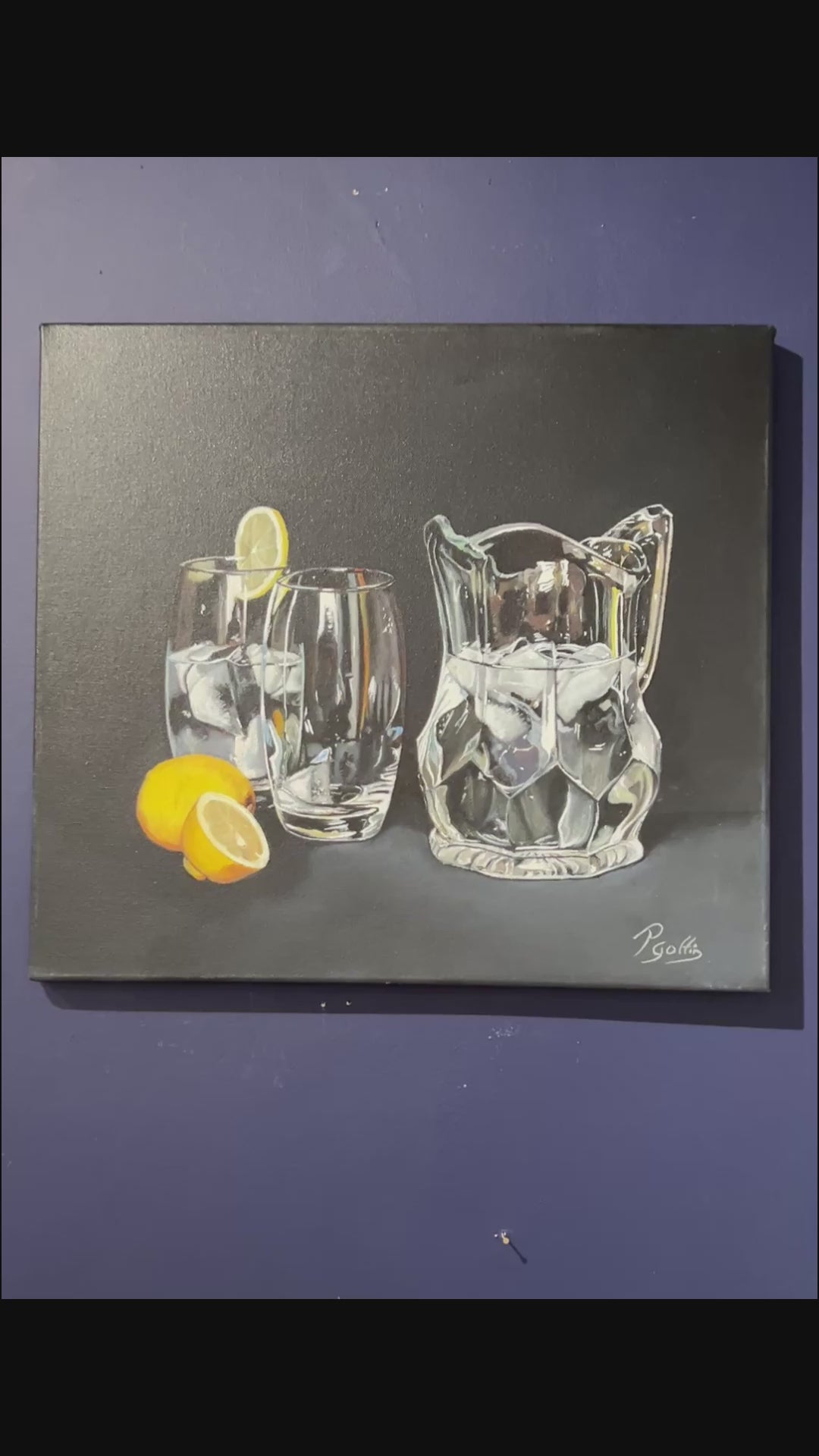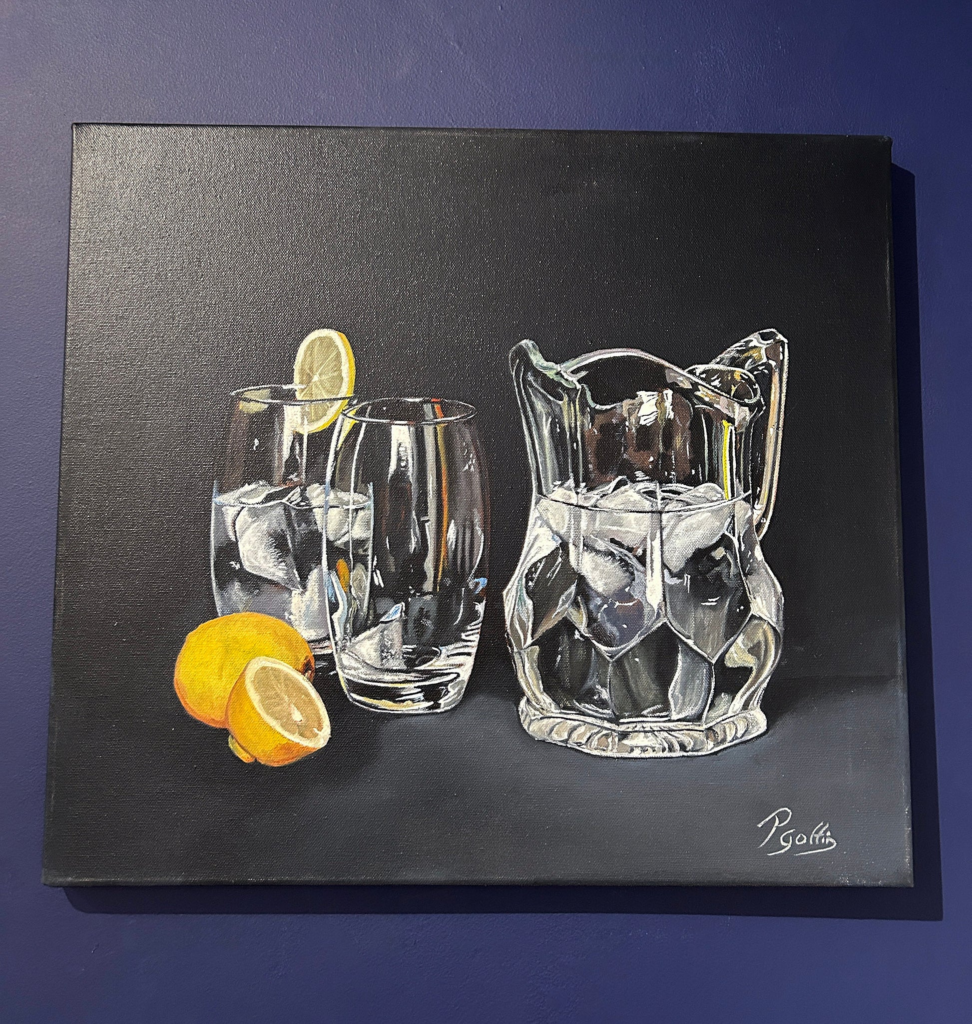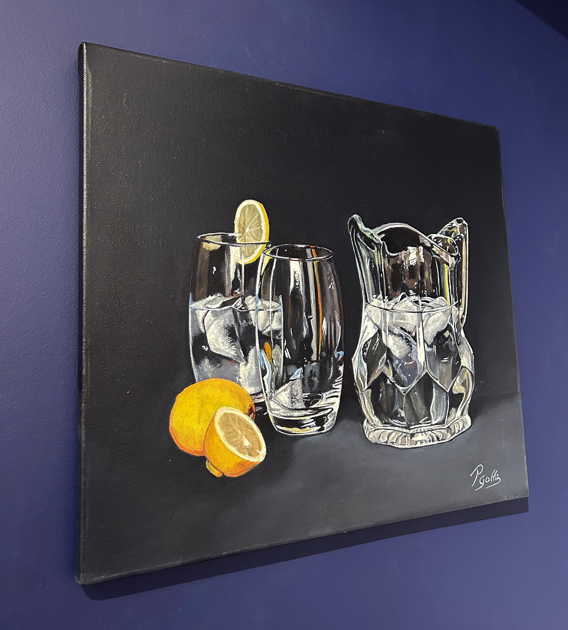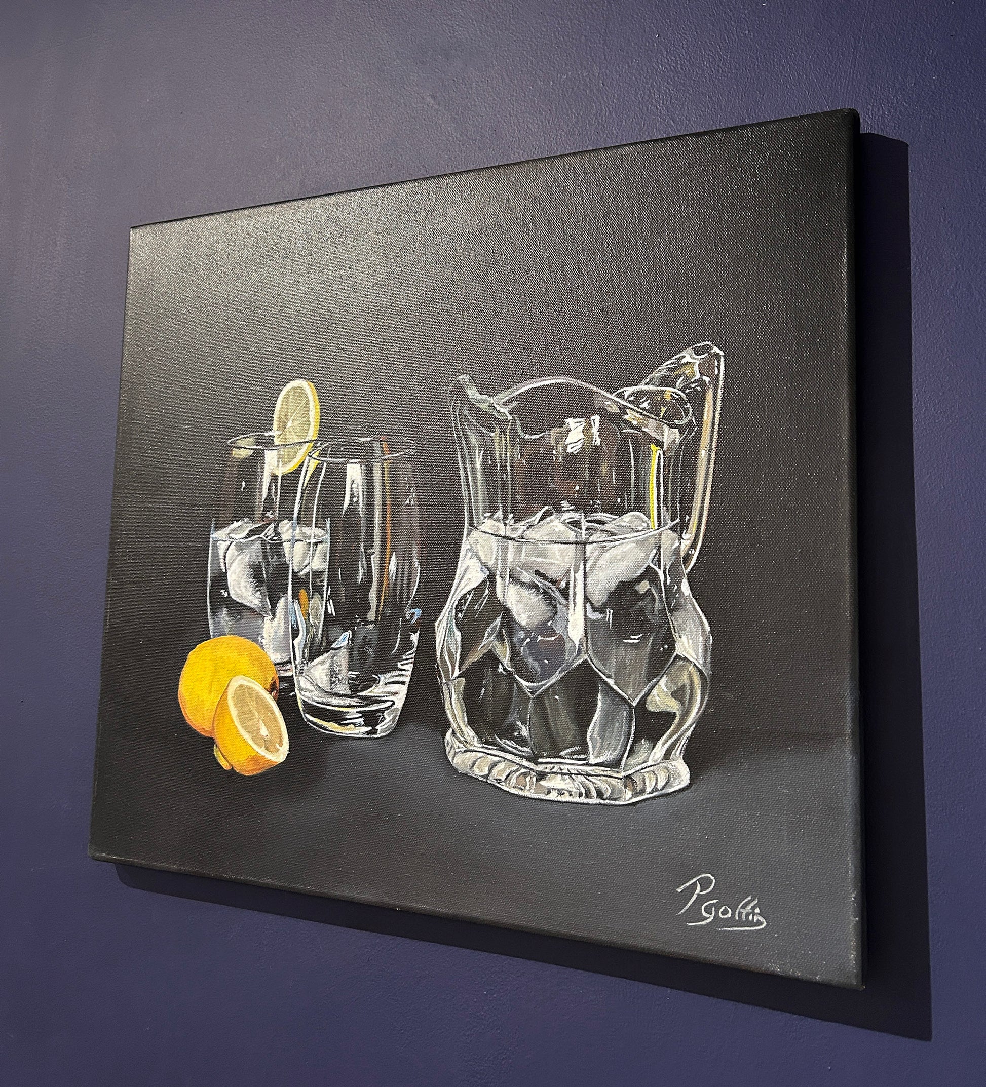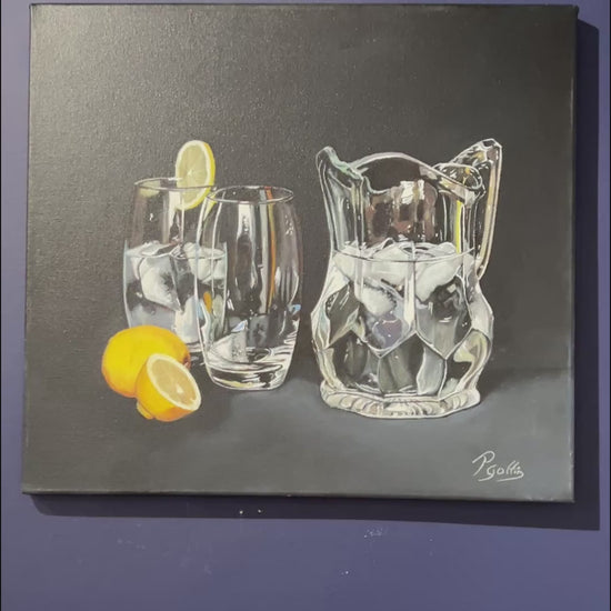 A meticulous still-life where the purity of crystal meets the zesty brightness of fresh lemon. Two glasses, one adorned with a delicate slice, and a faceted jug brim with glistening ice, their surfaces catching the light in a dance of silvery reflections. The cut fruit rests casually beside, its golden rind and pale flesh offering a tangy counterpoint to the cool clarity of the glassware. Set against a deep, velvety backdrop, each highlight and shadow has been rendered with near-photographic precision, making this piece as refreshing to the eye as its subject would be to the palate.
