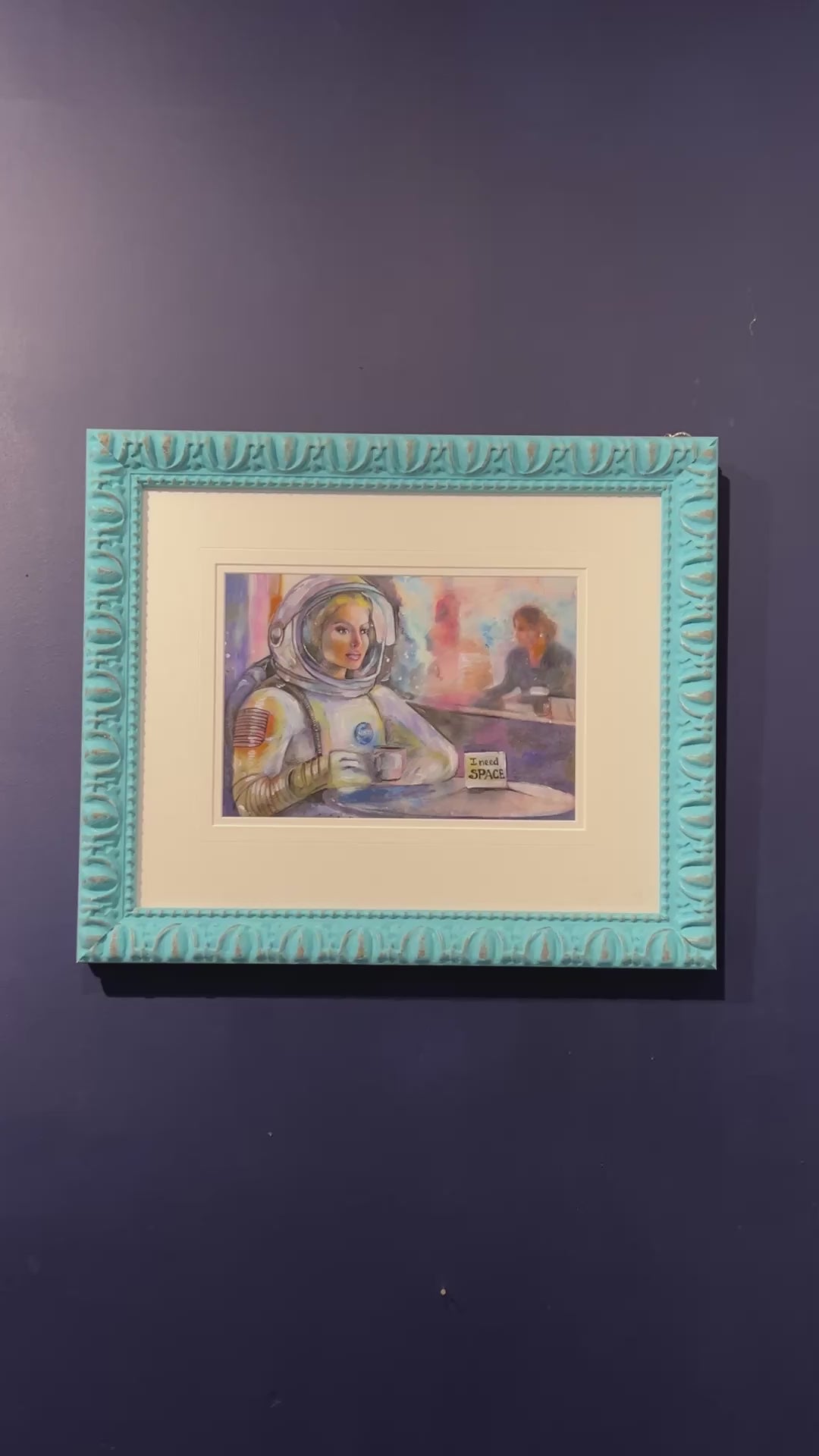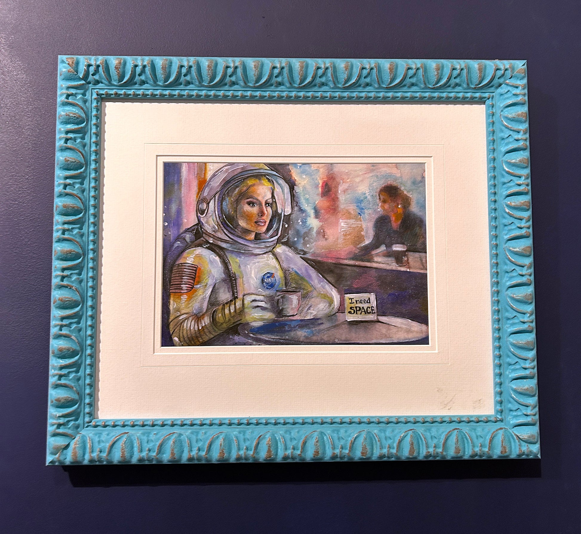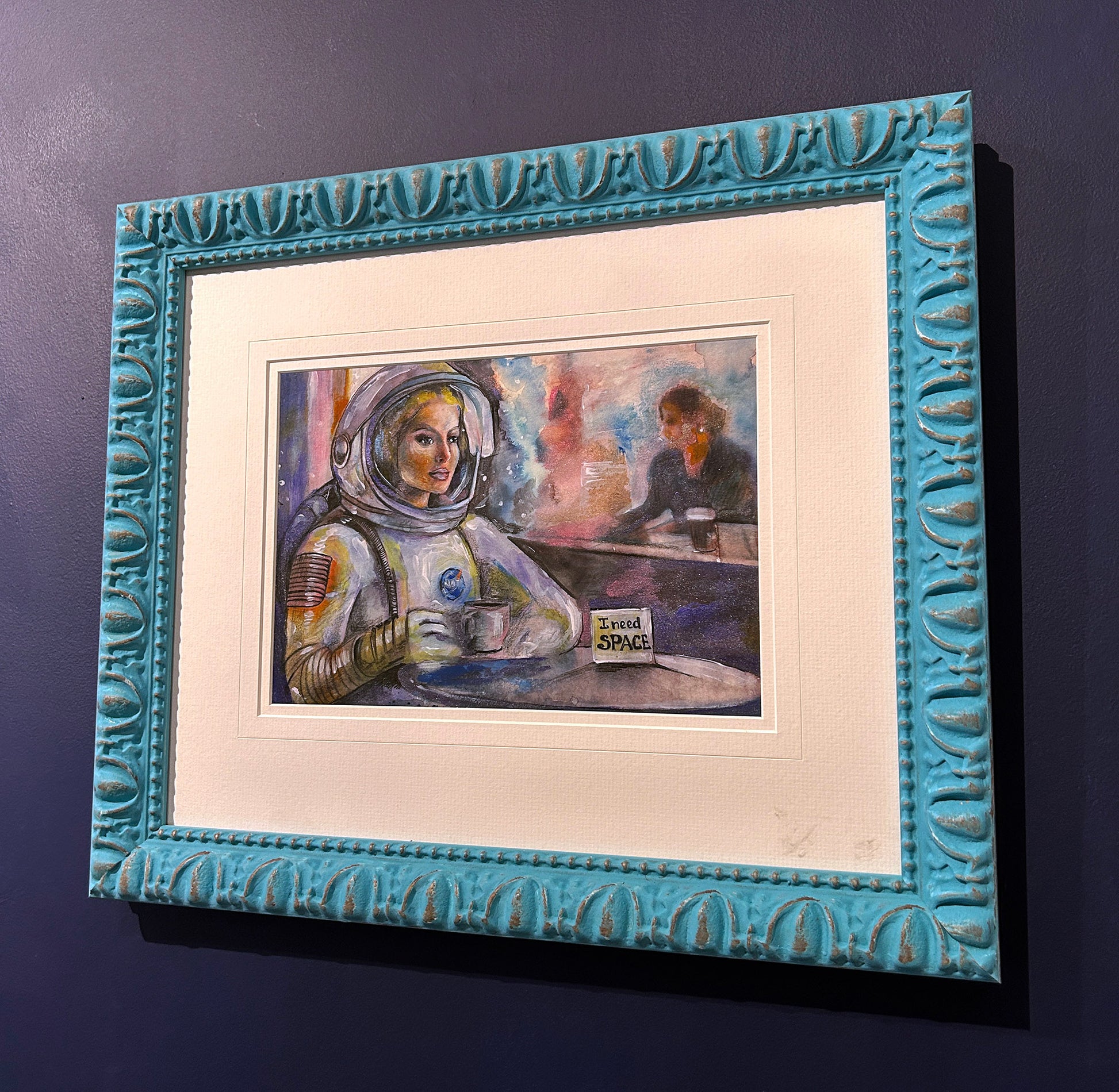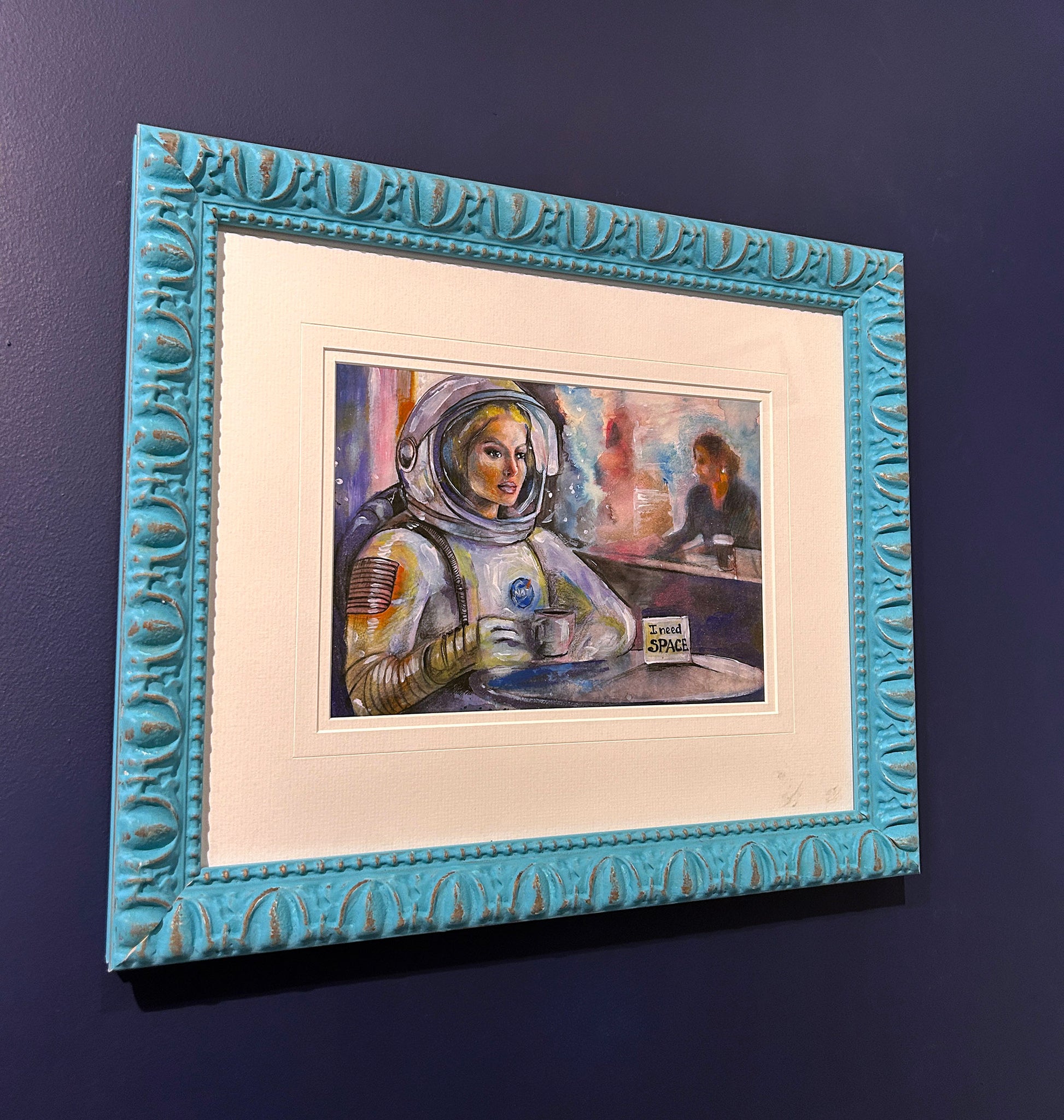 A playful yet contemplative portrait, this work imagines a poised astronaut taking a quiet moment in a café, her helmet still framing her face as she cradles a warm cup. The juxtaposition of the NASA patch, the cosmic backdrop, and the cheeky “I need SPACE” sign invites both a smile and a pause for thought. The palette dances between muted café tones and vivid galactic swirls, as though Earth and the universe have met over coffee. Framed in a lively turquoise moulding with decorative relief, it radiates personality and charm — a light-hearted reminder that even explorers of the stars need a moment to themselves.