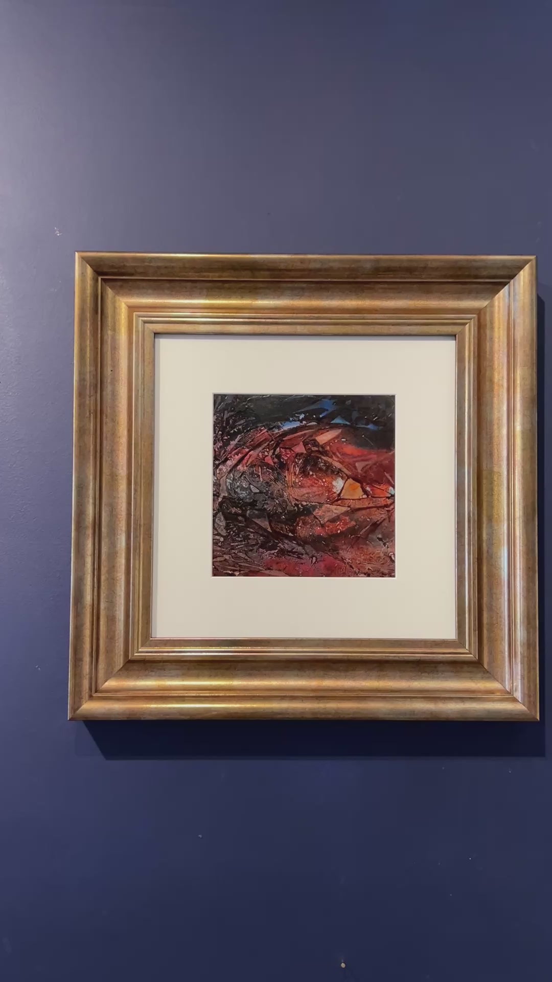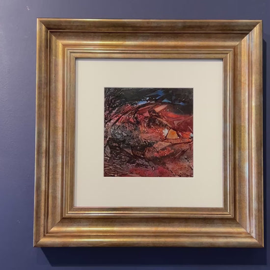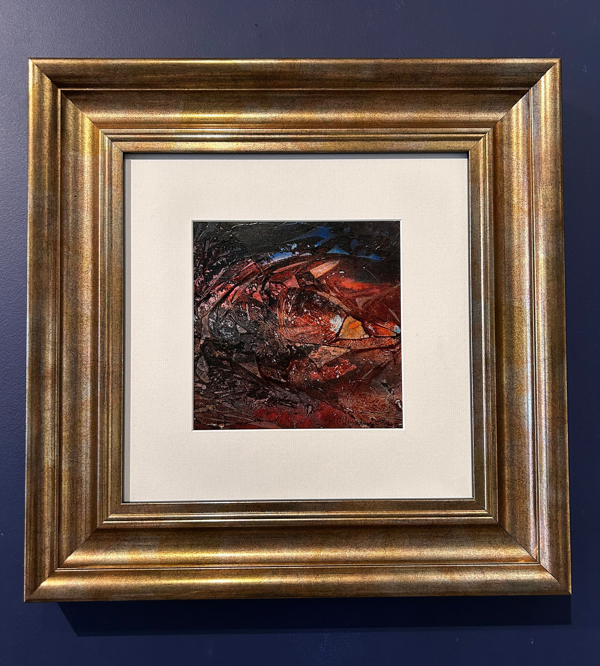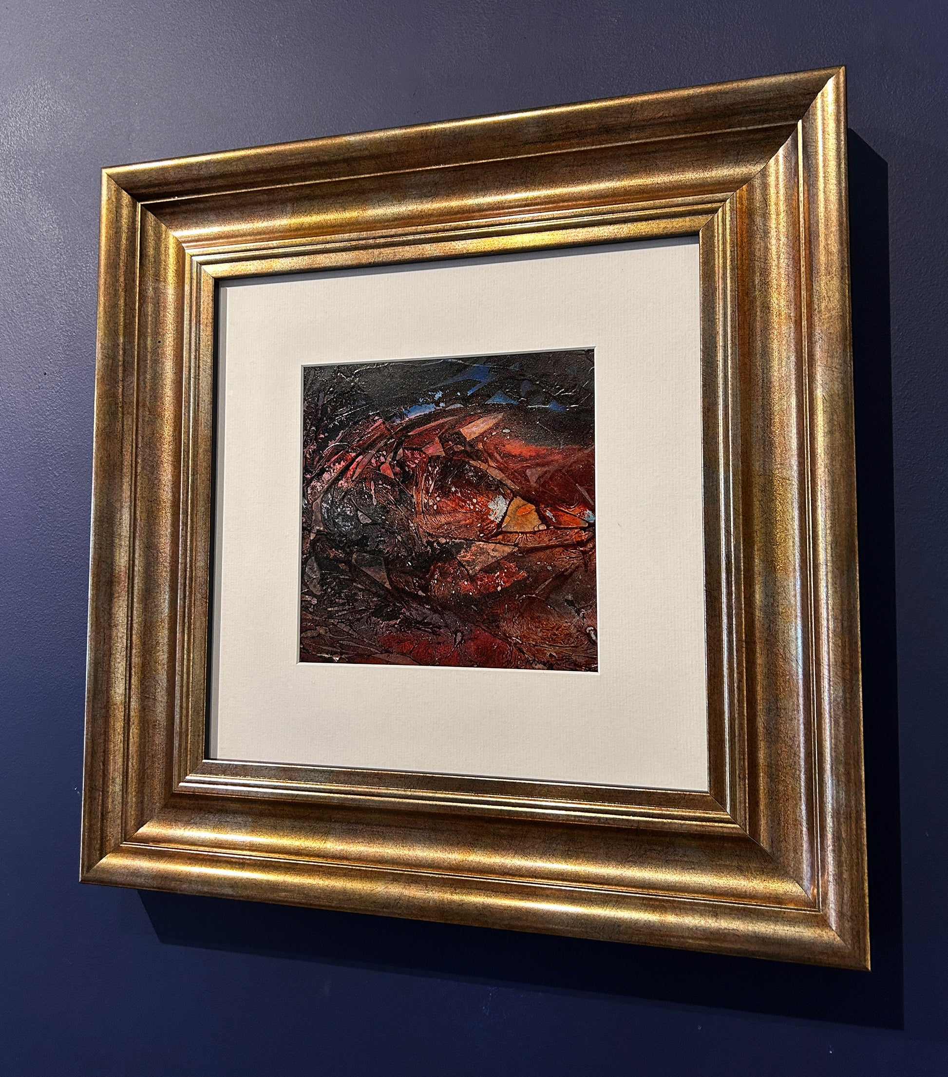 A brooding, richly textured composition where molten crimsons and deep umbers surge together, fractured by glints of ochre and flecks of midnight blue. The surface appears almost volcanic, with ridges and fissures that catch the light like cooling lava. A bold gilt frame enhances the heat and depth of the palette, giving the impression of a landscape caught between dusk and fire. It is both dramatic and immersive — a glimpse into a world where the earth itself seems to burn with quiet intensity.