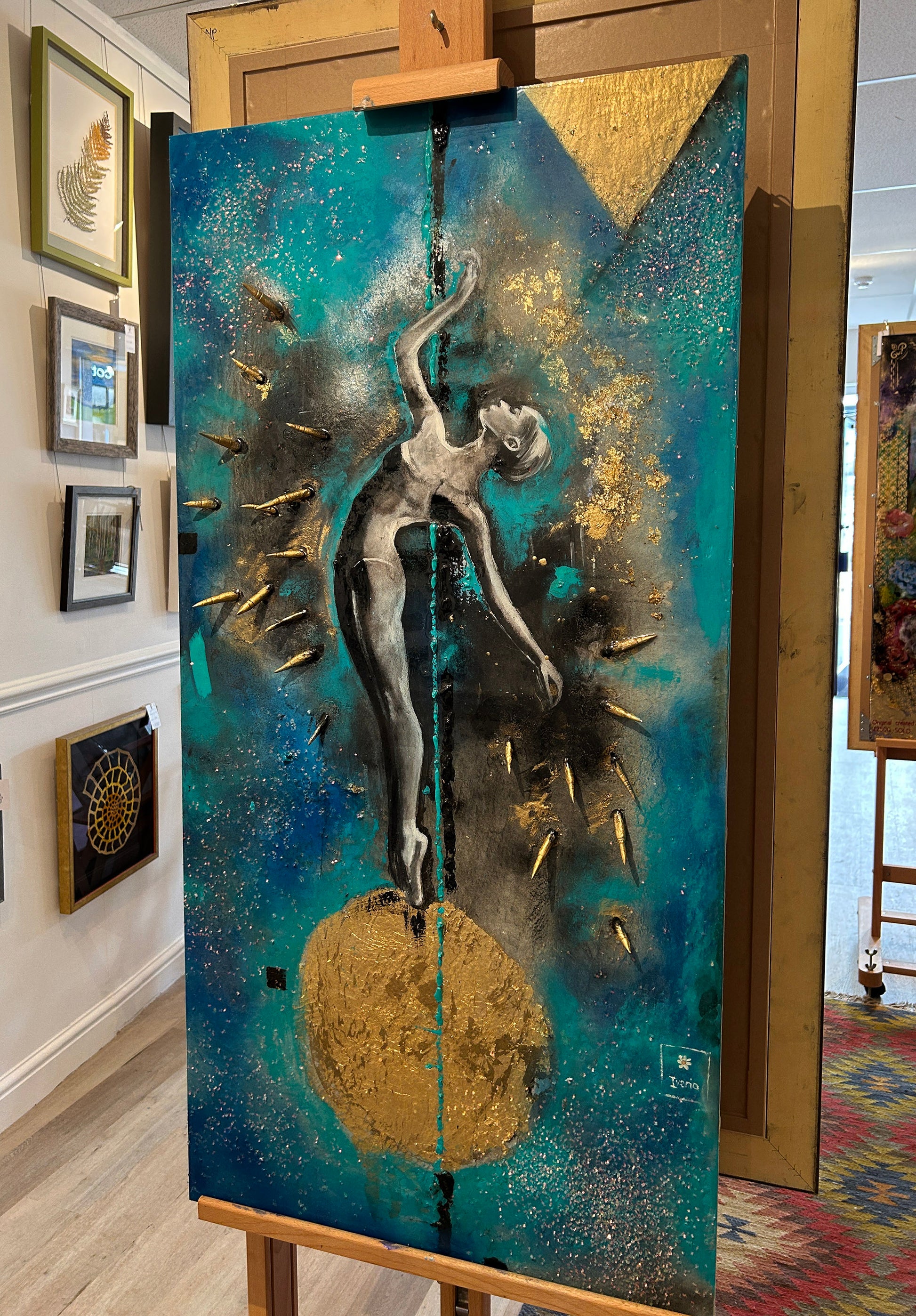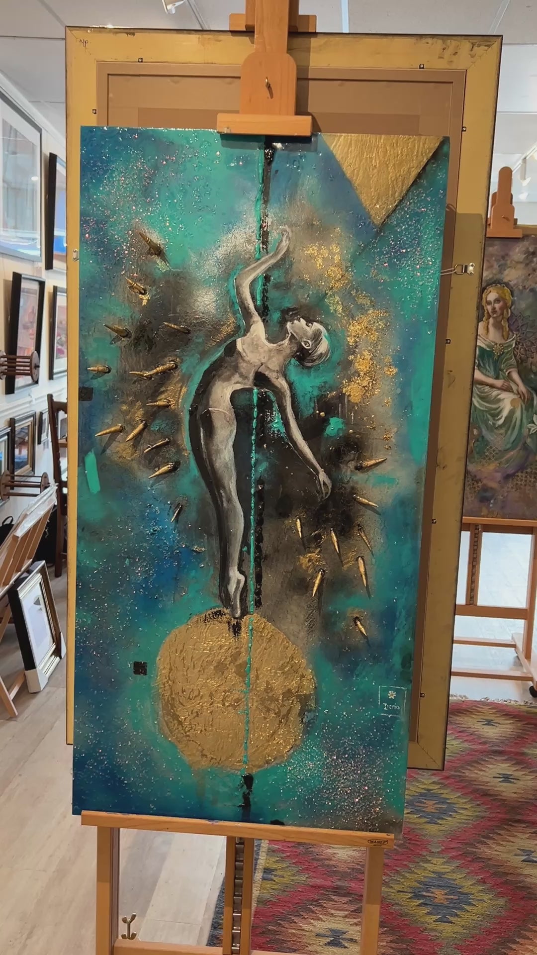 In this powerful and haunting composition, a lone dancer rises in graceful defiance, her body suspended between shadow and light. The shimmering turquoise backdrop, flecked with cosmic sparkles, suggests an otherworldly stage, while gilded fragments scatter like fragments of hope or danger. A sphere of molten gold anchors the figure, its brilliance contrasting against the surrounding darkness. The dancer’s posture, poised yet reaching, evokes a moment of fragile triumph — a testament to the human spirit’s refusal to bow, even in the path of countless perils. This is ballet reimagined as survival, and survival rendered as art.