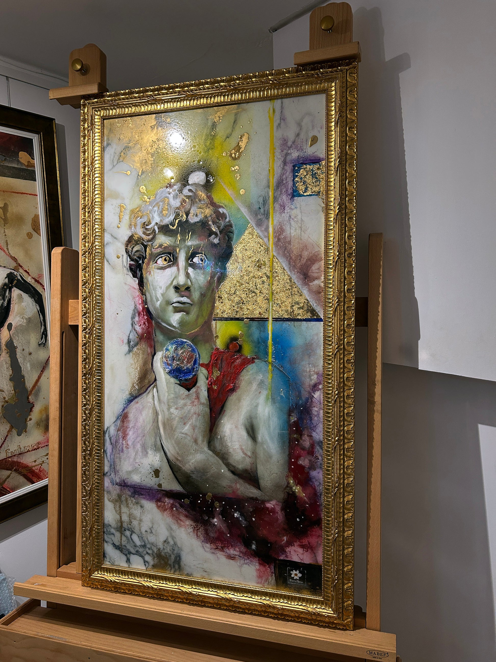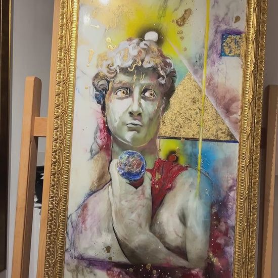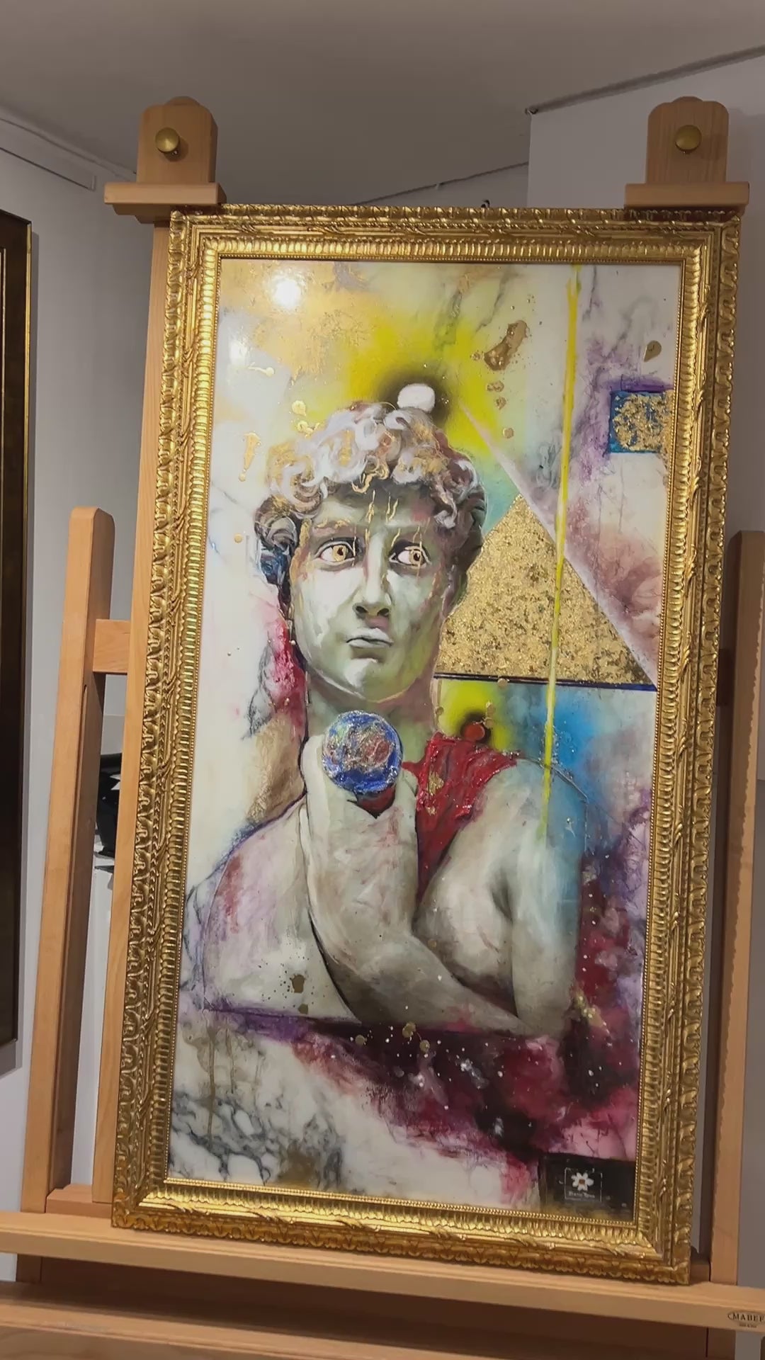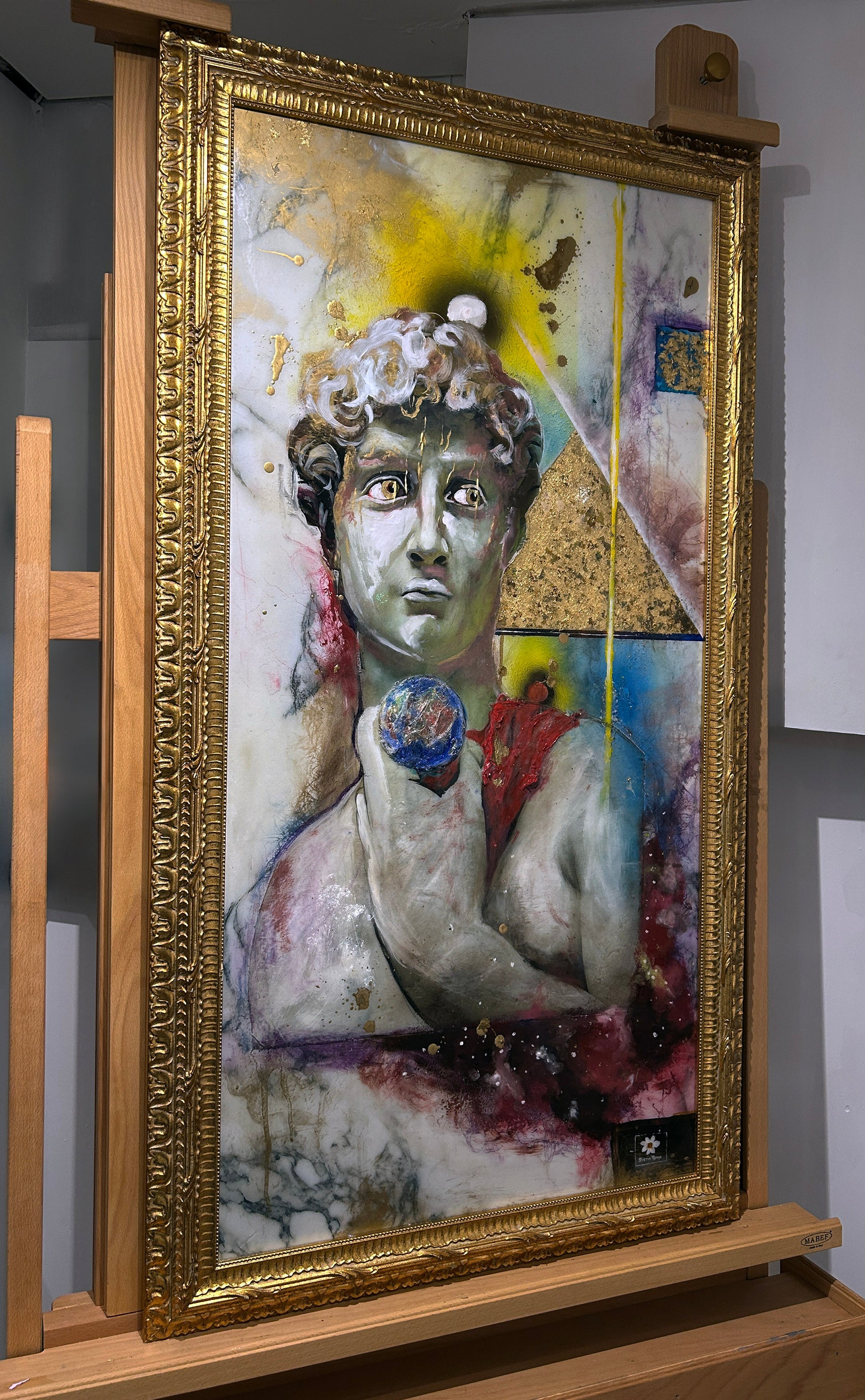 This striking contemporary interpretation of Michelangelo’s David reimagines the Renaissance icon with a dreamlike, almost celestial presence. The marble-pale figure is bathed in veils of gold leaf and splashes of vivid pigment — scarlet, cobalt, and sunlit yellow — creating an interplay between classical restraint and modern abstraction. In his hand, the globe shimmers like a fragile planet, suspended in a universe of fractured colour and cosmic dust. A lavishly carved gilt frame echoes the work’s opulence, while the marbled backdrop and bold geometric forms hint at timelessness disrupted. The effect is both reverent and subversive — an homage to the past, refracted through the restless lens of the present.