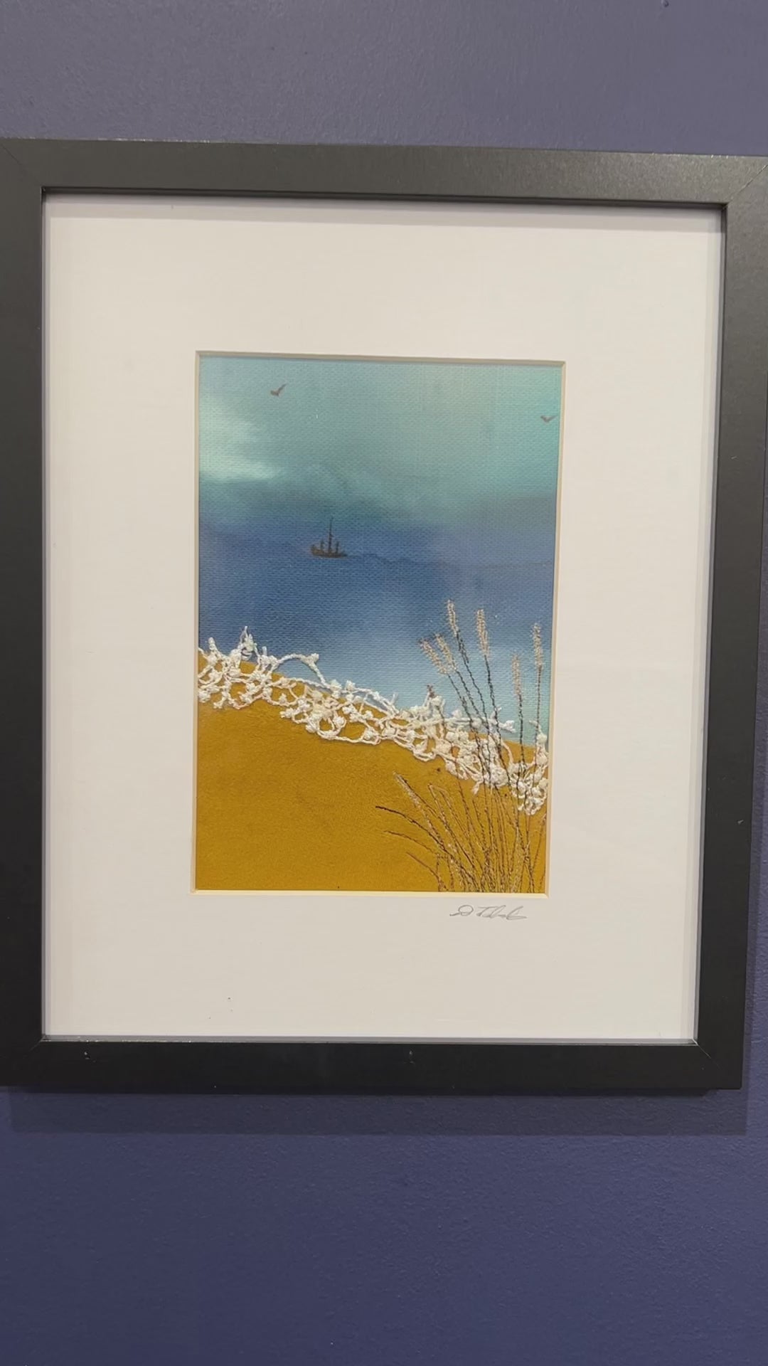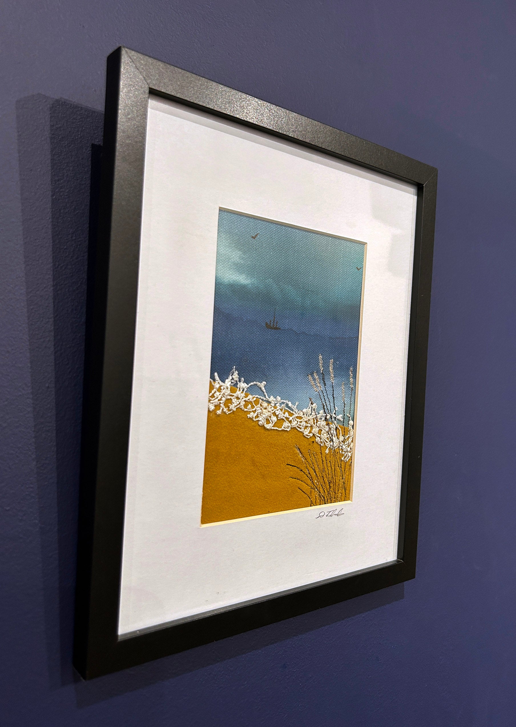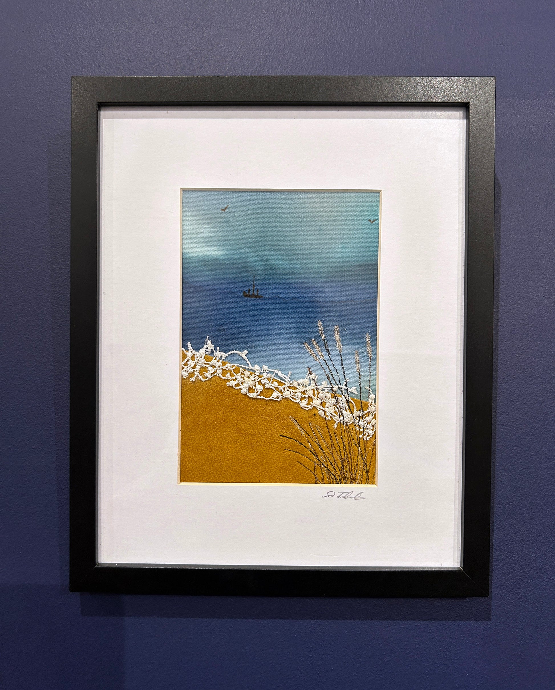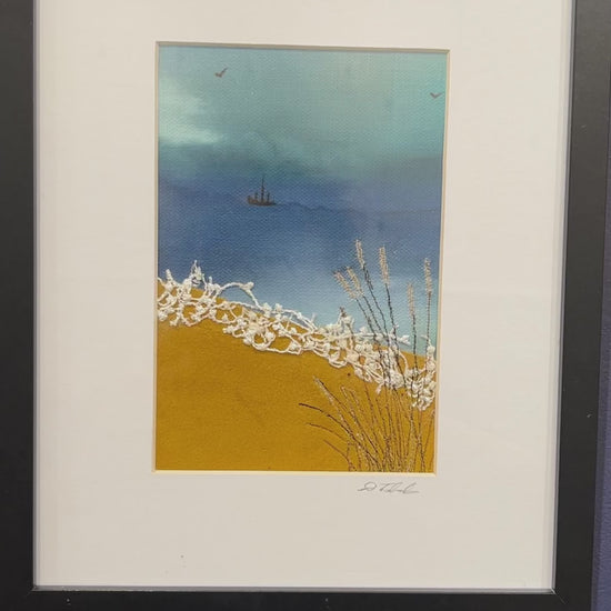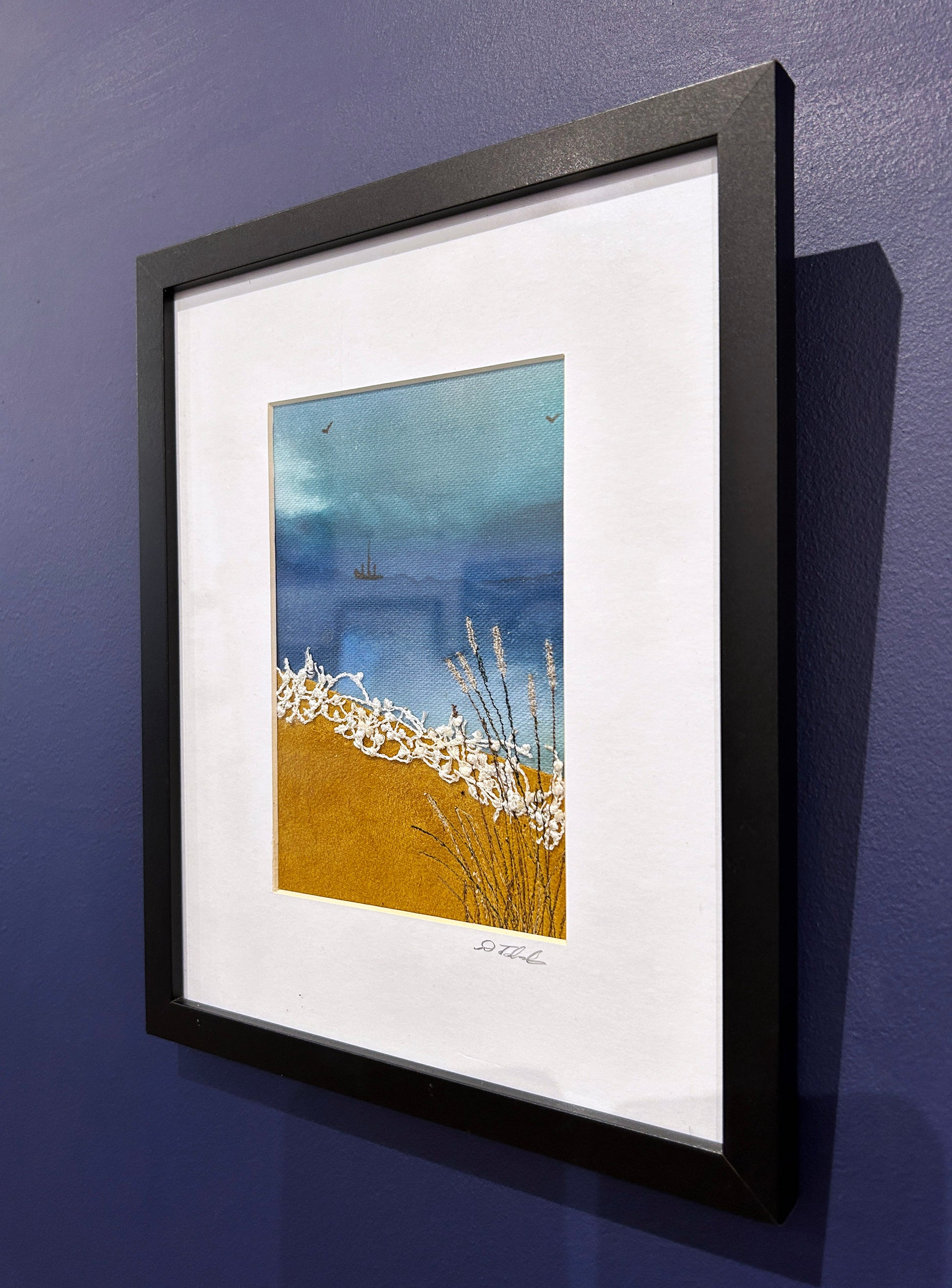 This contemplative coastal scene evokes the quiet stillness of a windswept shoreline. A vivid contrast of deep azure sea and golden ochre sand draws the eye toward the centre, where delicate embroidery-like white threads break the edge like gentle foam. Fine stalks of seagrass bend towards the breeze, their softness echoed by the subtle texture of the surrounding fabric. In the distance, a solitary ship sails toward the horizon under a brooding sky, accompanied by birds in graceful flight. The clean mount and minimal black frame enhance the piece’s atmosphere of serenity and space – a gentle homage to solitude, open waters, and the timeless rhythm of the tides.