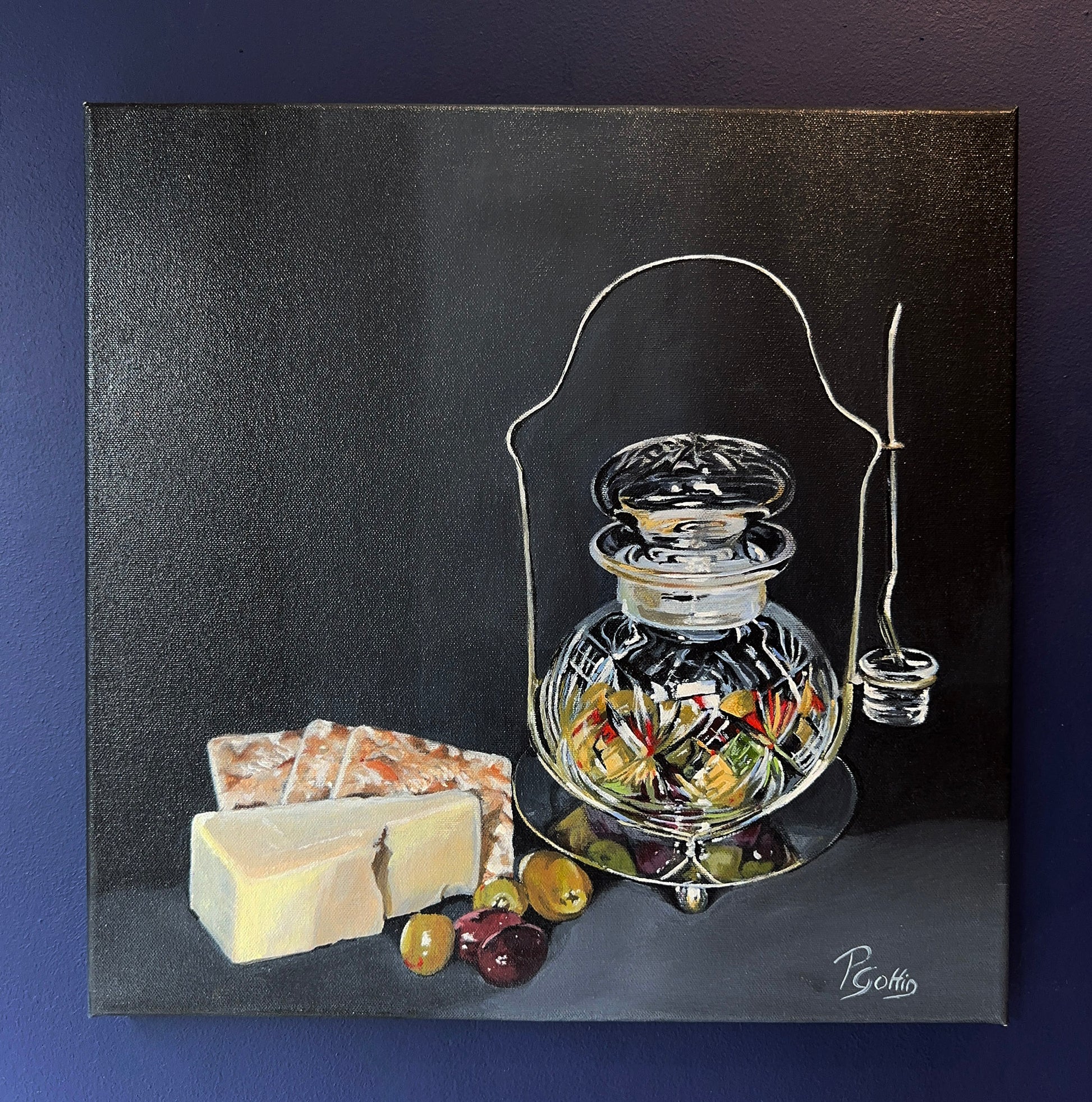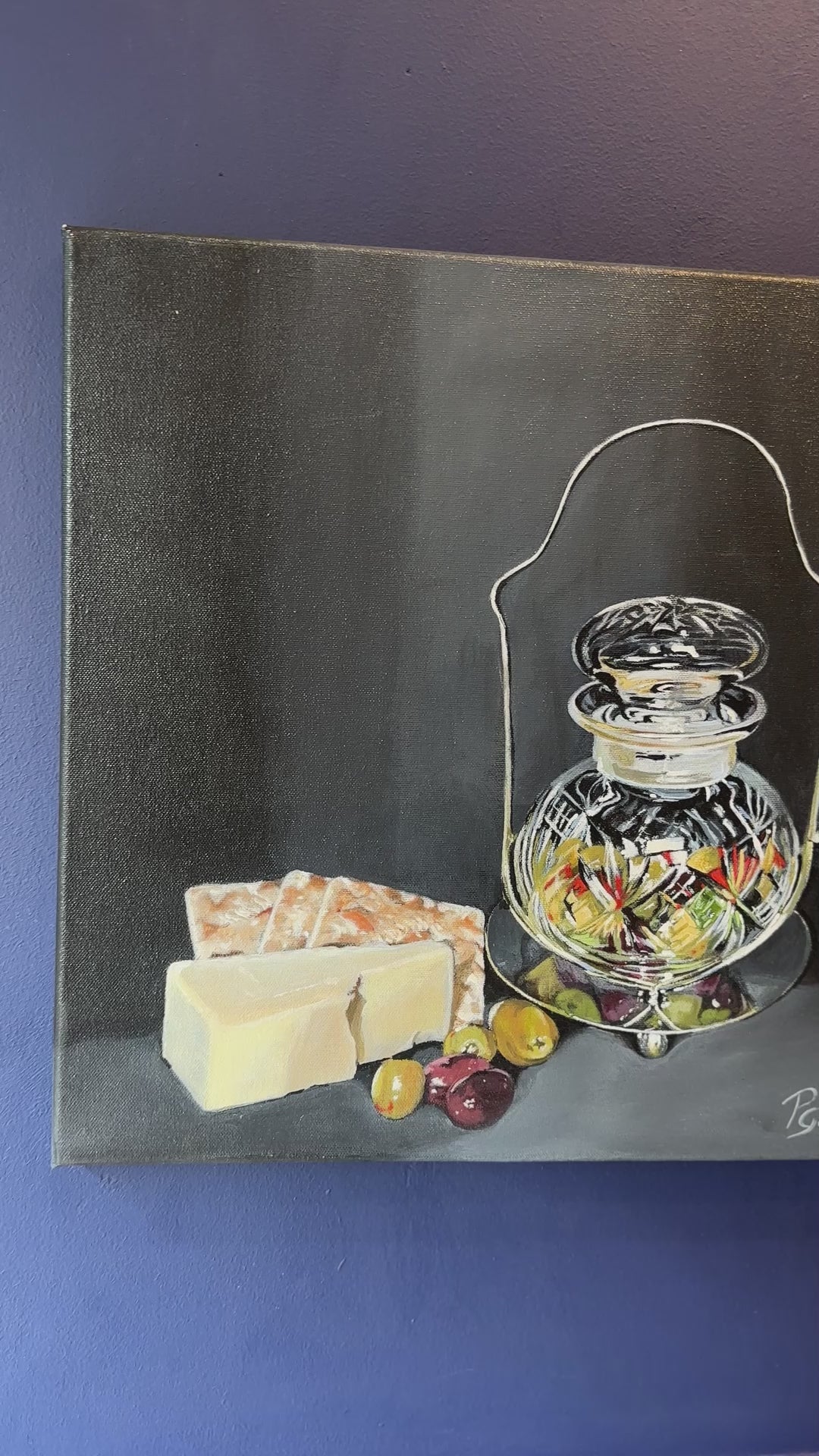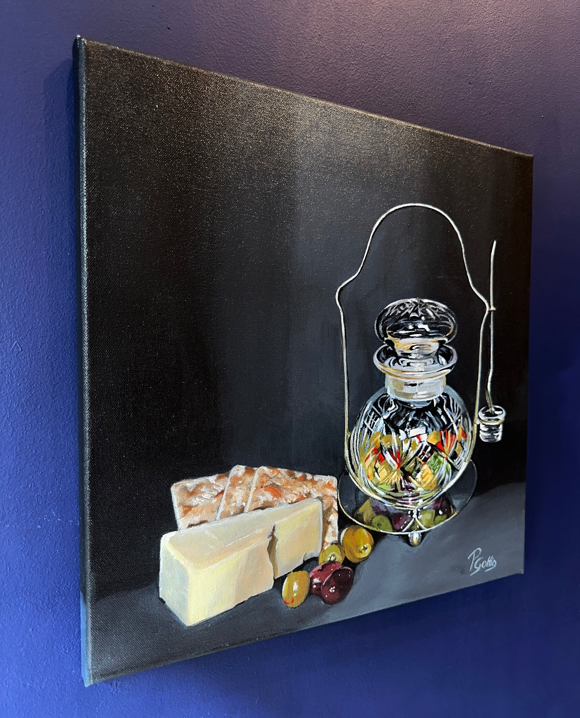 This meticulous still life captures an evening of quiet indulgence with remarkable clarity and elegance. The rich textures of aged cheese, delicate crackers, and plump, glistening olives form an irresistible trio of flavours, rendered with such detail that they seem almost tangible. The composition centres around an exquisite glass vessel, its intricate facets reflecting and refracting the soft, diffused light to produce an array of shimmering highlights. This interplay of transparency and reflection is masterfully portrayed, lending a palpable depth to the scene. The dark, velvety backdrop enhances the luminosity of each object, inviting contemplation and suggesting the gentle intimacy of a shared repast. An ode to simple pleasures, this painting warmly reminds us of relaxed gatherings, hushed conversations, and the timeless appeal of life's finer details, even as evening softly descends.
