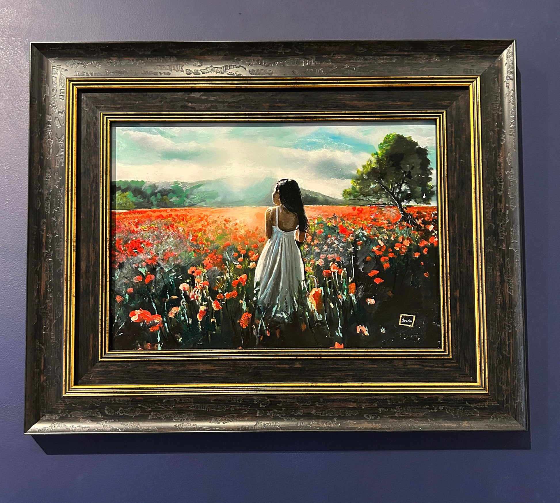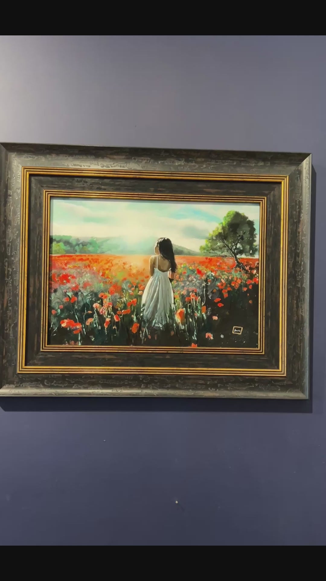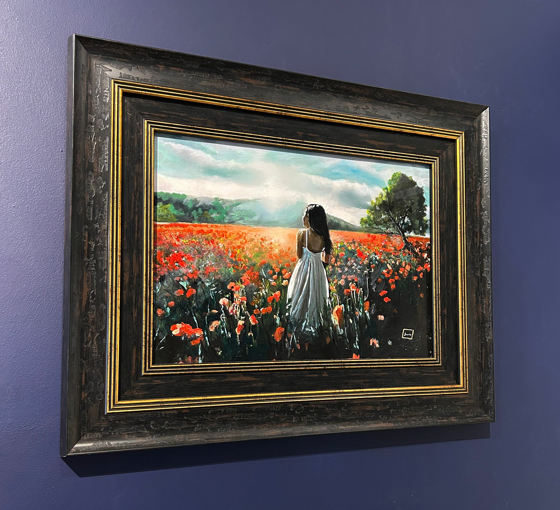 Bathed in the gentle glow of afternoon light, a lone figure stands amidst a sea of poppies, their vermilion heads swaying softly in the summer breeze. Her white dress catches the sun, falling in languid folds that echo the undulations of the meadow. Beyond, a solitary tree leans into the horizon, its foliage a deep emerald contrast to the vivid scarlet bloom. The distant hills dissolve into a haze of mist and light, lending the scene a dreamlike quality. This is a moment suspended — both fleeting and eternal — a quiet communion between woman, earth, and sky, where memory lingers in every petal.