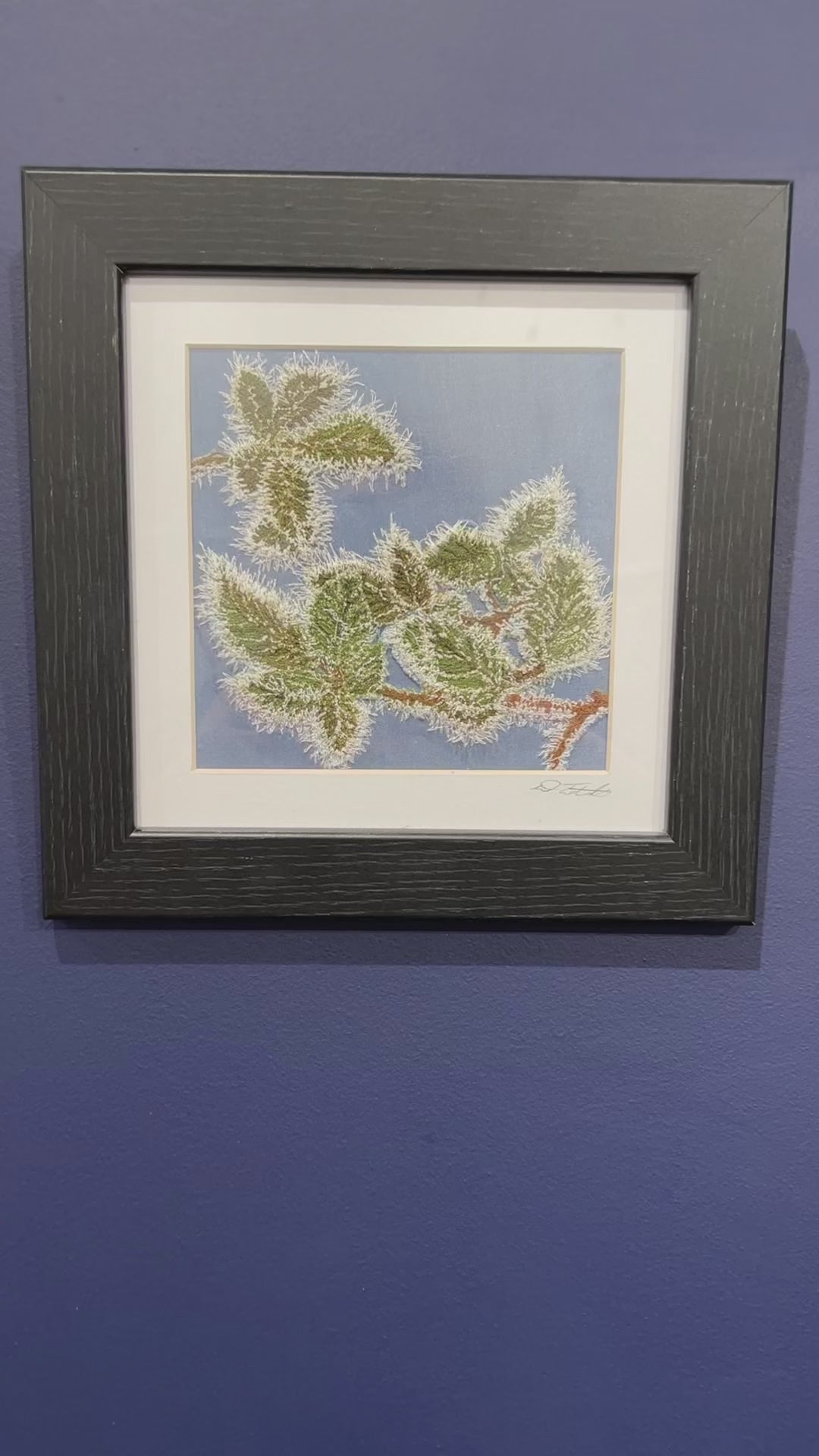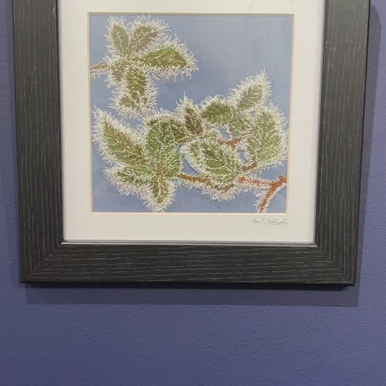 Delicately edged with crystalline frost, each bramble leaf appears as though dusted with fine lace spun from winter’s own breath. The cool blue backdrop evokes the sharp clarity of a frosty morning, when the world lies hushed and still under the spell of ice. Subtle veins of green peek through the frozen tracery, a reminder of life’s persistence beneath winter’s grip. Encased within a sleek grey frame, the composition feels both botanical and ethereal – a moment of nature’s quiet artistry, captured before the thaw.