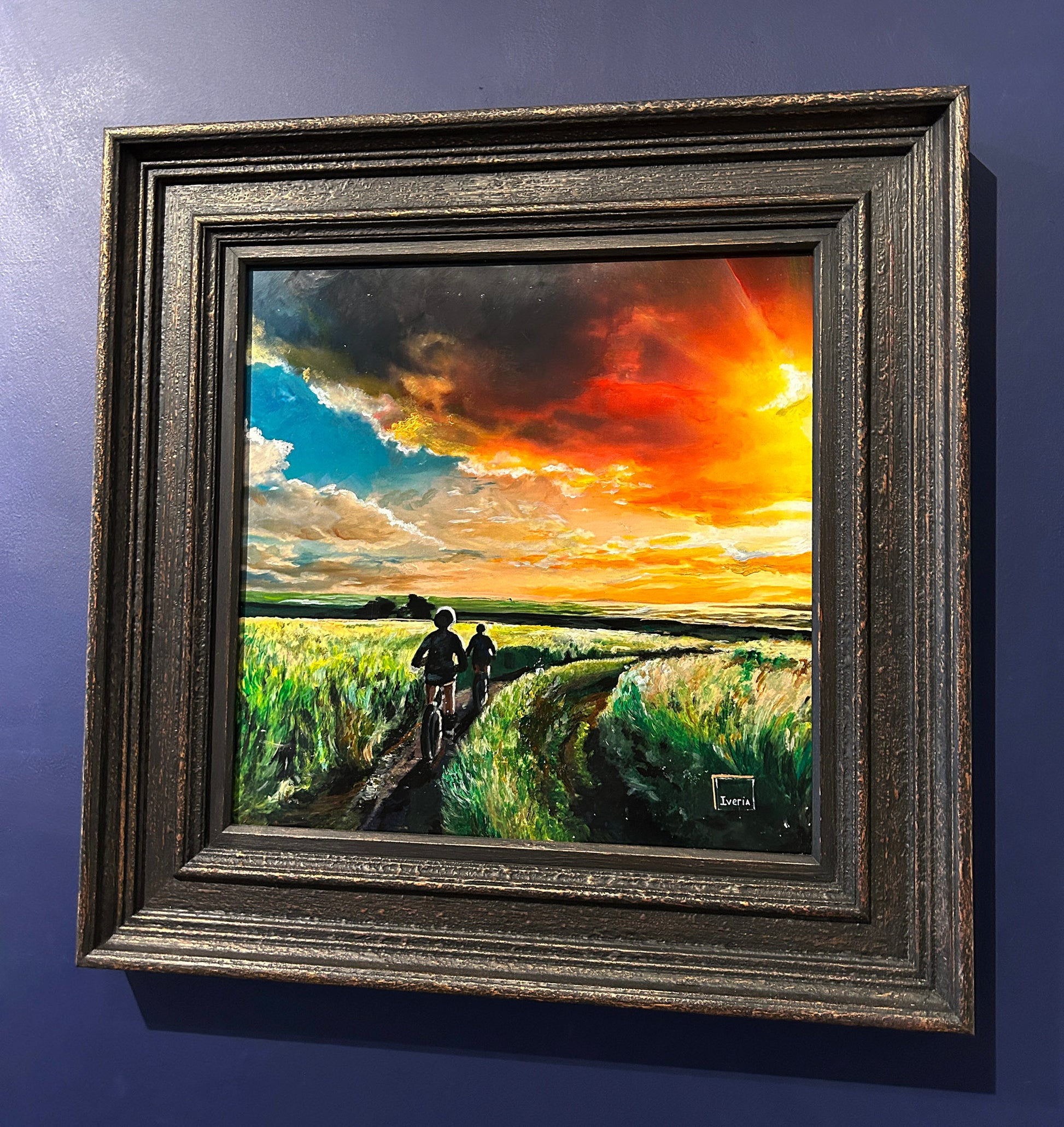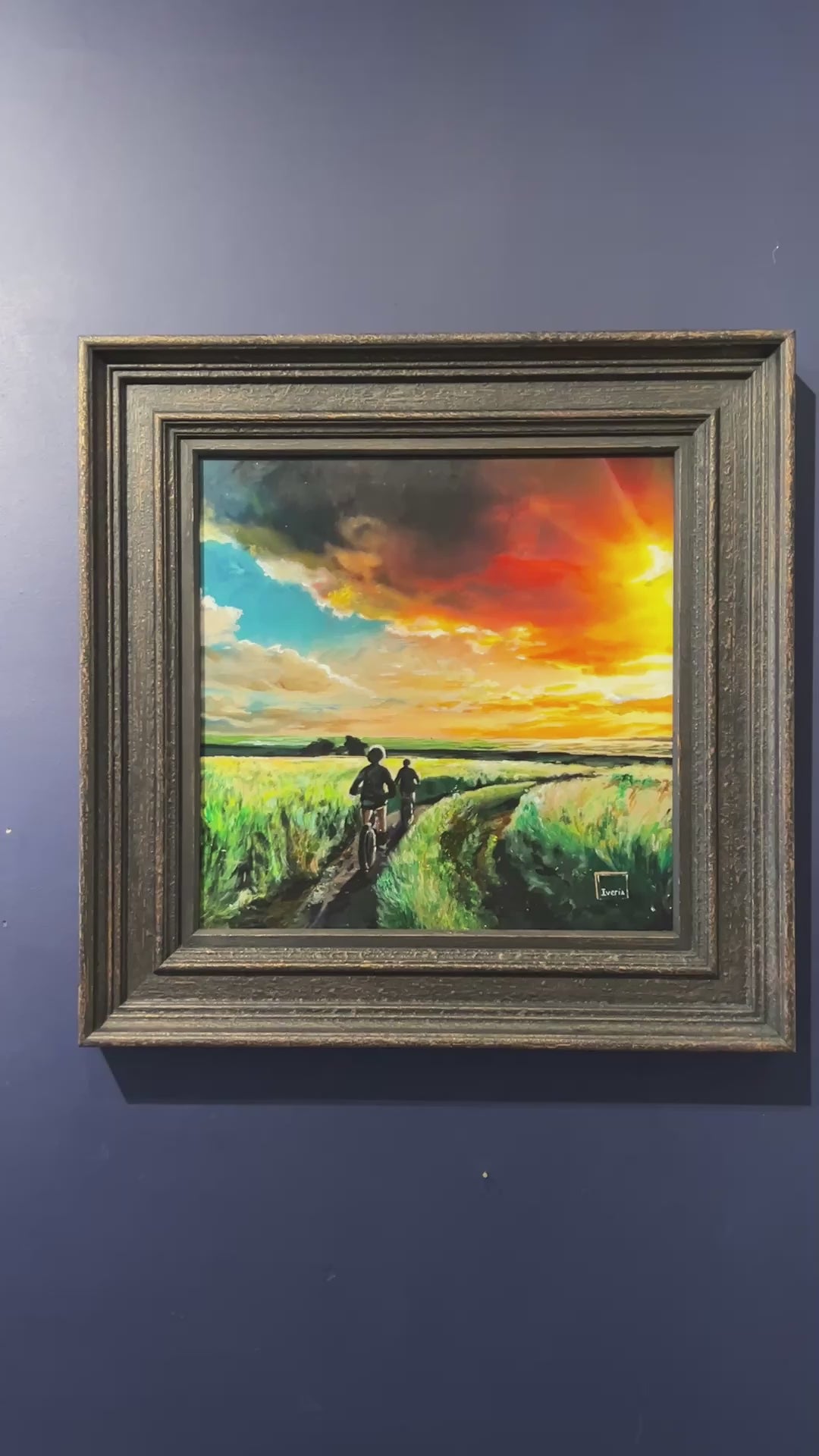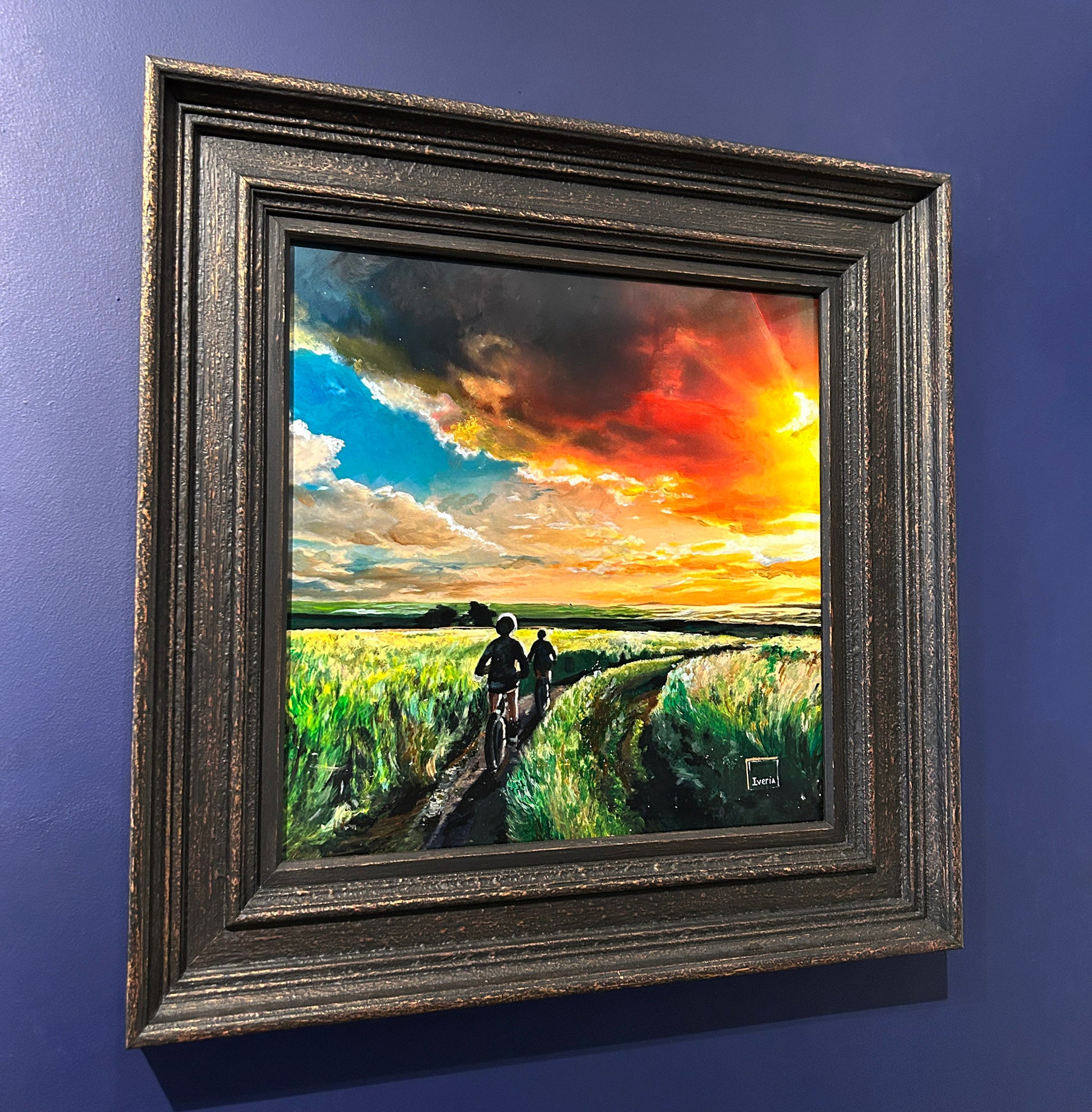 Bathed in the fading light of a summer’s eve, two cyclists trace a winding path through emerald fields, their silhouettes framed against a sky ablaze with molten gold and crimson. Billowing clouds drift from cool cerulean to warm amber, the shifting hues echoing the day’s quiet surrender to night. The textured brushwork of the meadow shimmers with movement, catching the last glints of sunlight as if the earth itself is exhaling in contentment. This is a portrait of return – of journeys taken, of companionship unspoken, and of that unhurried hour when the road bends gently towards home.