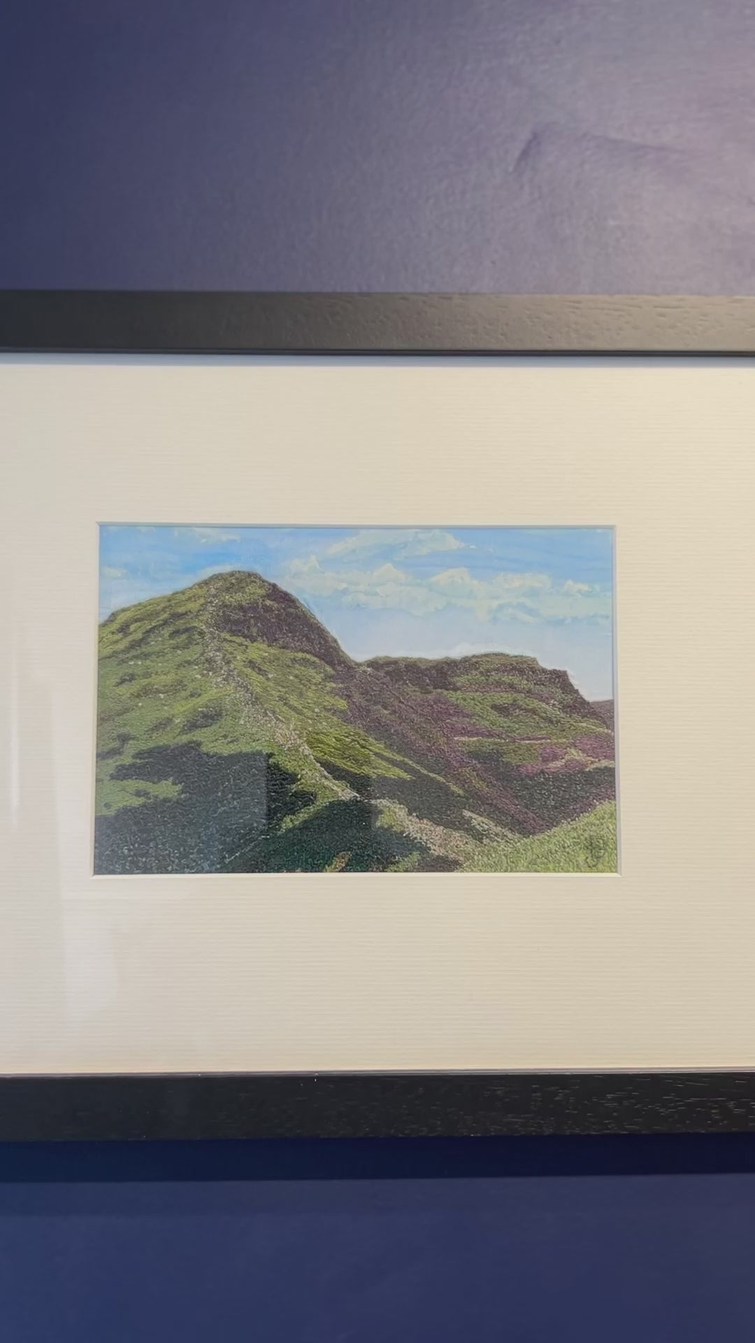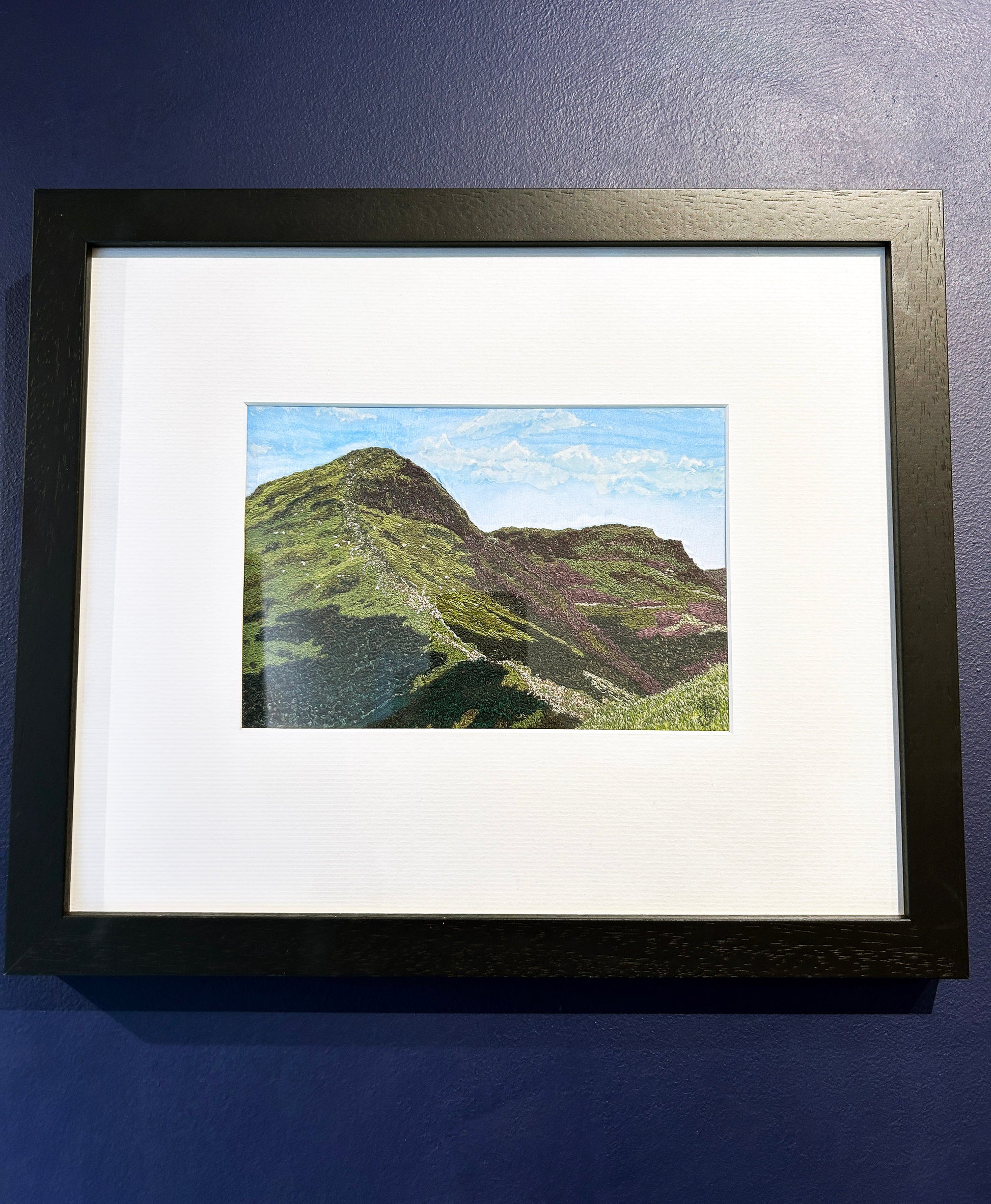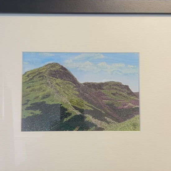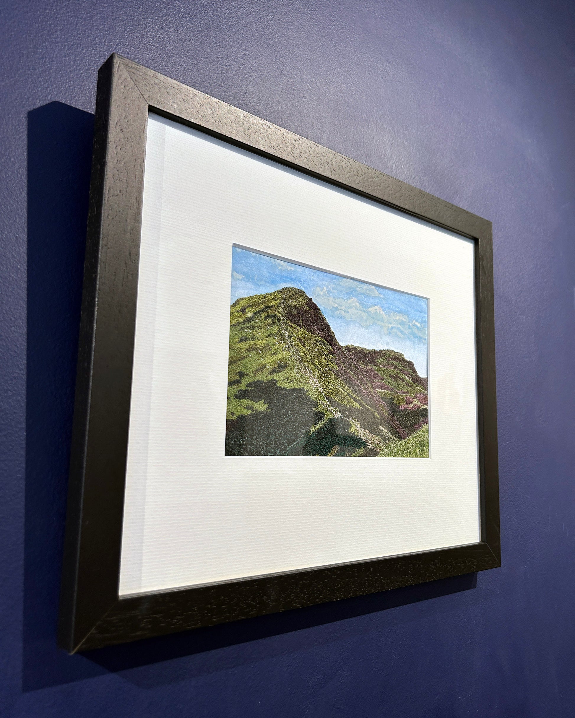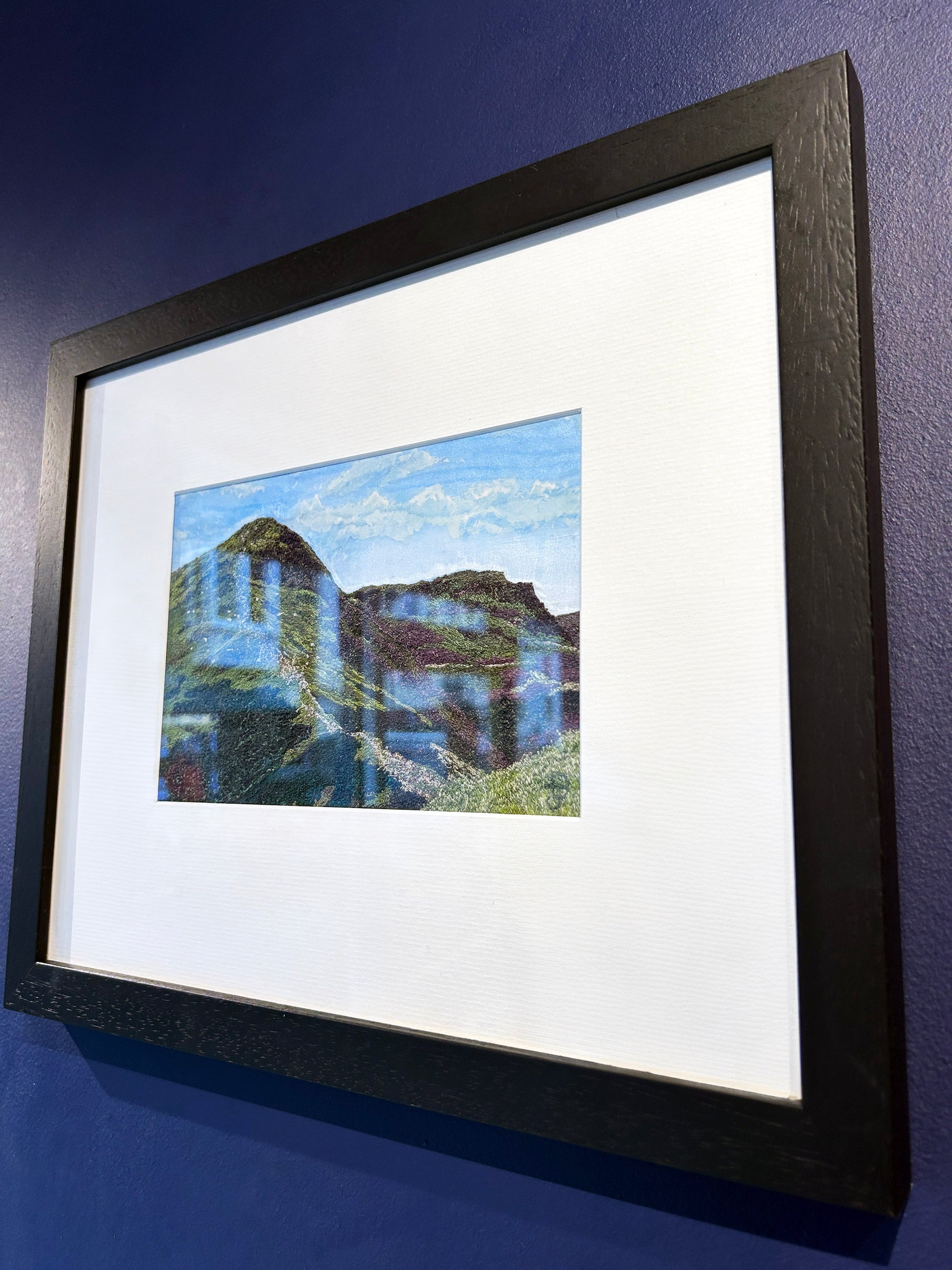 This striking depiction of rugged hills bathed in sunlight offers a moment of peaceful grandeur. Rich greens and deep earthy shades cascade across rocky slopes, textured and slightly lifted to capture the play of shadow and sun. Above, soft clouds drift across a serene sky, adding delicate contrast to the mountainous strength below. The crisp white surround highlights the landscape’s depth and scale, while a sleek, understated black frame grounds the scene in quiet elegance. Captivating yet calming, the piece invites contemplation of nature’s wild beauty, echoing the stillness and clarity found only in mountain air.