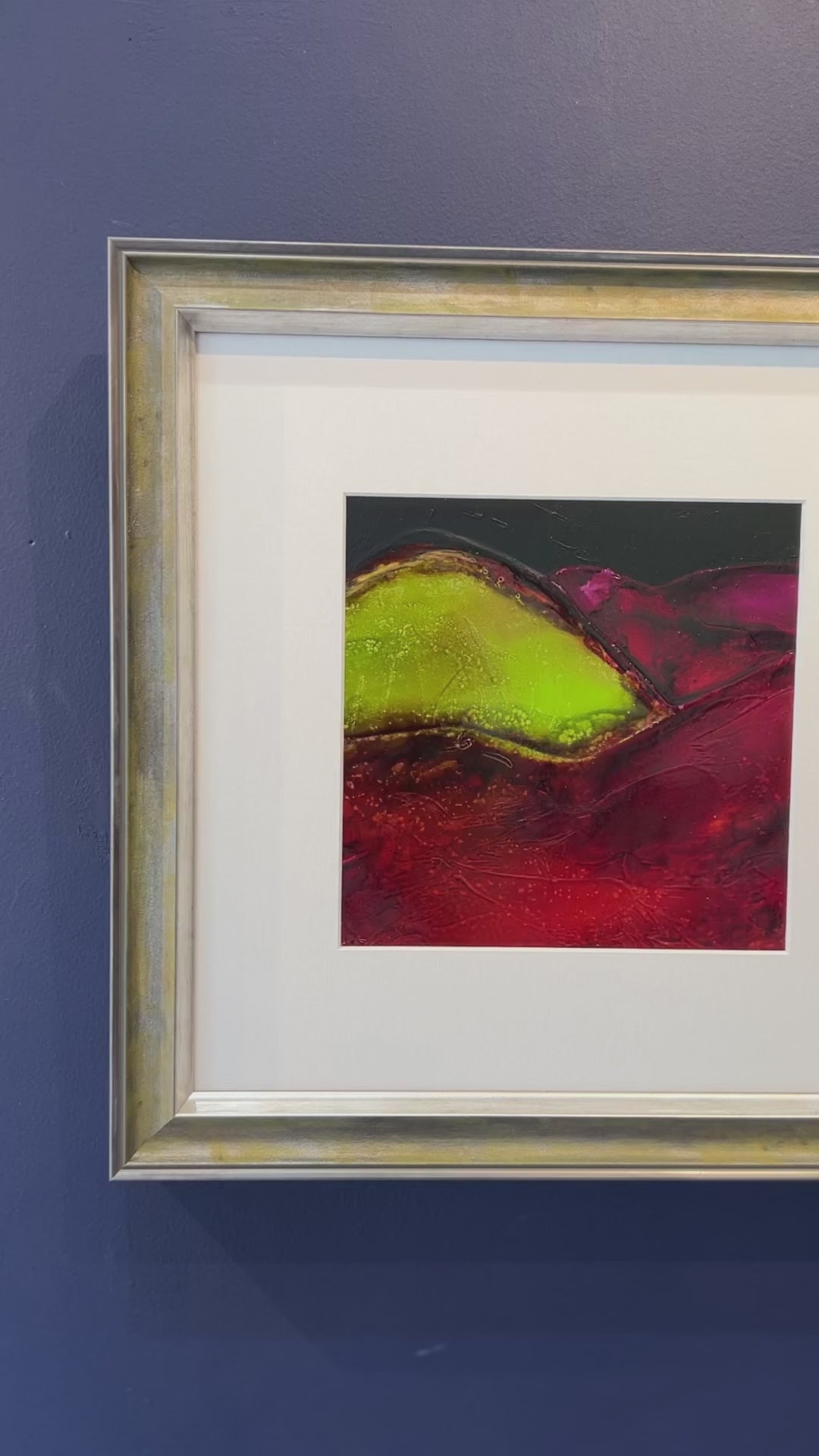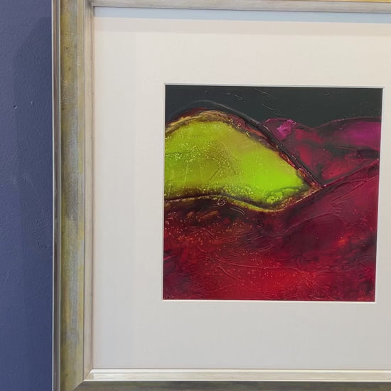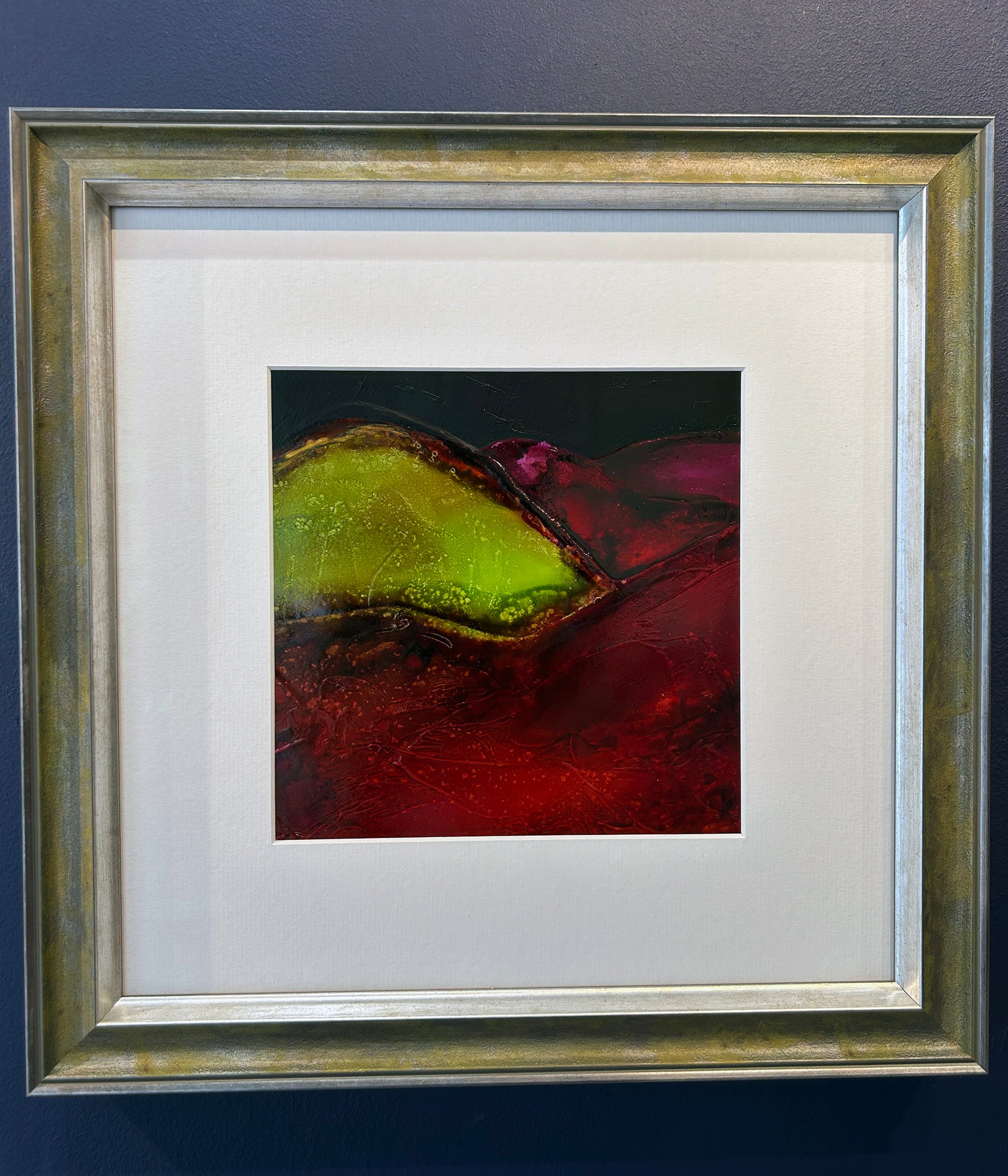 This vivid miniature pulses with intensity, where molten hues of vermilion and oxblood press upward against a glowing ridge of electrified lime-green. Textures ripple across the canvas like volcanic sediment, etched with gestures that shimmer beneath the surface. A darkened backdrop sharpens the drama, inviting the eye to travel along the ridgeline and settle into its glowing core. The silver-gilt frame offers a cool counterpoint, tempering the heat with quiet poise. Intimate yet powerful, this piece captures a fleeting moment of landscape as emotion – elemental, abstract, and alive.