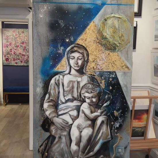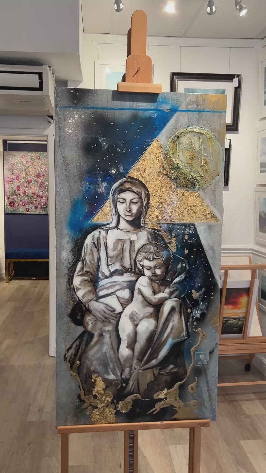 This celestial reimagining of the Madonna and Child fuses Renaissance reverence with contemporary abstraction. The figures, rendered in tender monochrome, exude both fragility and timeless grace, their sculptural folds illuminated against a cosmic backdrop. A triangle of radiant gold leaf crowns the composition, evoking both divine light and sacred geometry, while a textured celestial sphere hovers like a guardian planet. Splashes of midnight blue and constellations of fine white specks draw the viewer into a dreamlike firmament, where the sacred meets the infinite. Both intimate and monumental, it is a meditation on love, creation, and the eternal embrace.