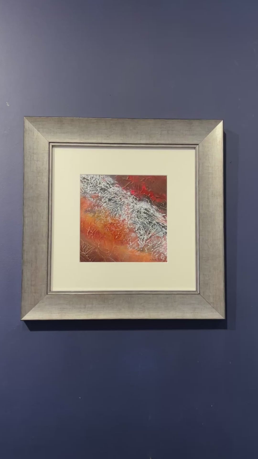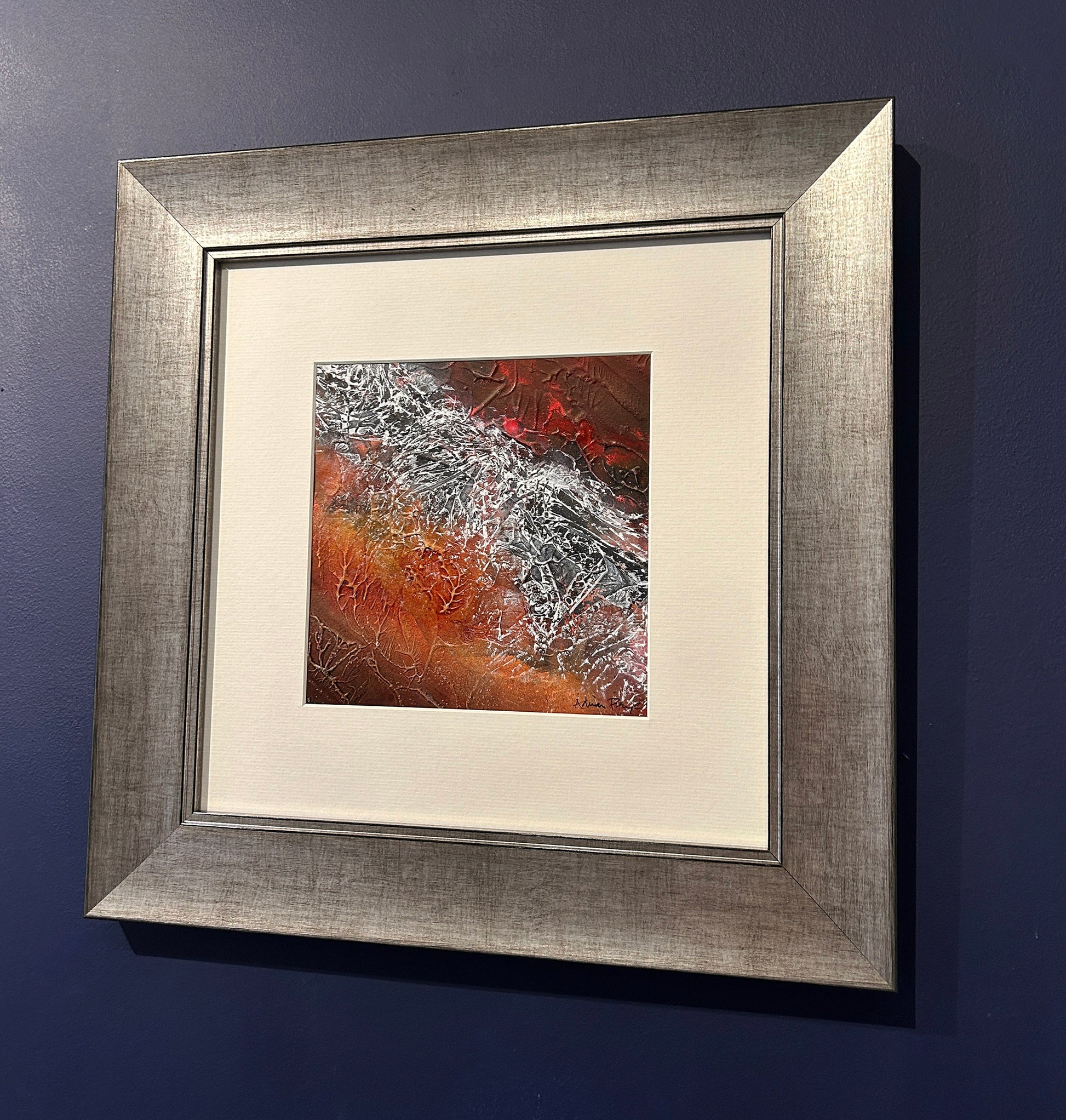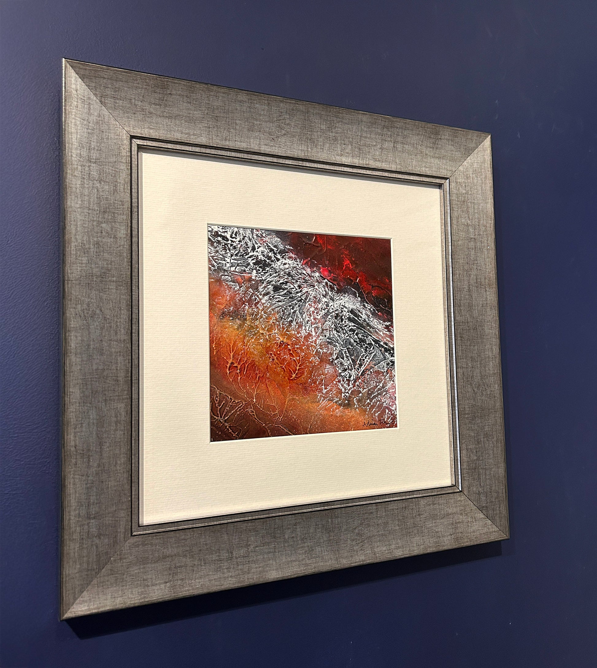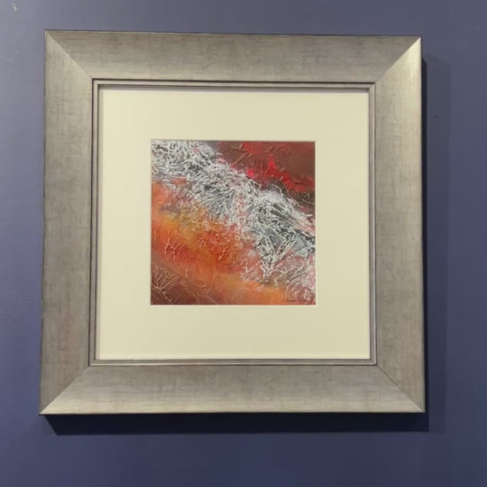 This striking work evokes the primal power of the earth’s crust in motion, with a jagged silver ridge cutting boldly through a searing expanse of molten orange and ember-red. The textured surface, alive with fine vein-like fissures, catches the light in unexpected glints, as if cooled metal still bore the heat of its creation. A pale, wide mount lends breathing space to the intensity within, while the brushed silver frame reflects the painting’s metallic sheen, enhancing its molten, volcanic energy. Both fierce and mesmerising, it is a reminder of the beauty and danger forged deep beneath our feet.