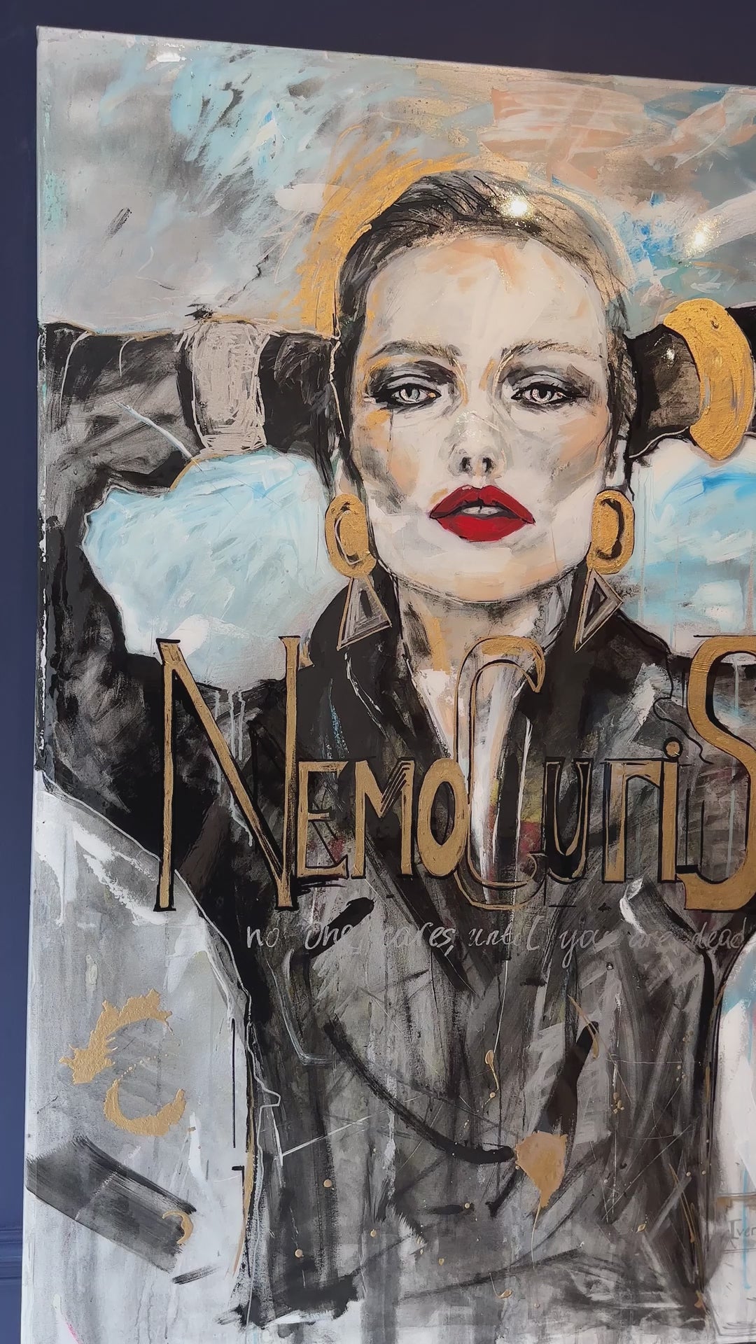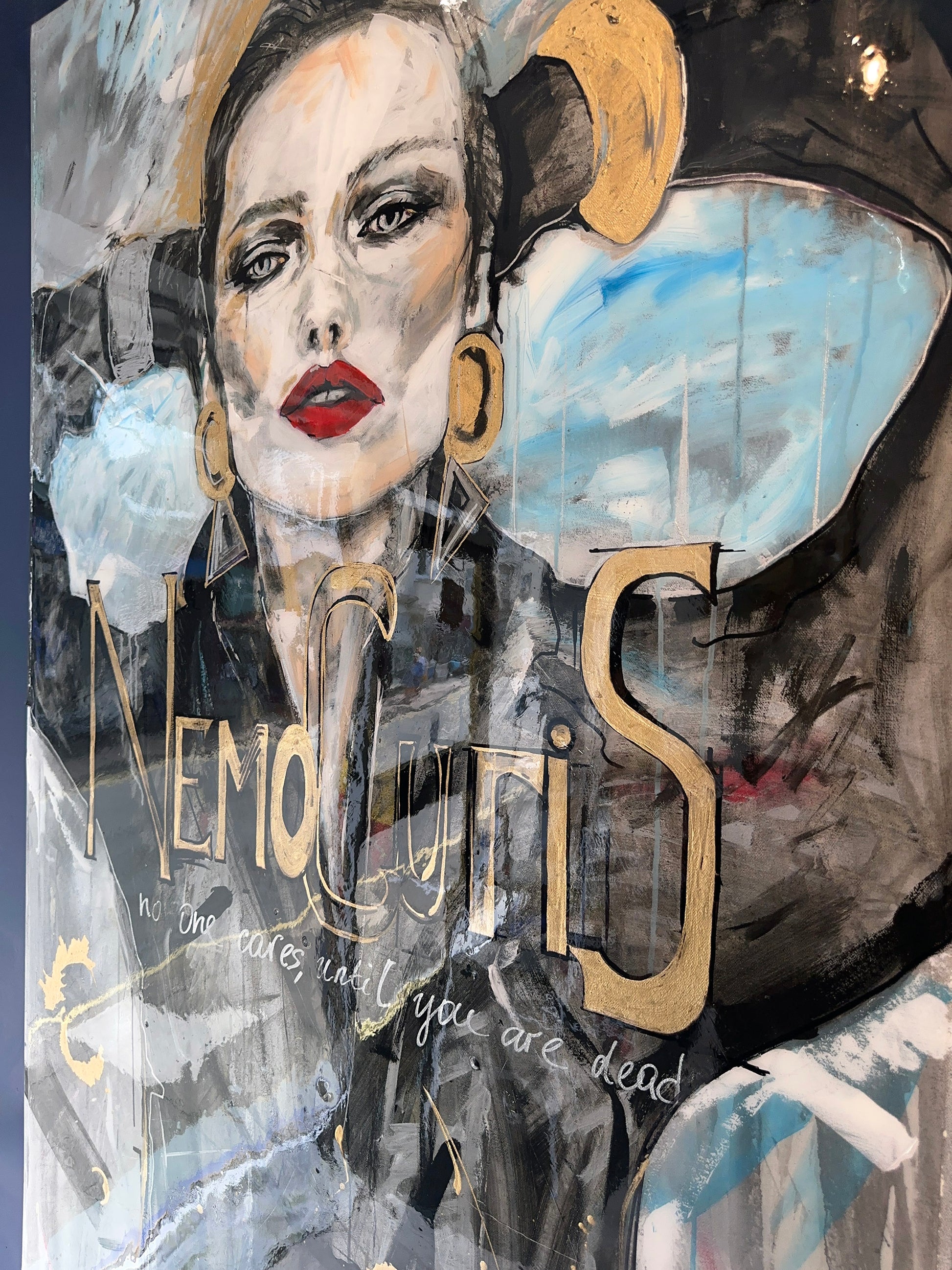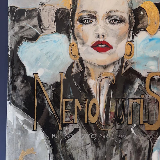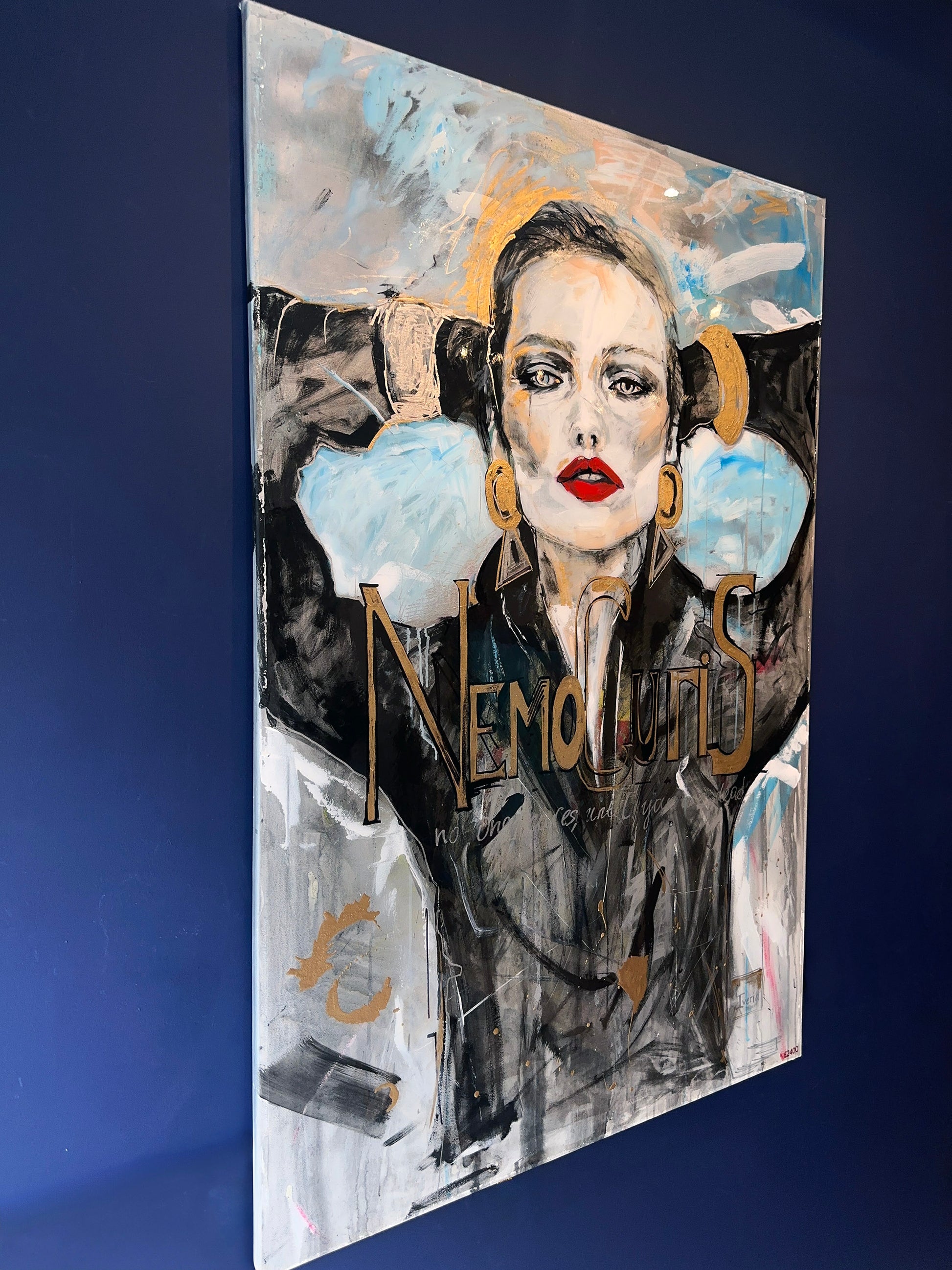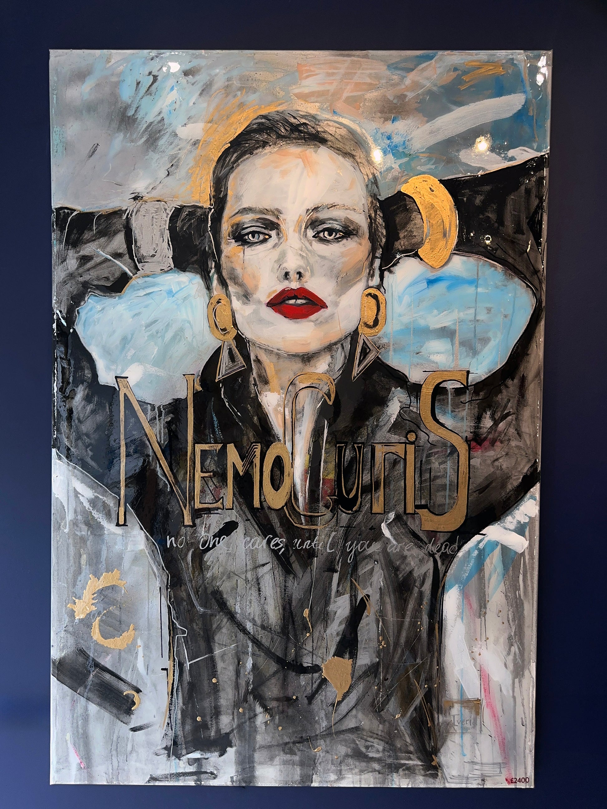 A magnetic portrait steeped in drama and defiance, Nemo Curis captures the steely gaze of a modern muse caught mid-thought. Her vermilion lips and sculptural gold jewellery blaze against charcoal shadows and strokes of electric blue, while flecks of gilding and cryptic text shimmer like half-remembered headlines. The bold inscription, “Nemo Curis” – no one cares – is both a challenge and a lament, anchoring this work in the tension between public image and private resolve. Glorious in its scale and stylised execution, the painting reads like fashion editorial turned manifesto – unapologetic, luminous, and arresting in every sense.