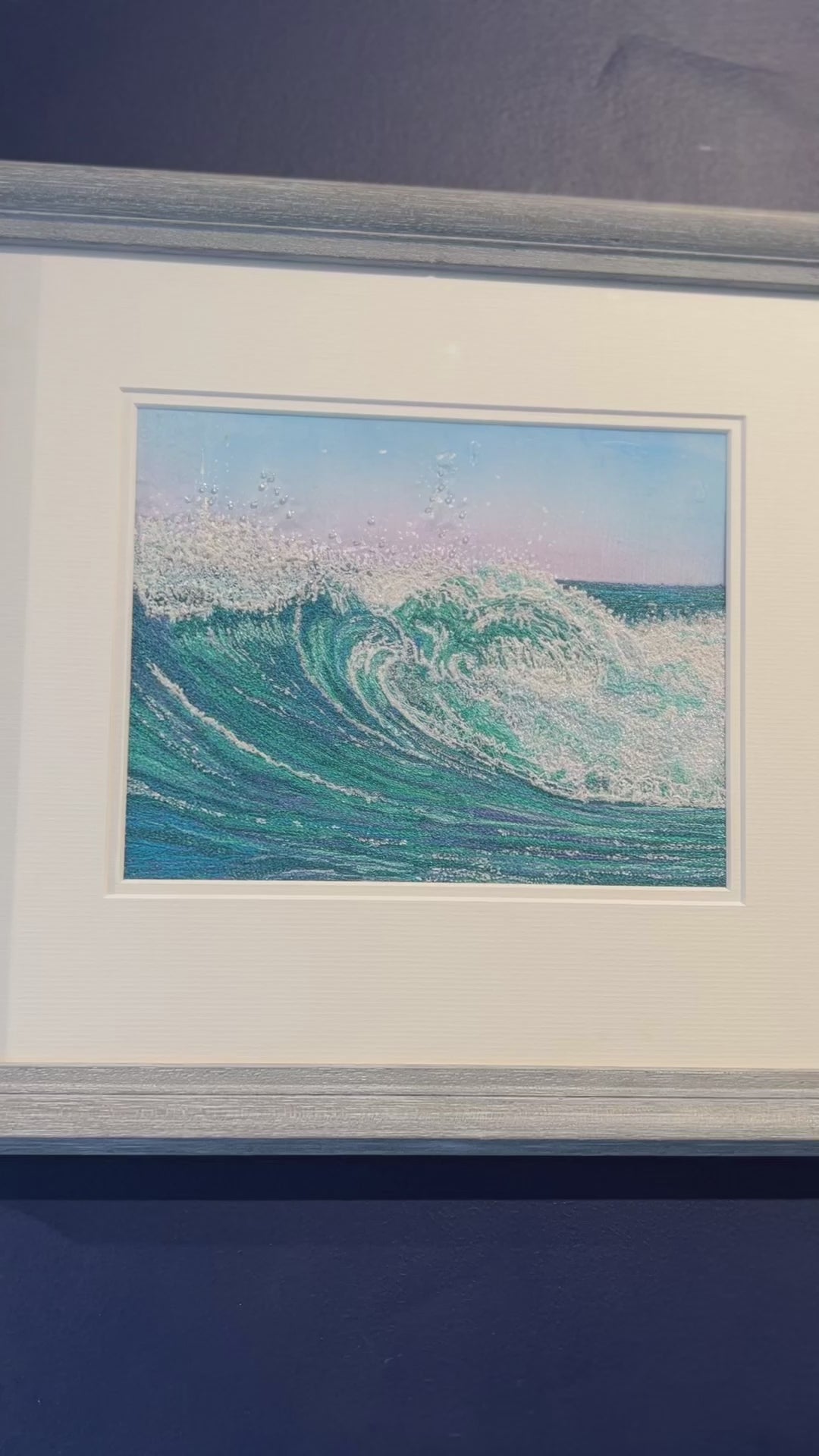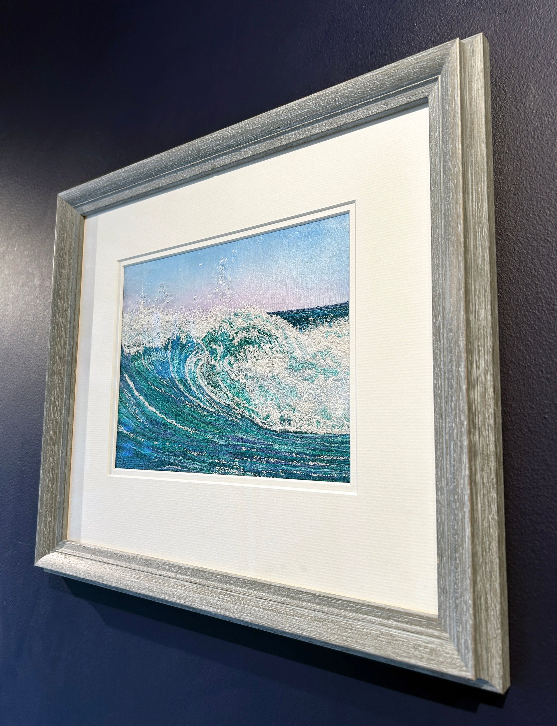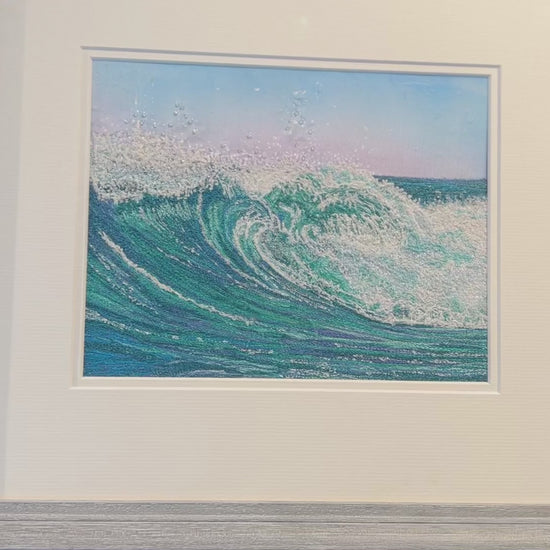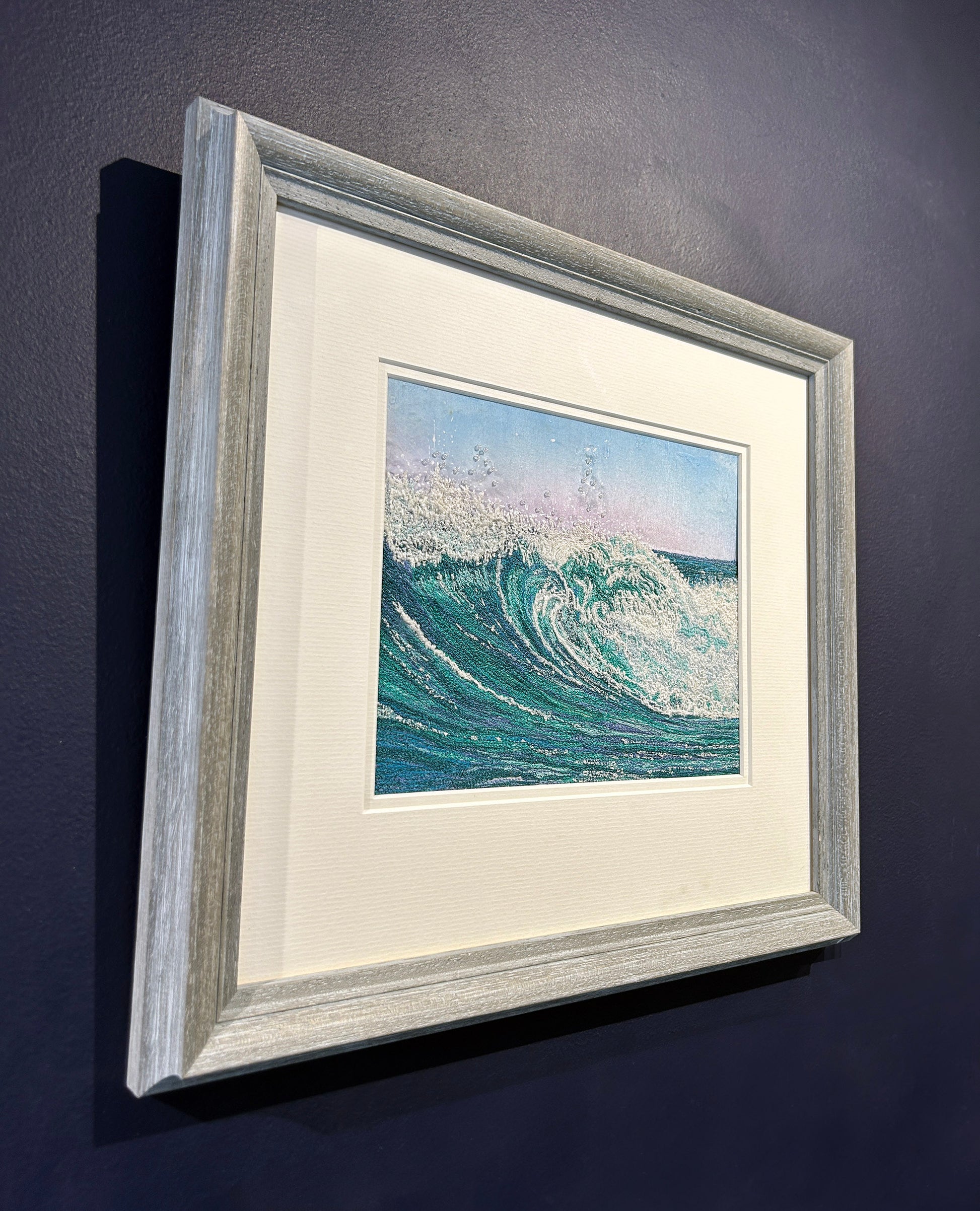 This luminous portrayal of a cresting wave captures the raw grace and energy of the sea in a single, suspended moment. Swells of turquoise, jade and seafoam swirl together in dynamic layers, the curling water delicately textured and slightly raised from the mount. Flecks of white spray dance above the crest, catching the light like salt crystals in morning air, while the soft gradient of a pink-and-blue sky offers a calm counterbalance to the wave’s power. Framed in pale, weathered wood with a clean white surround, the piece radiates freshness and motion — a still yet powerful glimpse into the ever-changing rhythm of the tide.