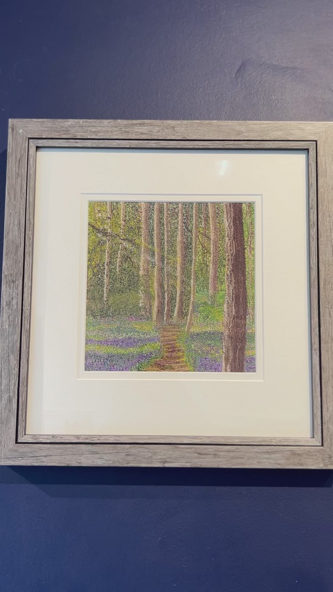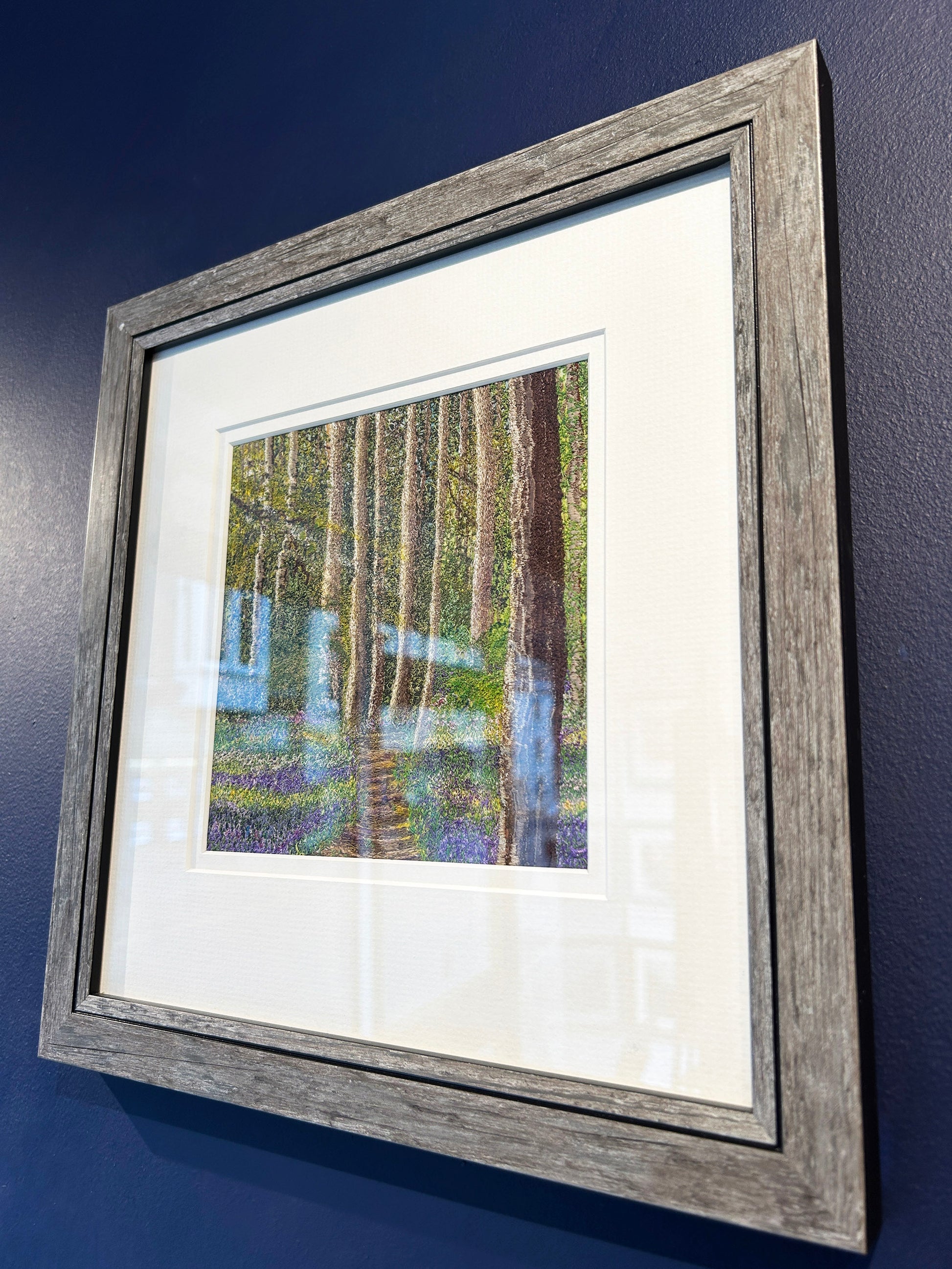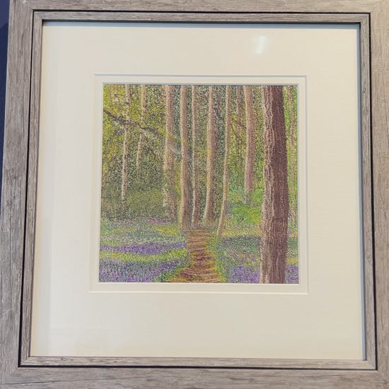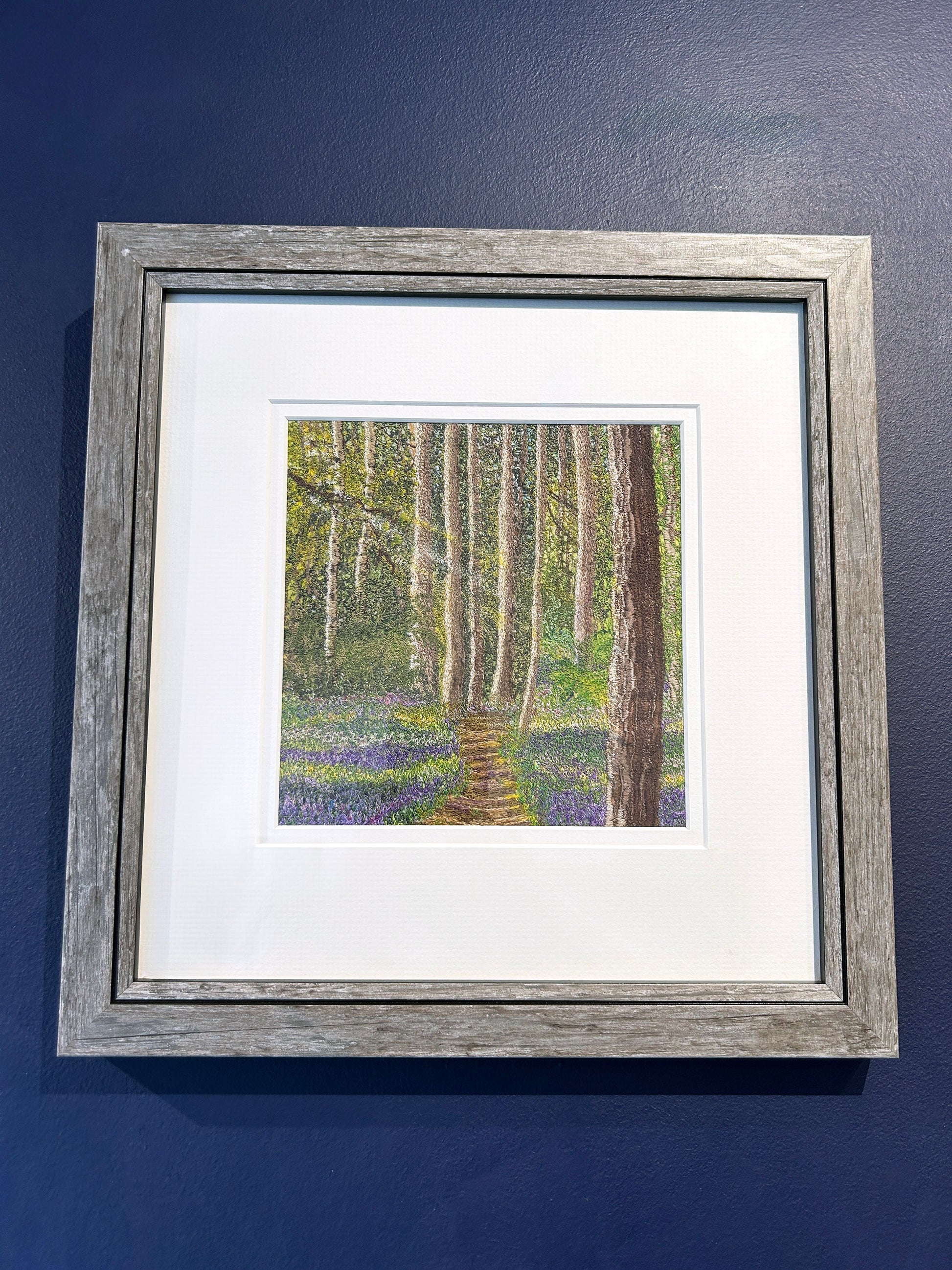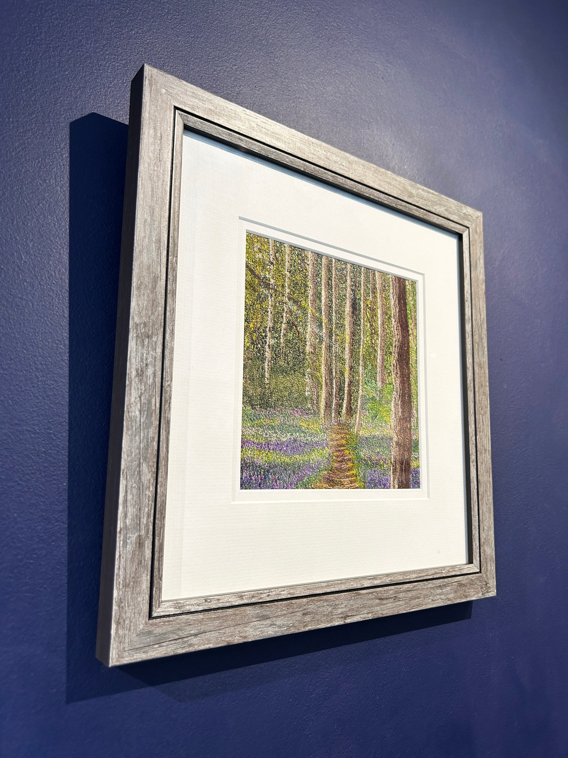 A gentle woodland path weaves its way through slender tree trunks, their bark dappled with golden light and soft shade. Beneath them, a carpet of bluebells and wildflowers unfurls in layers of violet, indigo and spring green — a dreamlike forest floor alive with quiet colour. The delicate detailing invites the viewer to step forward, as though drawn into a hushed moment where birdsong and rustling leaves are just out of earshot. Slightly raised from the mount, the floral textures catch the light subtly, creating depth and motion. Framed in soft grey wood and a clean white surround, this piece offers a sense of renewal and reverie — a glimpse of spring’s promise beneath tall trees.