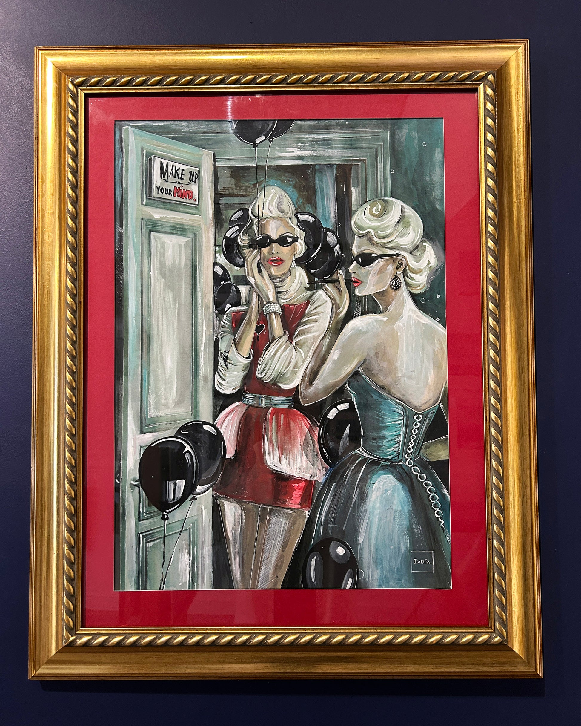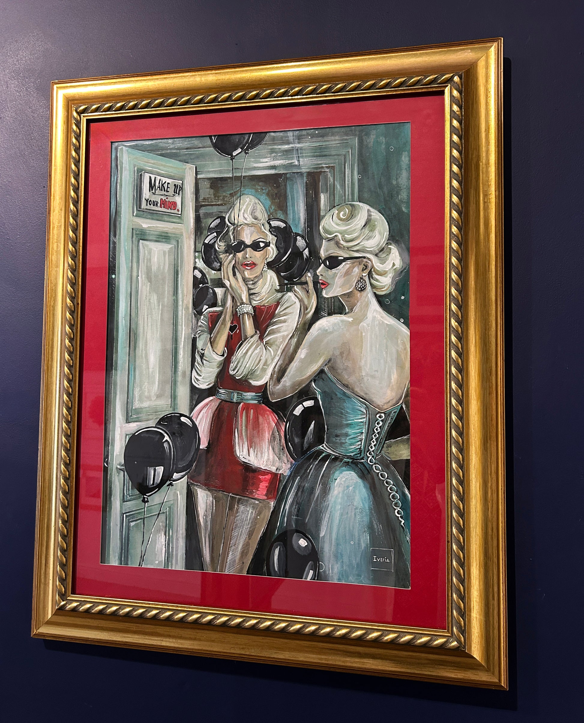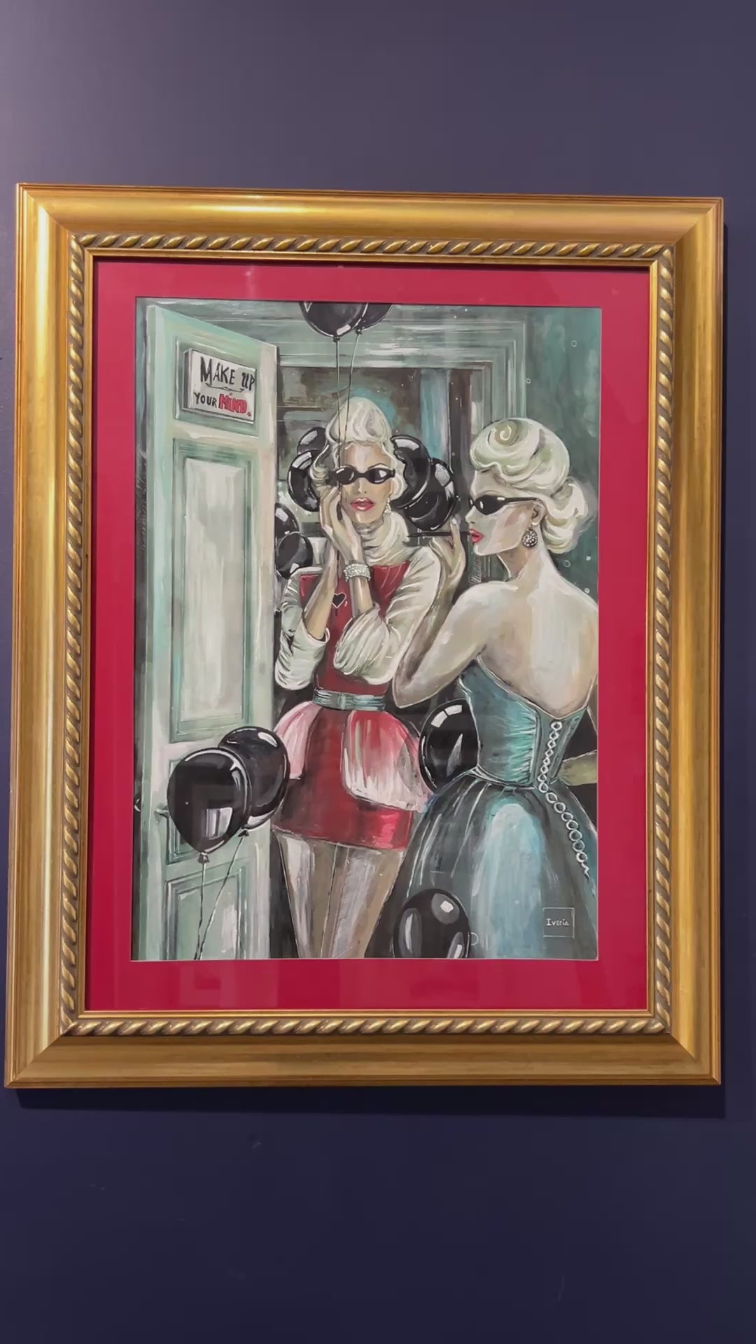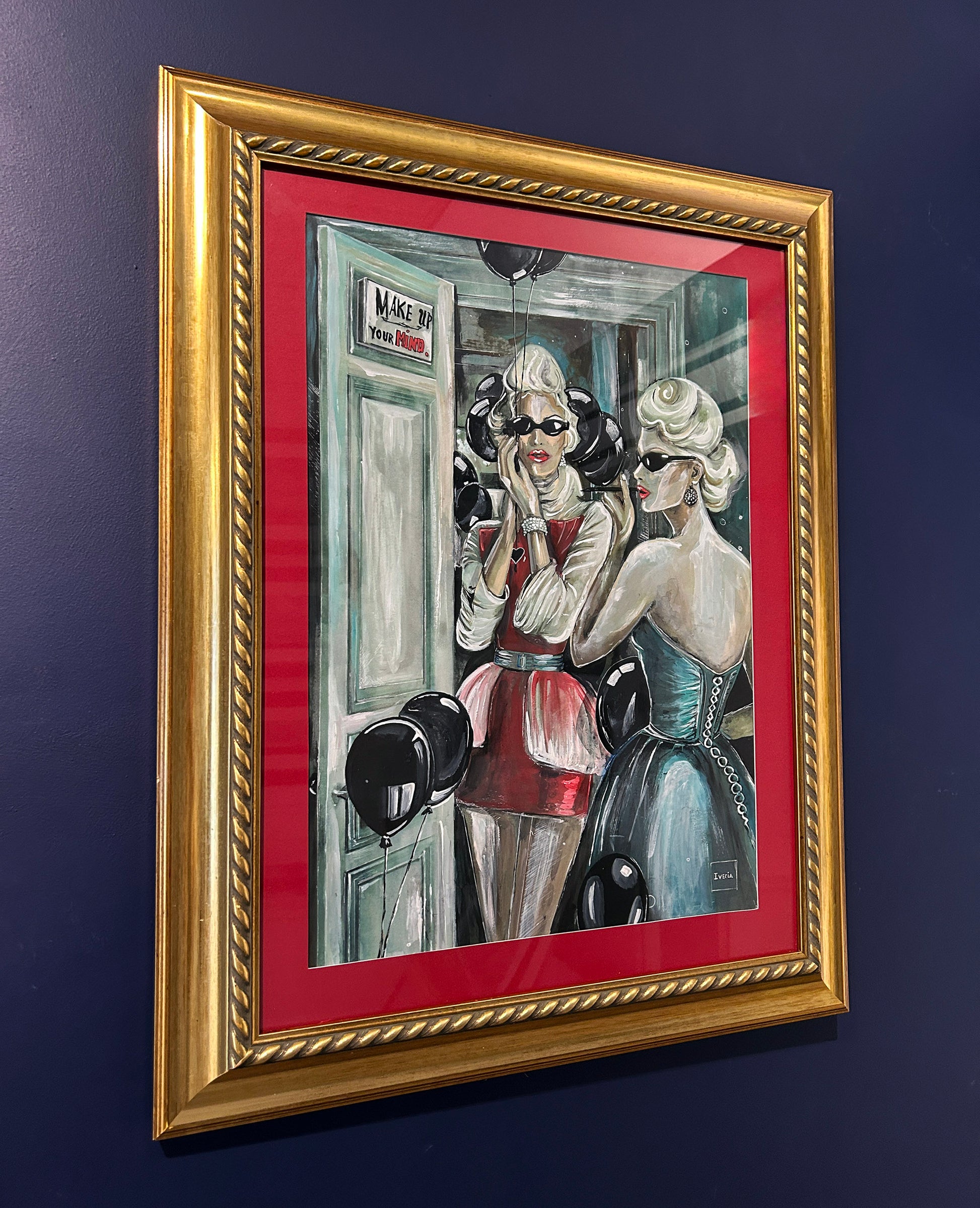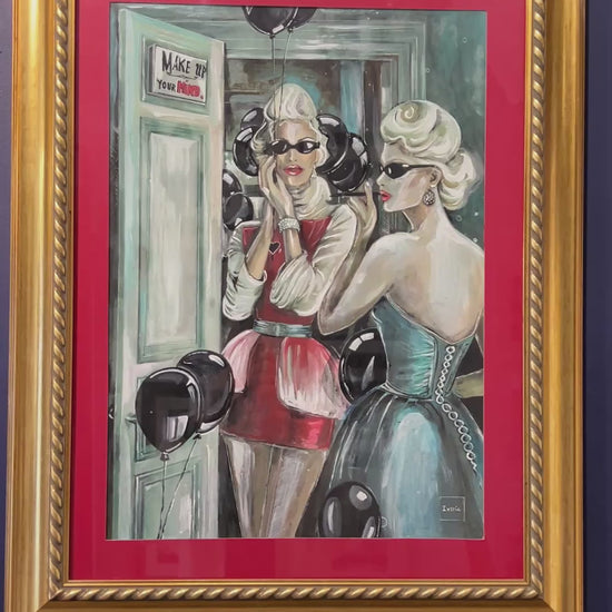 This striking composition captures two elegant figures — mirror images of defiance — poised in a liminal space between glamour and grit. One, draped in crimson, stands framed by a doorway, her expression guarded yet unyielding; the other, clothed in teal satin and pearls, returns her gaze from the mirror’s surface. Black balloons hover like silent witnesses, their sheen echoing the polished lacquer of the women’s poise. A subtle yet potent message, “Make up your mind”, lingers in the background, challenging both subject and viewer. With its vivid contrasts, cinematic framing, and the interplay of light upon silk, gloss, and glass, the work becomes a meditation on identity, perception, and the delicate art of facing oneself — or one’s adversary — without flinching.