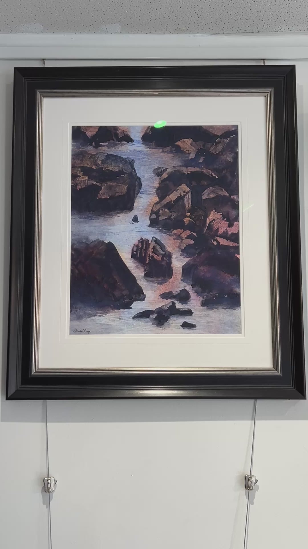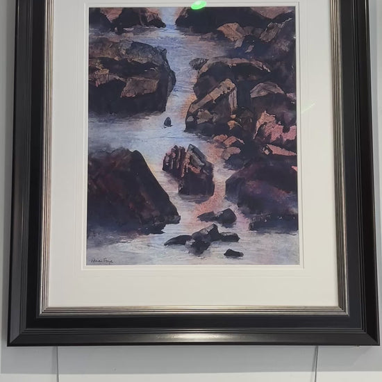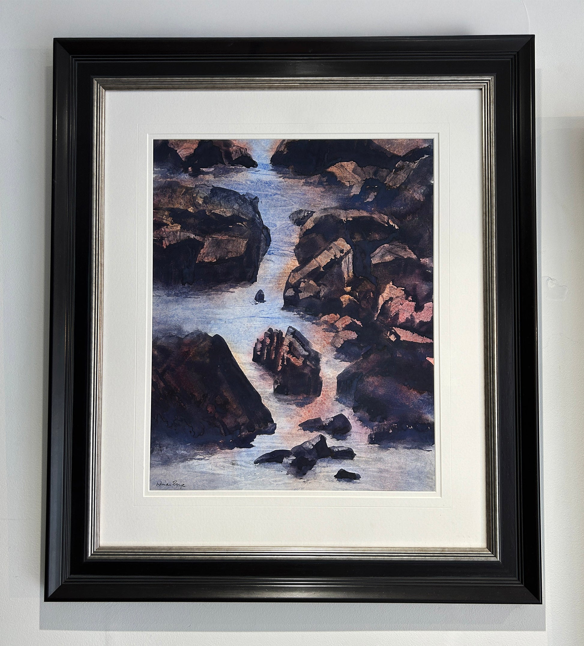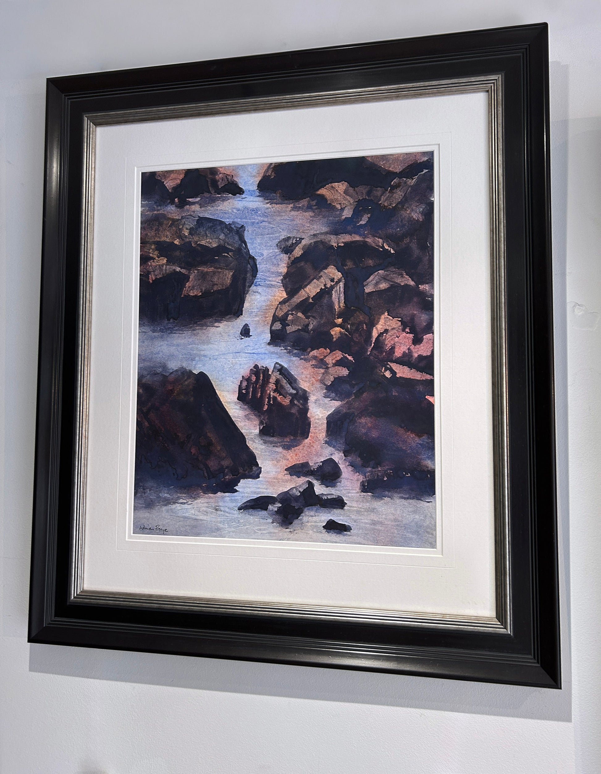 This contemplative coastal study captures the meeting of water and stone in a palette of deep umbers, muted violets, and cool slate-blues. The jagged rocks, rendered with quiet precision, emerge from a mirror-sheen tide that shimmers with hints of rose and silver, as though touched by the last light of day. Each surface is subtly textured, evoking the salt-weathered resilience of the shoreline, while the gentle interplay of shadow and reflection lends a sense of stillness and depth. Set within a crisp white mount and a bold, ebony-toned frame, the composition invites the viewer to pause and trace the intricate geometry of nature — a serene moment suspended between tide and time.