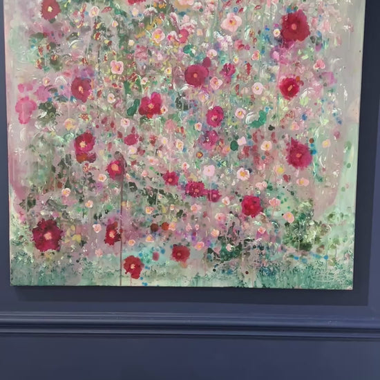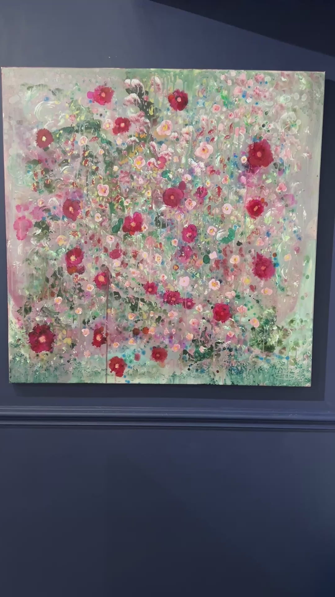 A jubilant celebration of colour and life, Summer in Bloom spills across the canvas in a riot of petal and leaf. Scarlet and crimson blossoms, kissed with touches of pink and ivory, seem to float amidst a haze of green foliage, each brushstroke trembling with freshness. Beneath them, delicate splashes of aquamarine and teal whisper of morning dew and the cool shade of garden paths. The pale blush background, mottled and soft, lends a dreamlike quality, as though the flowers are suspended between memory and reality. The overall impression is of a garden caught in perpetual midsummer – a place where time slows, fragrance hangs in the air, and every bloom leans towards the light.