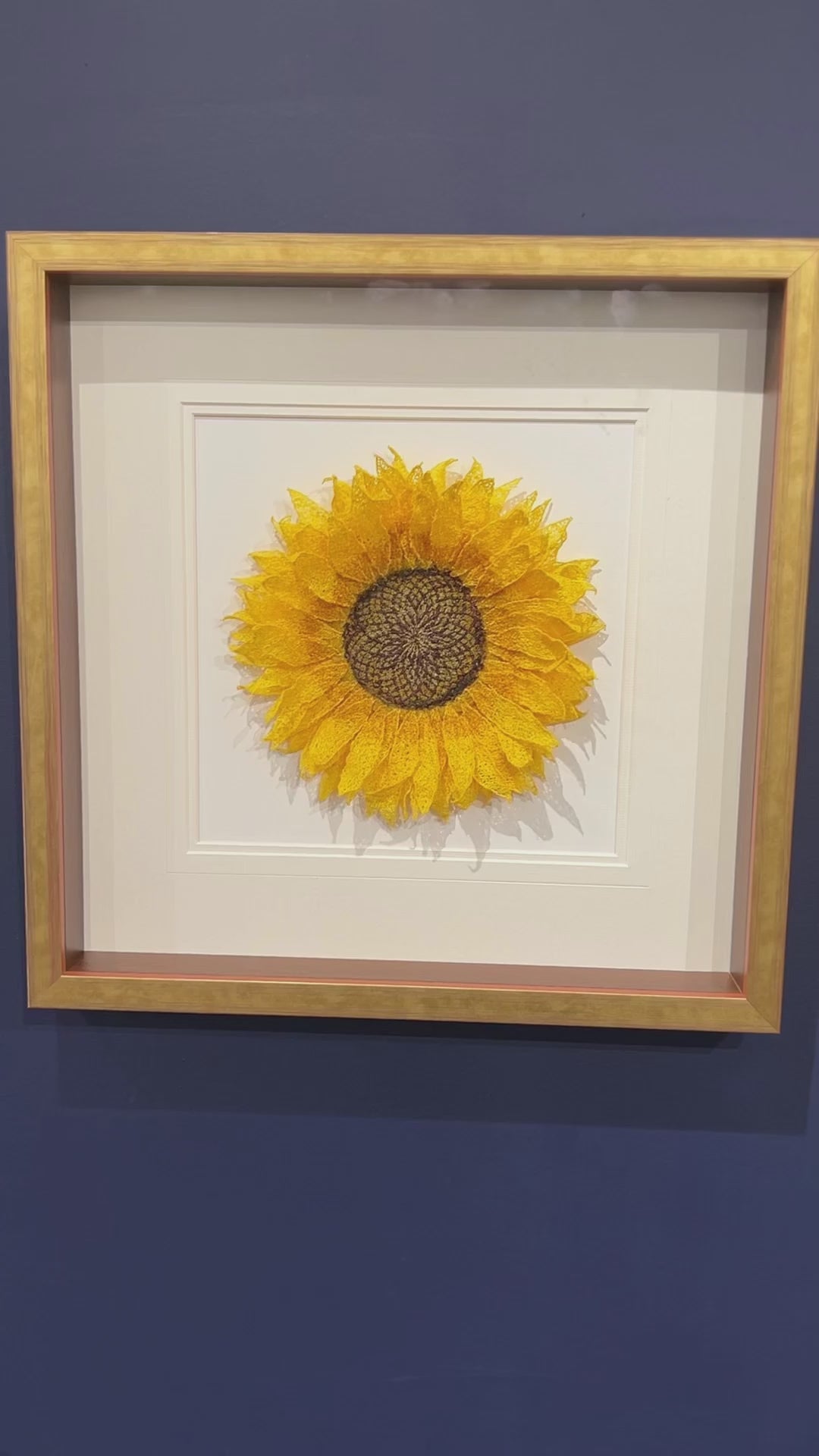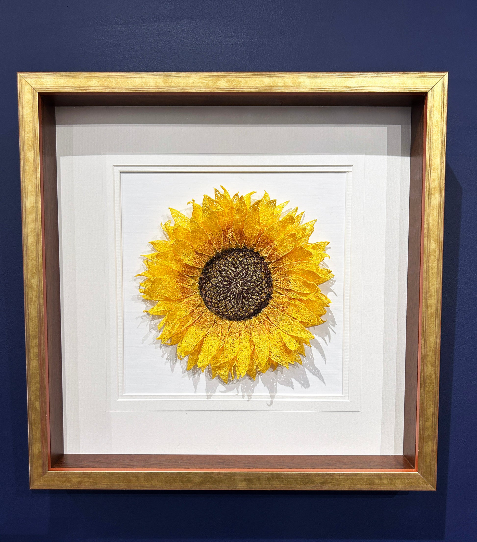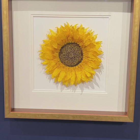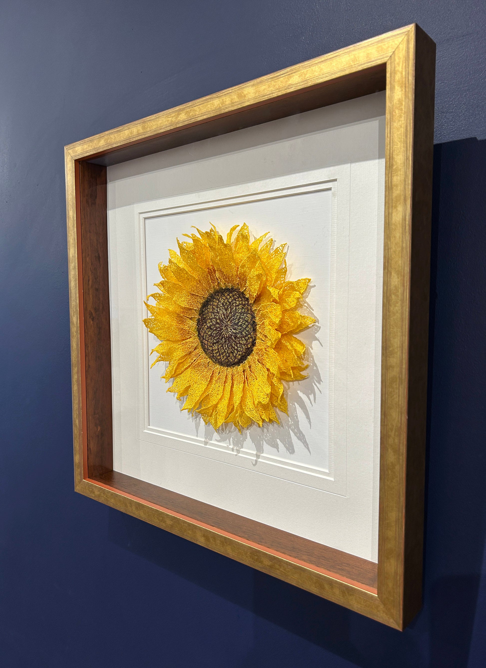This gleaming study of a single sunflower radiates midsummer optimism. Layers of honey-gold and saffron petals, delicately textured and slightly lifted from the mount, catch the light like fine silk, while the umber-and-olive heart provides an earthy counterpoint. The crisp white surround allows each feather-edged petal to cast a gentle shadow, giving the bloom a sculptural presence that seems to float just inside its glass. A discreet, gilded frame echoes the flower’s own lustre, and the overall effect is both botanical and luminous – a quiet reminder of open fields, warm breezes, and the enduring cheer of sunlit days, even when British skies turn grey.