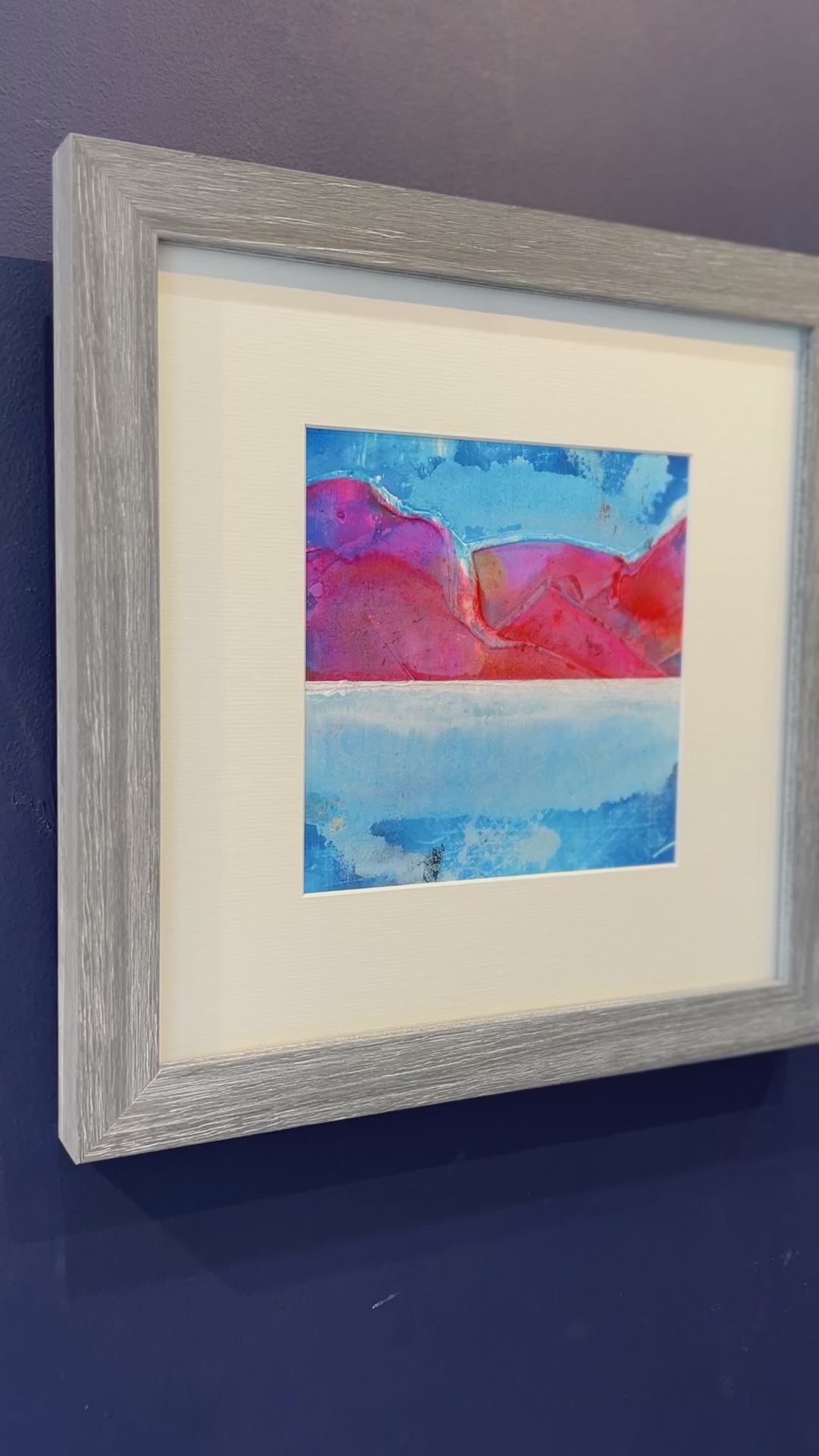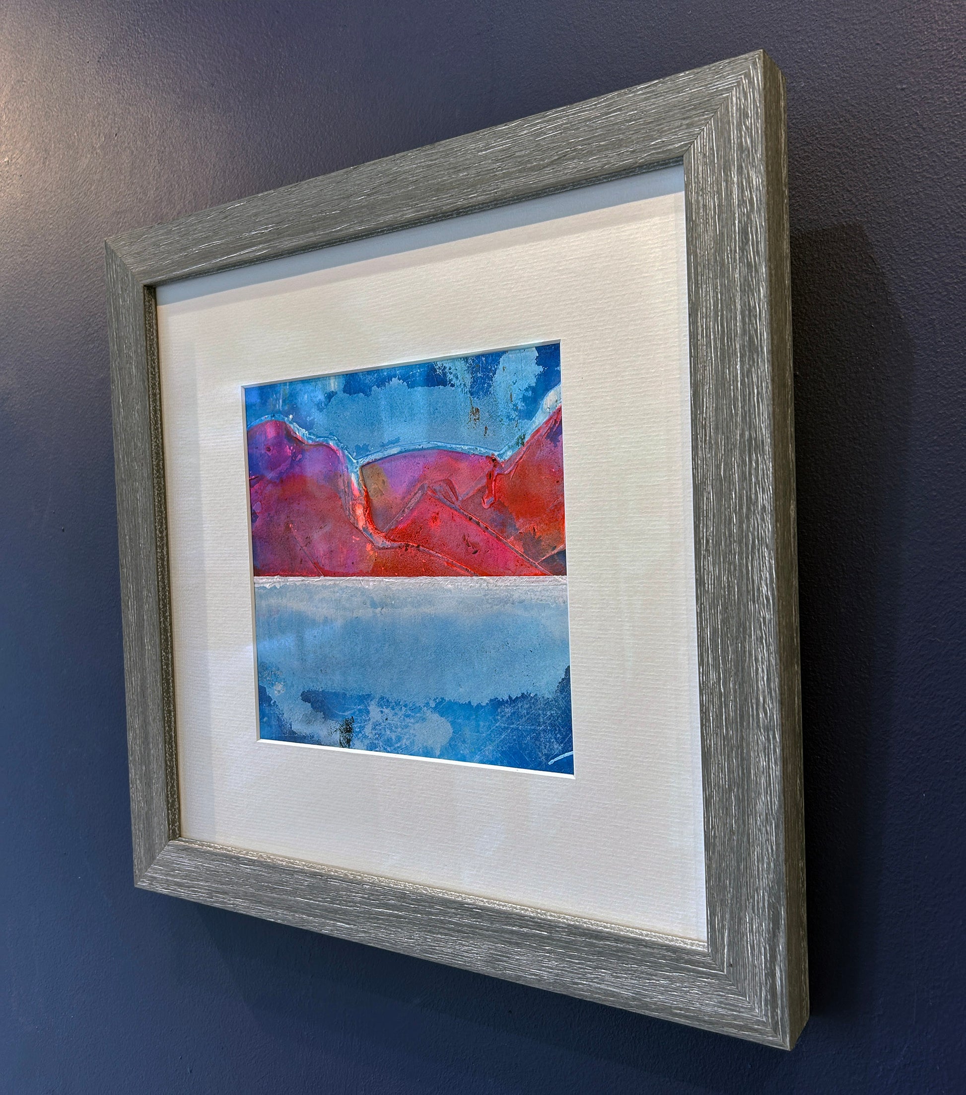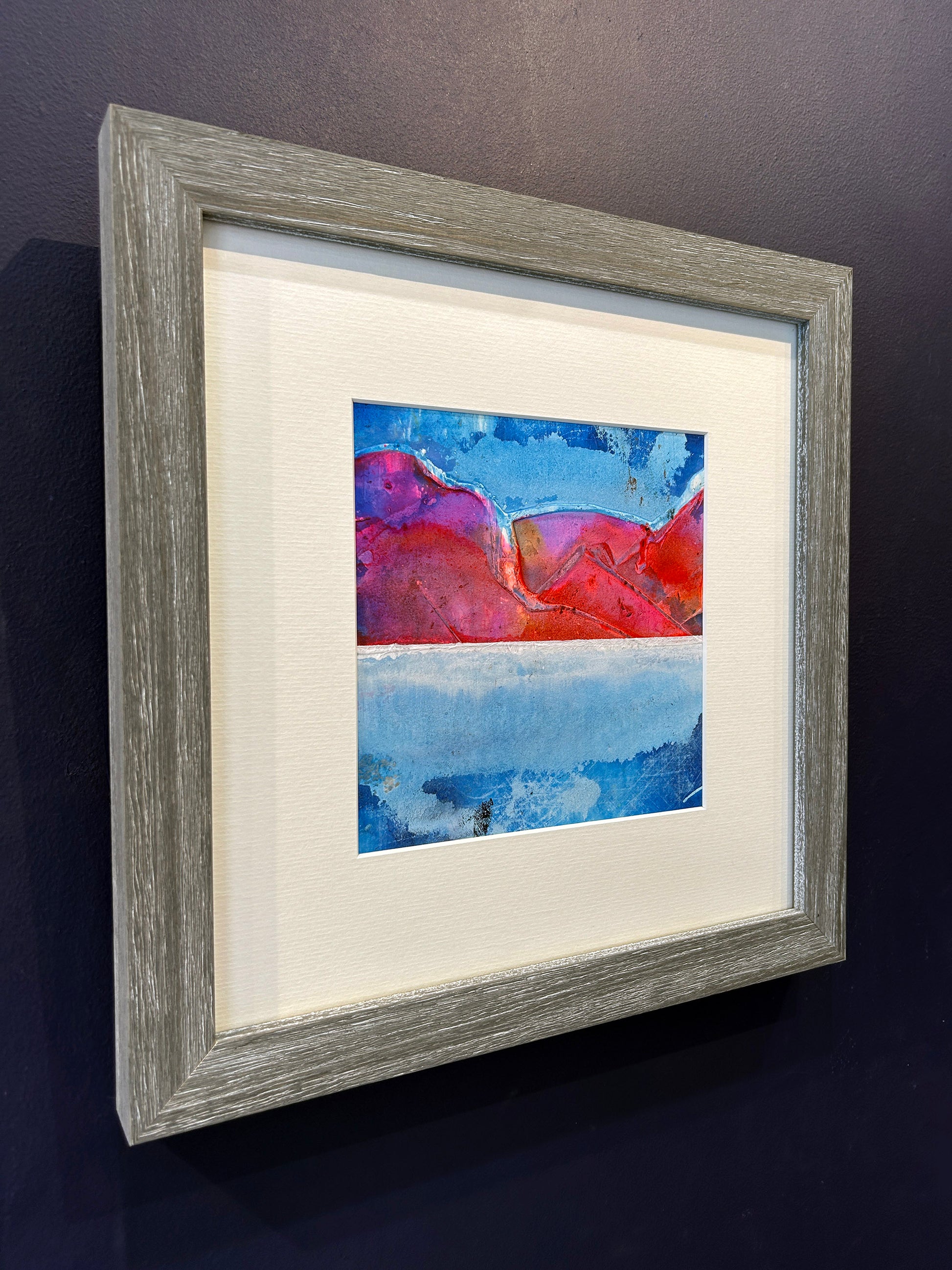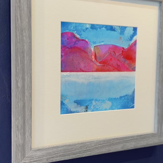 This vivid abstract landscape captures the mesmerising glow of a sun-drenched ridgeline at dusk. Bold tones of crimson, magenta and tangerine form undulating mountains against a horizon of cobalt and ultramarine, suggesting both serenity and energy. The layered watercolour textures evoke the reflection of light across water and sky, while the clean white mount allows the saturated hues to breathe. Set in a cool grey woodgrain frame, the piece radiates warmth and tranquillity — a harmonious balance of nature’s fire and calm. A contemplative escape into the colours of the fading day.