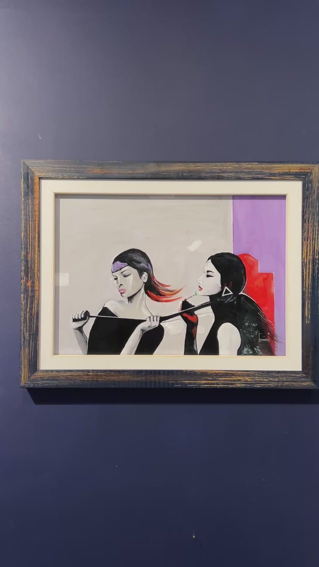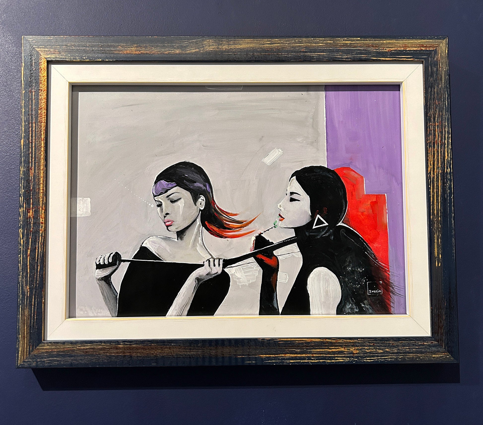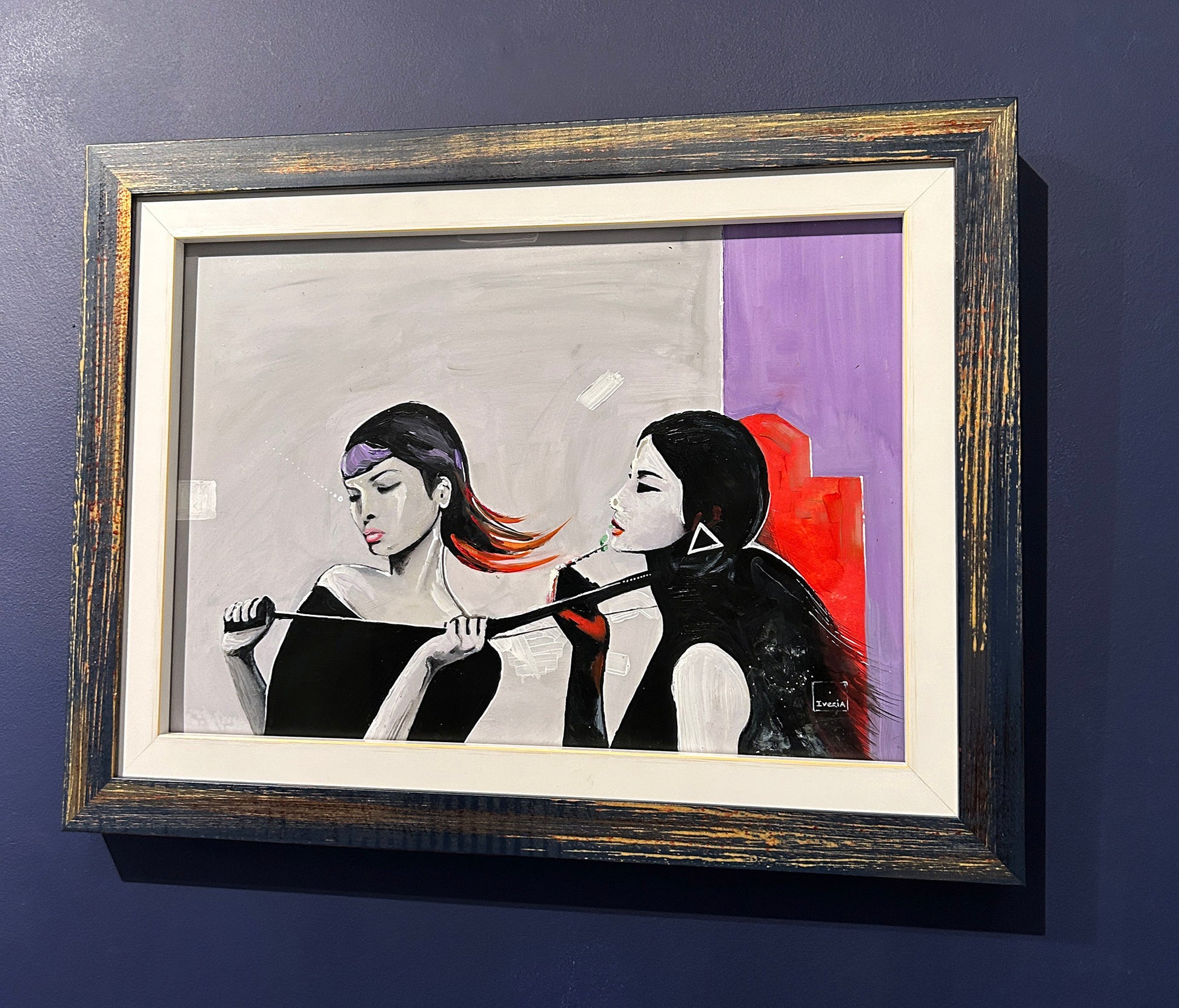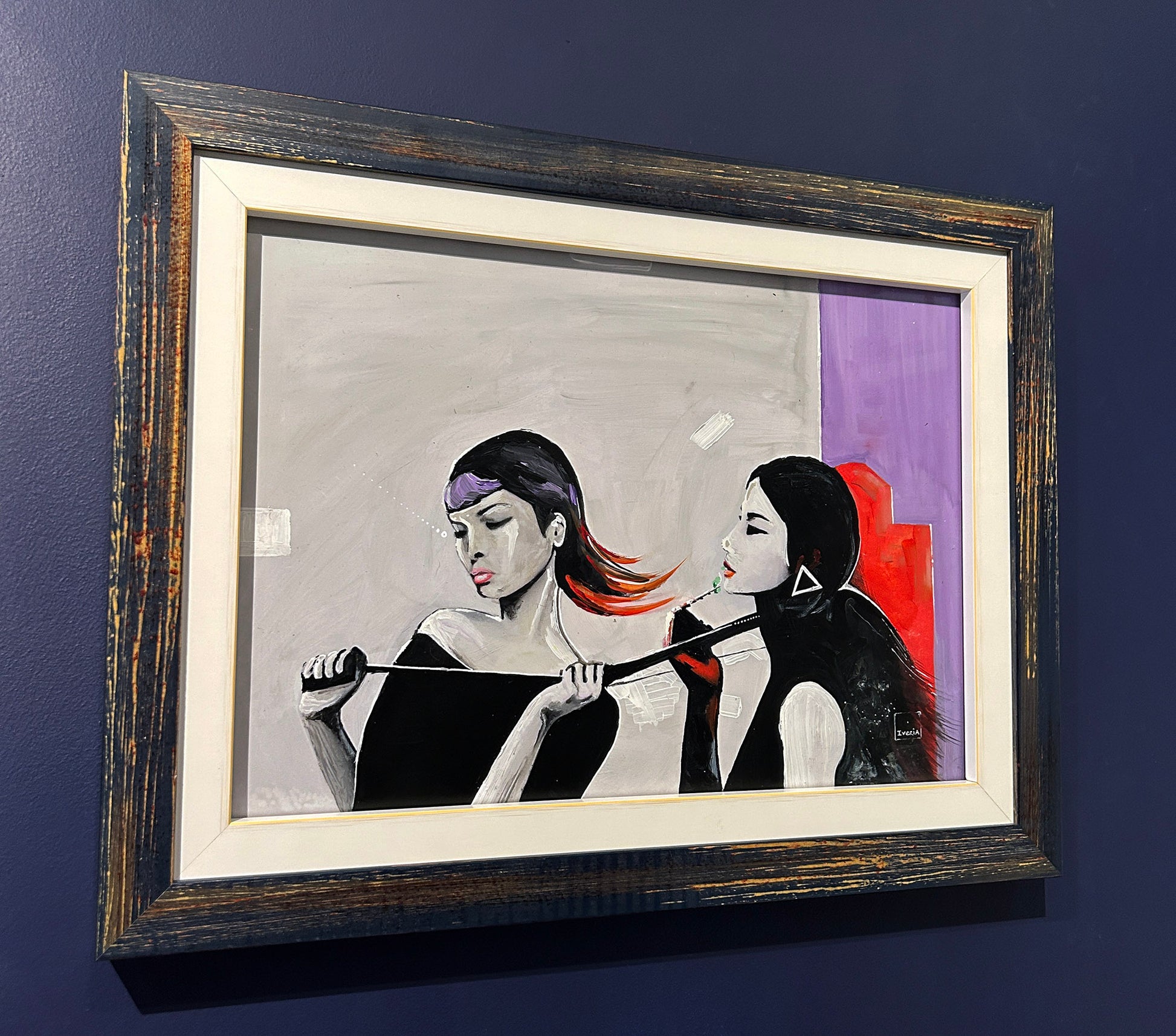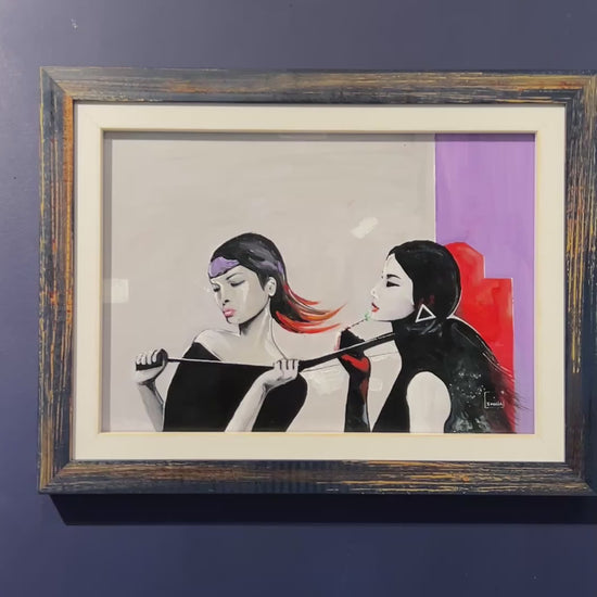 A charged encounter unfolds in pared-back tones, where two women meet in an almost choreographed standoff. The figure to the left, her eyes lowered in restrained concentration, grips a length of black ribbon, while her counterpart — calm, statuesque, and adorned with sharp geometric earrings — holds the other end with an air of quiet dominance. Crimson and violet blocks of colour break the muted backdrop, suggesting a world of modernity and metropolitan intrigue beyond the frame. The sweep of inky hair, the flicker of scarlet in a single strand, and the deliberate minimalism of the composition lend this work an editorial elegance — a frozen moment where fashion, tension, and identity converge without a single word spoken.
