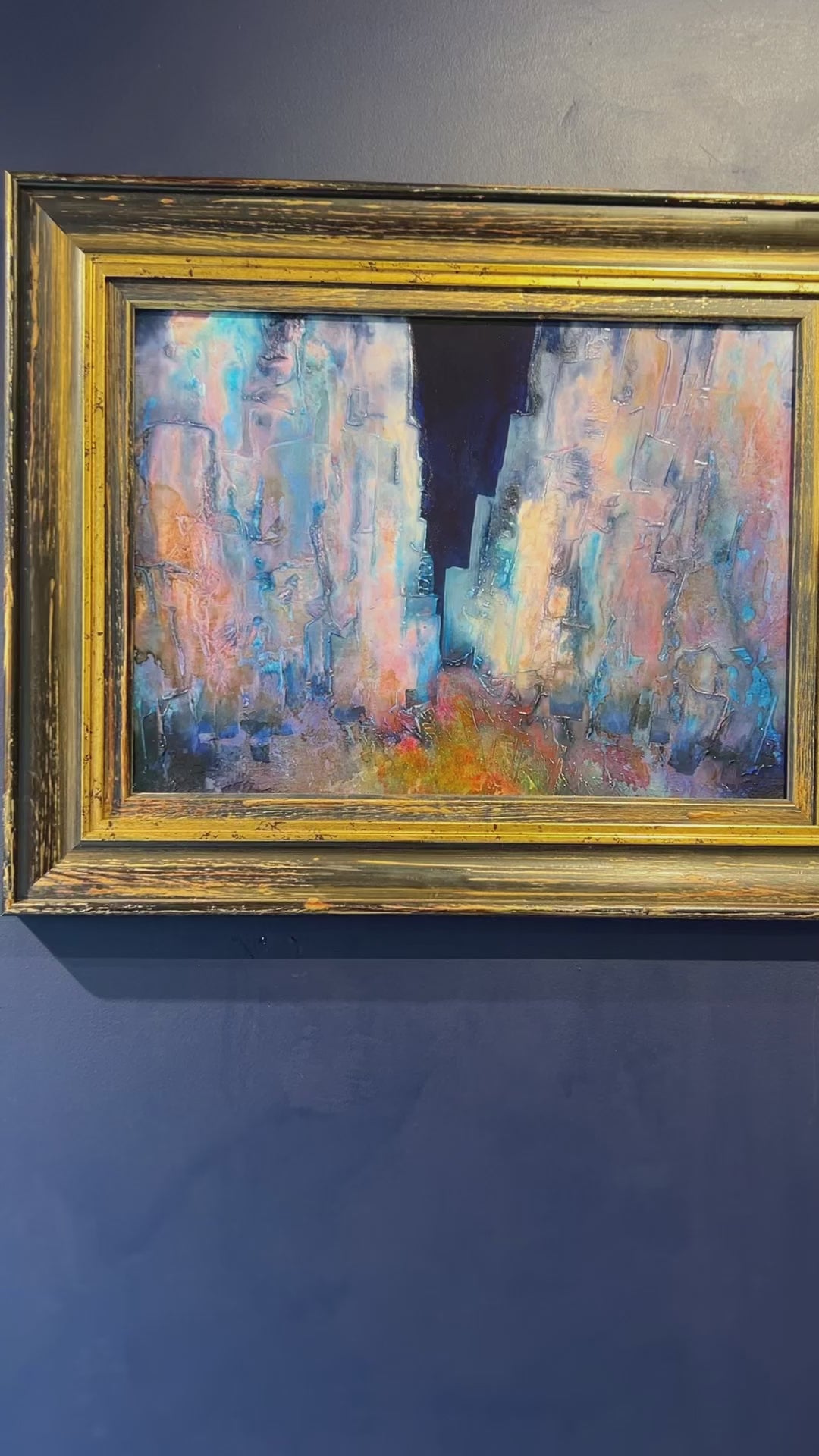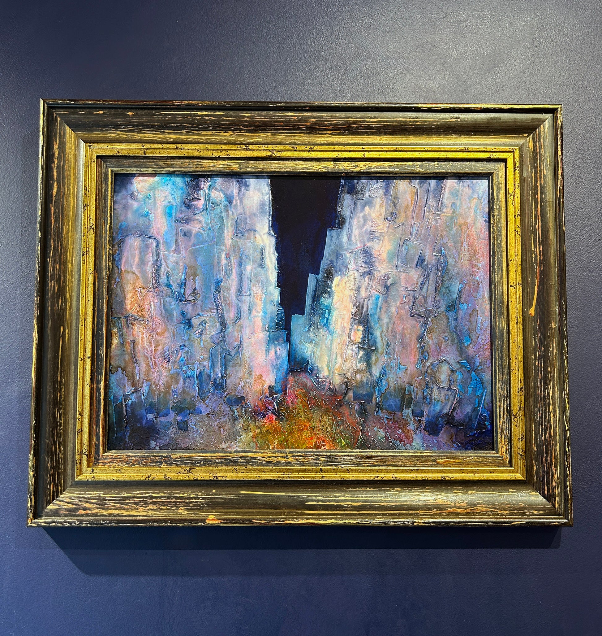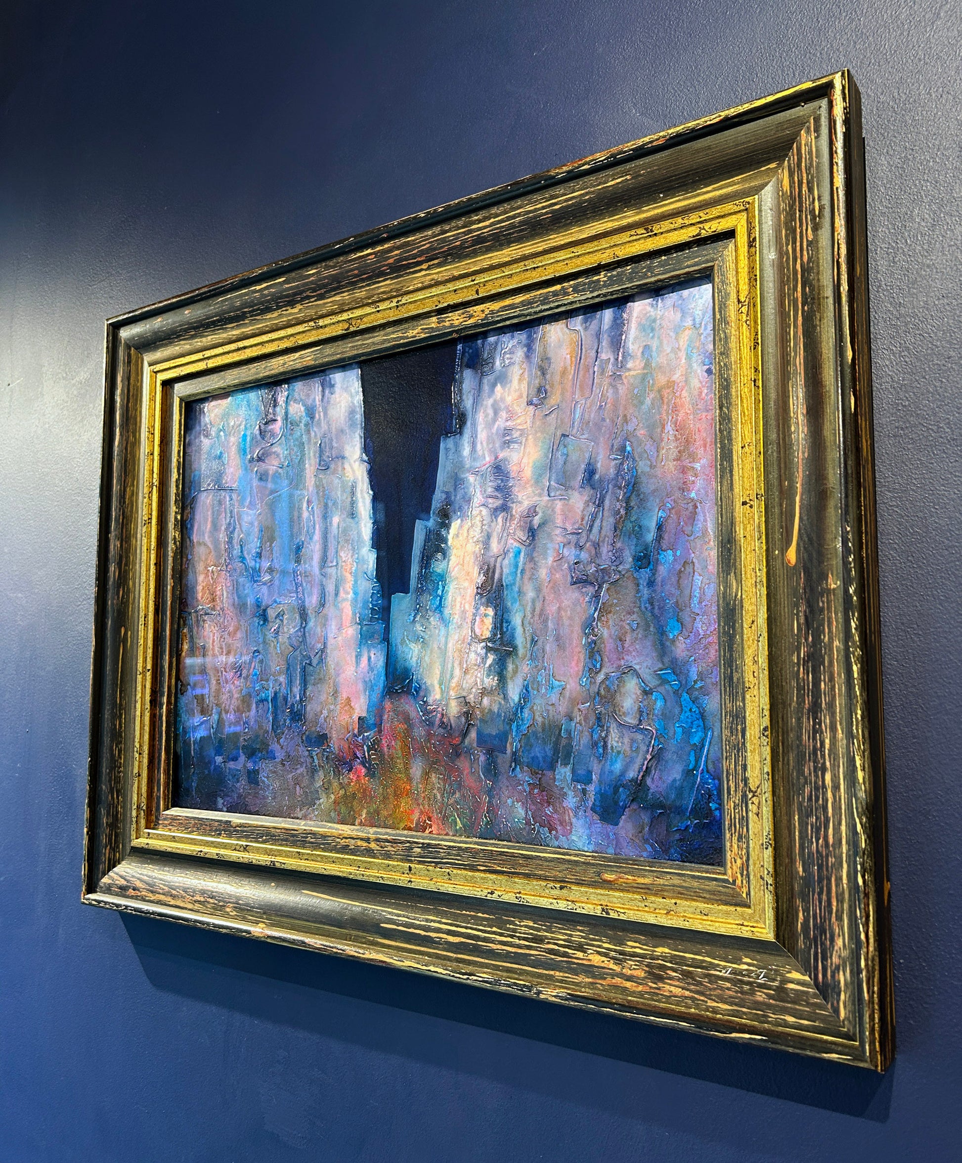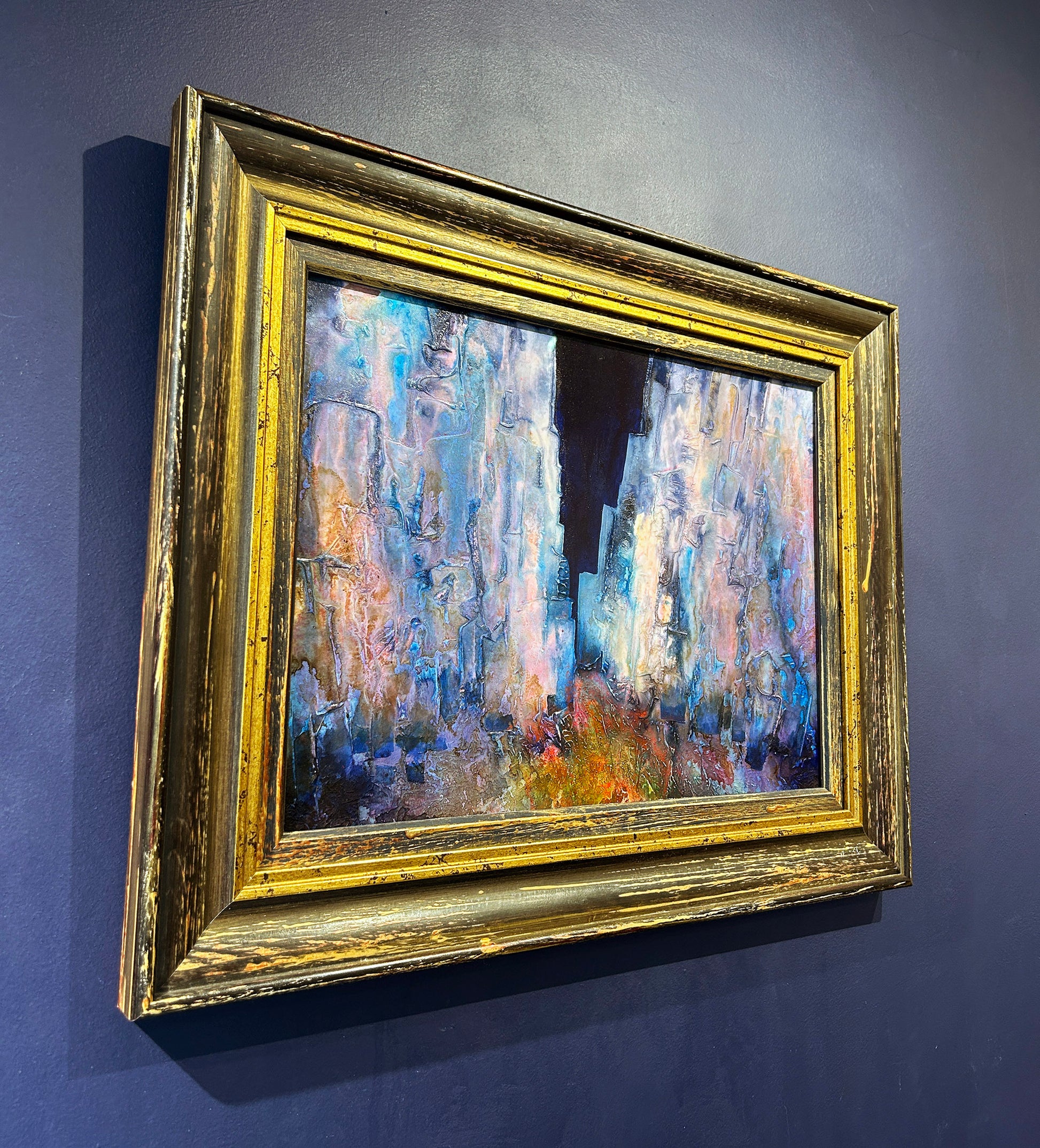 This powerful abstract composition captures a dramatic moment of elemental tension. Cascades of textured blue, lavender, and rose tones seem to surge toward a jagged vertical chasm, rendered in deep midnight black. Luminous pigments shimmer beneath a layered surface, suggesting mineral veins or ice caught in flux. A vivid halo of orange and crimson near the base hints at hidden energy, glowing like embers beneath frost. The distressed, gold-accented frame reinforces the work’s raw energy and timelessness. The result is both geological and emotional – a contemplative portrayal of contrast, fracture, and quiet resilience.