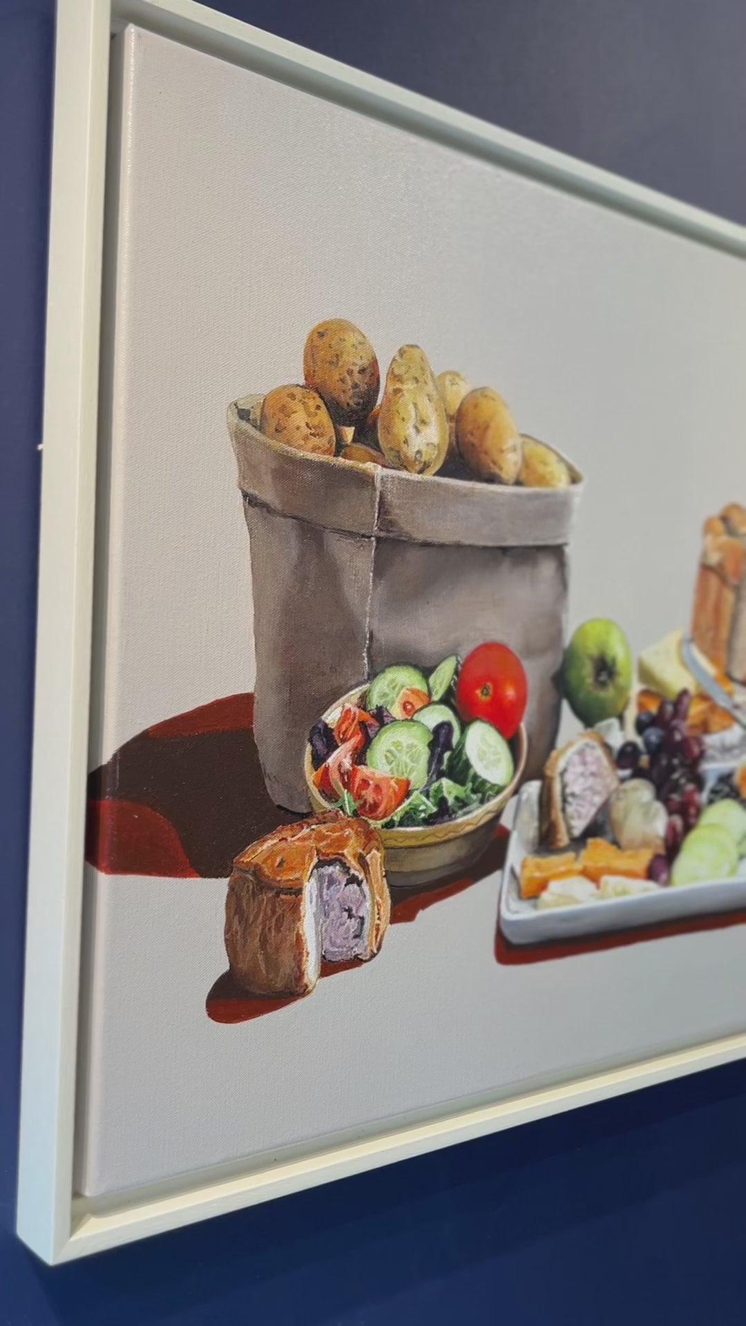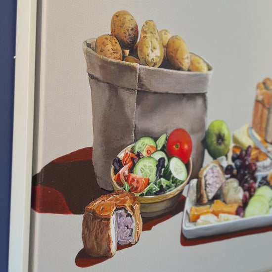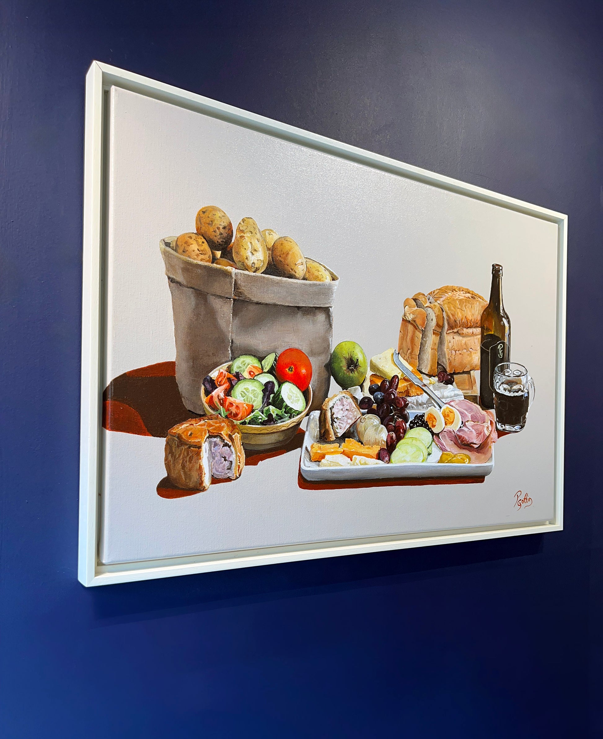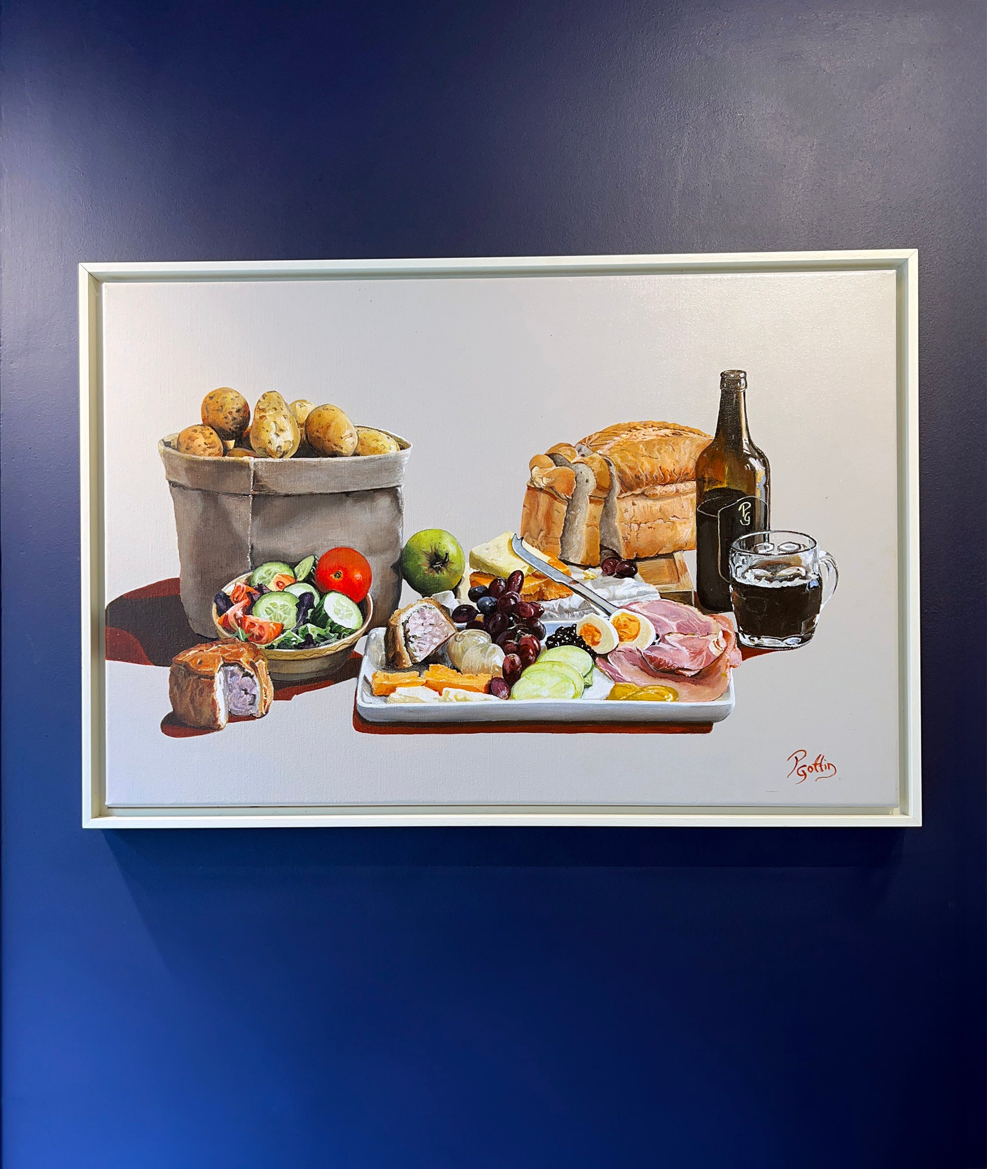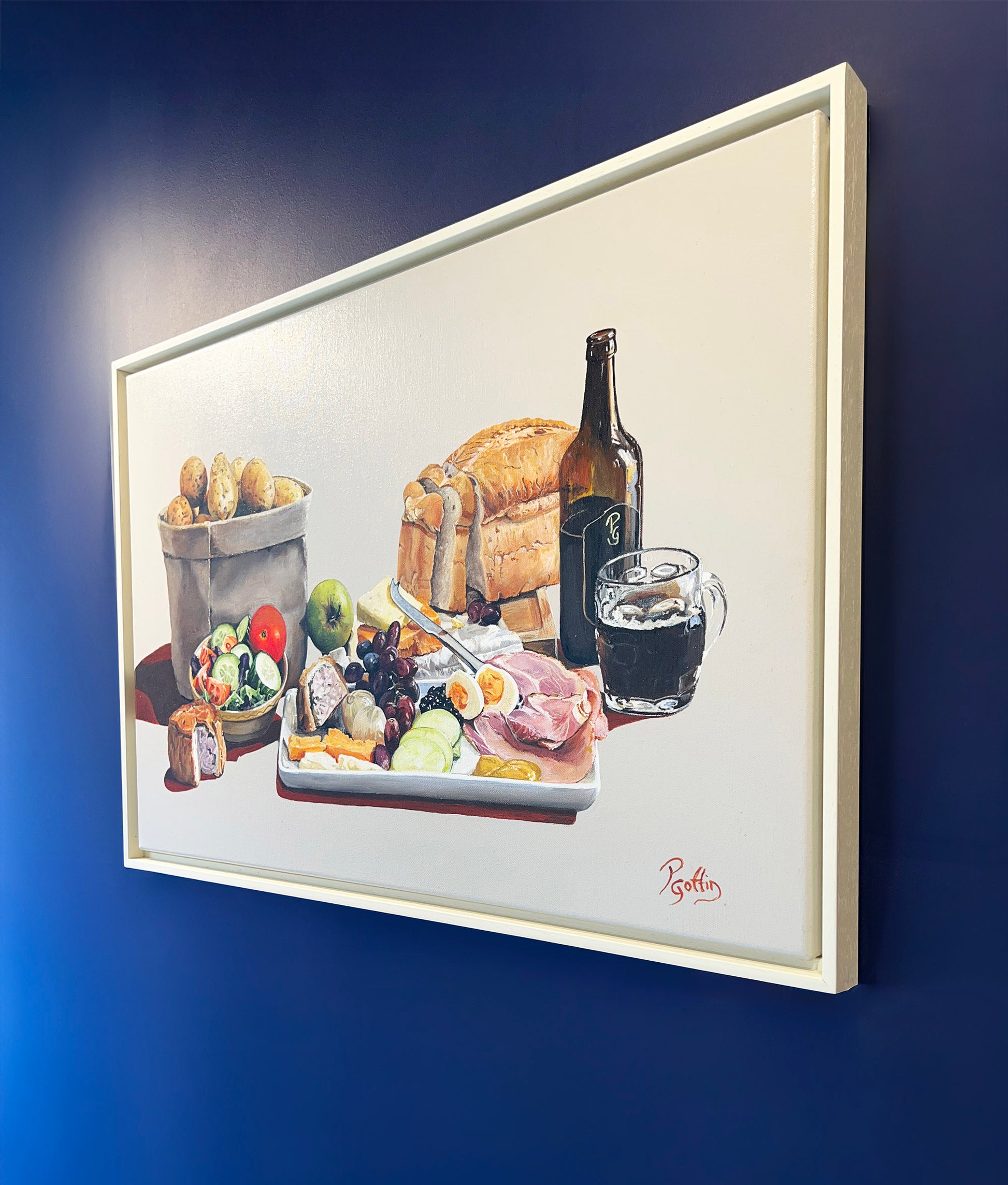 A feast of rustic abundance is laid out in exquisite detail across this cheerful still life. Crusty farmhouse loaves, golden potatoes, carved ham, vibrant salad, pickles, cheeses, eggs, and a pint of ale are rendered with such clarity and warmth they appear almost ready to serve. A palette of earthy tones and crisp whites brings freshness and light to the composition, while the subtle play of shadows adds realism and weight. Framed in simple off-white, the scene glows with quiet pride and homely comfort — a tribute to tradition, good food, and the enduring richness of a well-shared meal.