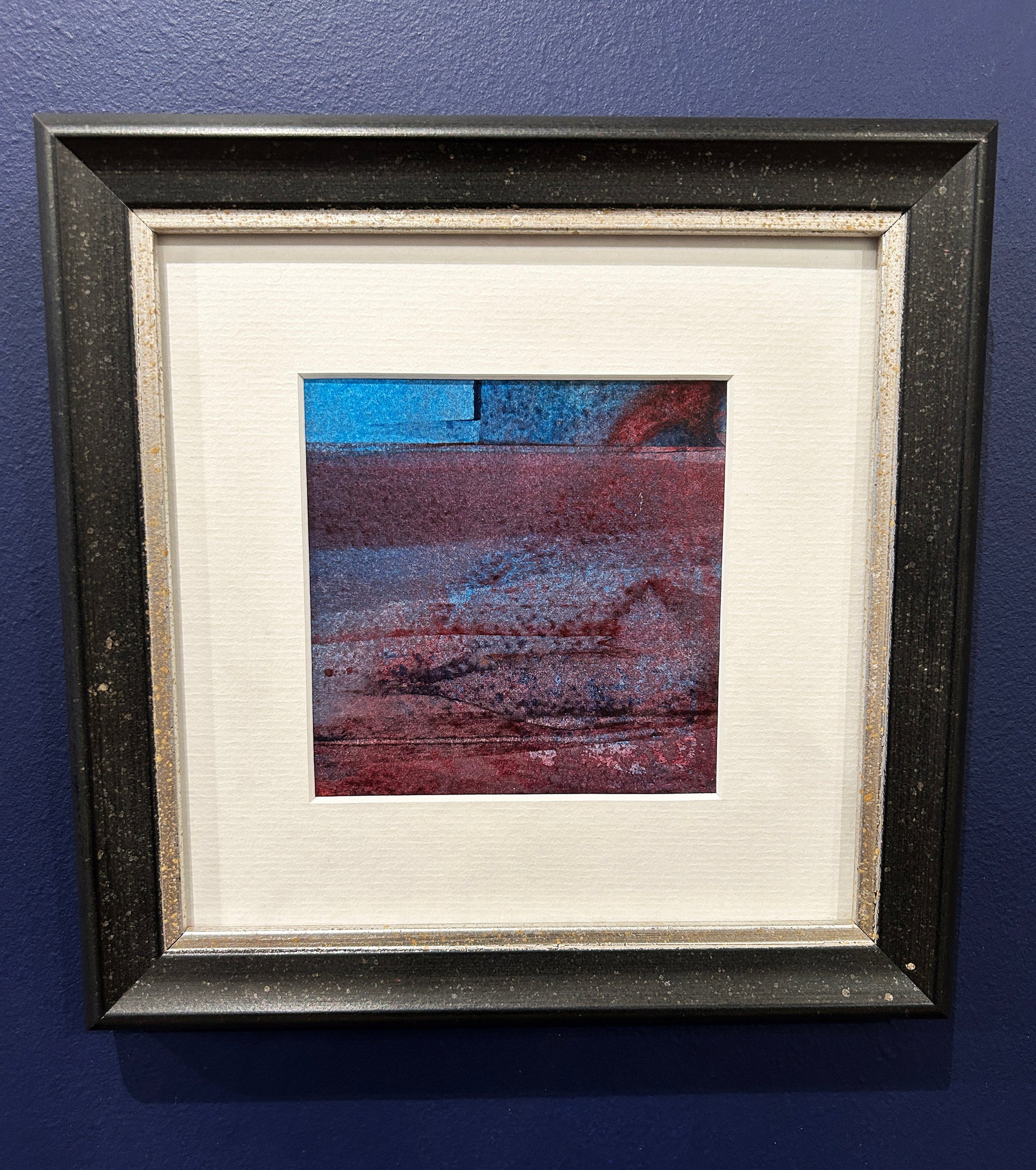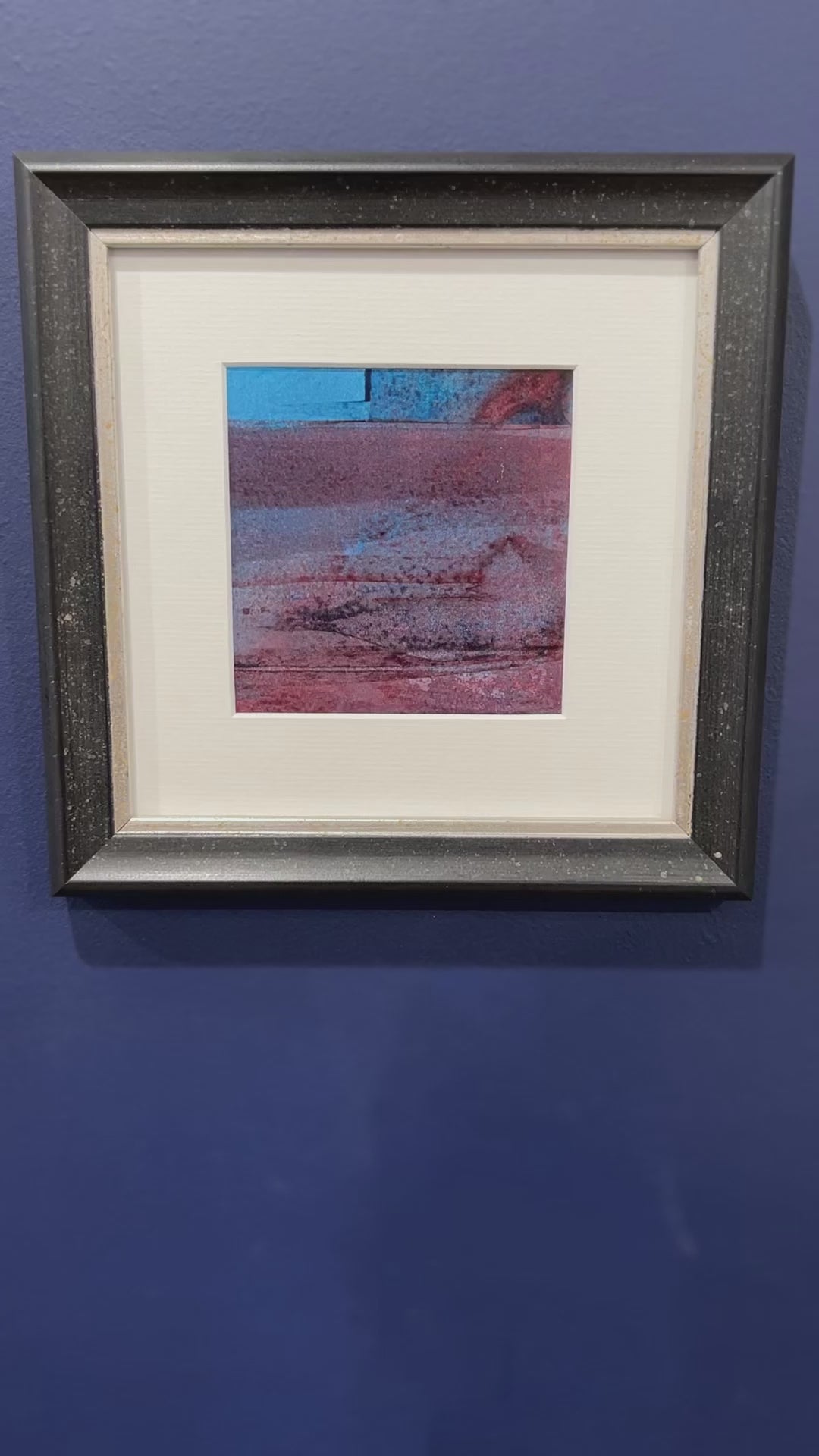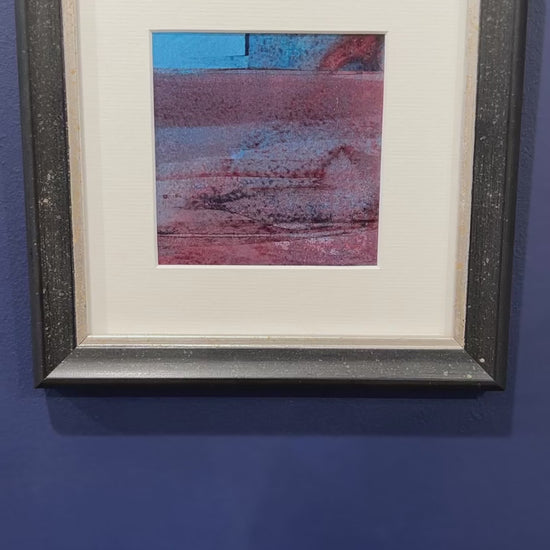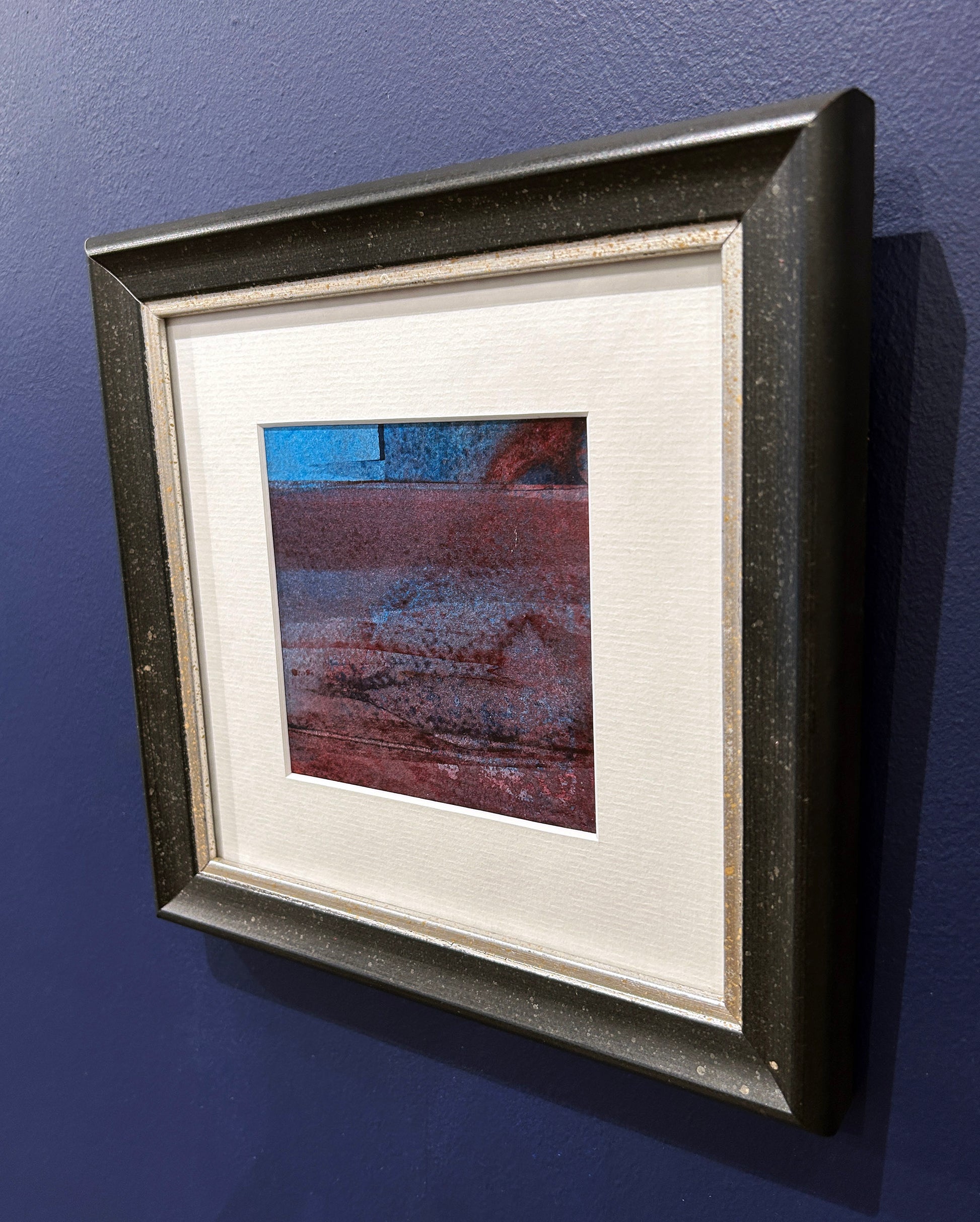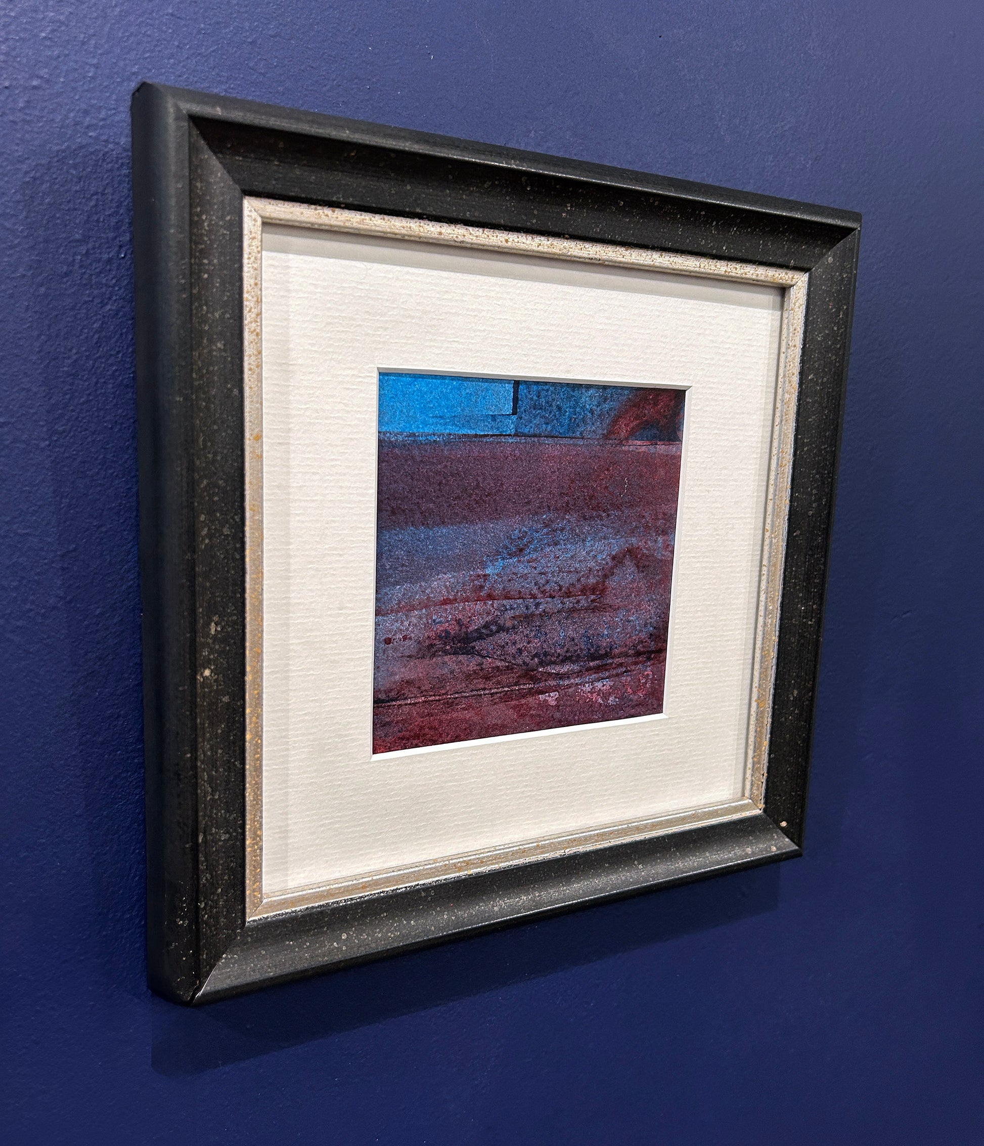 A quiet composition of texture and tone, this compact abstract study pulses with atmospheric depth. Veils of crimson, violet, and deep cobalt drift across the surface, layered with hints of shadow and steel blue, evoking the patina of weathered walls and distant memories. The slight shimmer and grain suggest rust, rain, or grit — elements softened by time. Framed in dark, speckled wood with a crisp white mount, the piece offers a contemplative pause — a miniature window into the beauty found in decay, reflection, and quiet resilience.