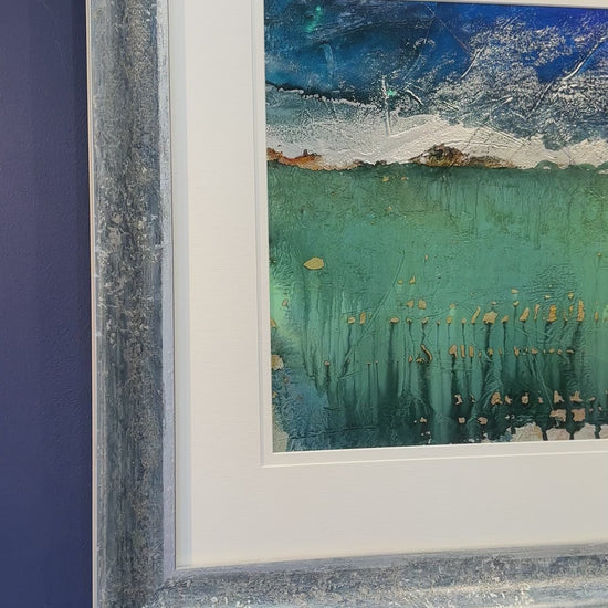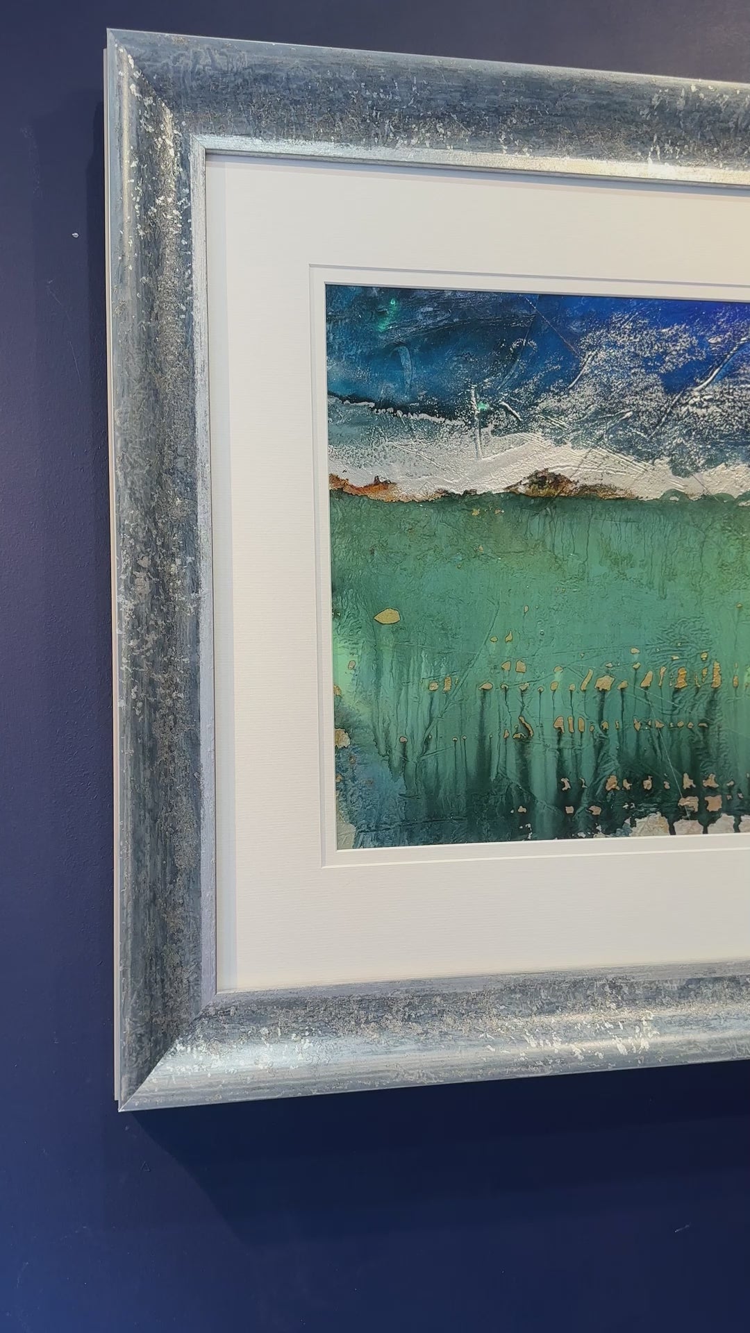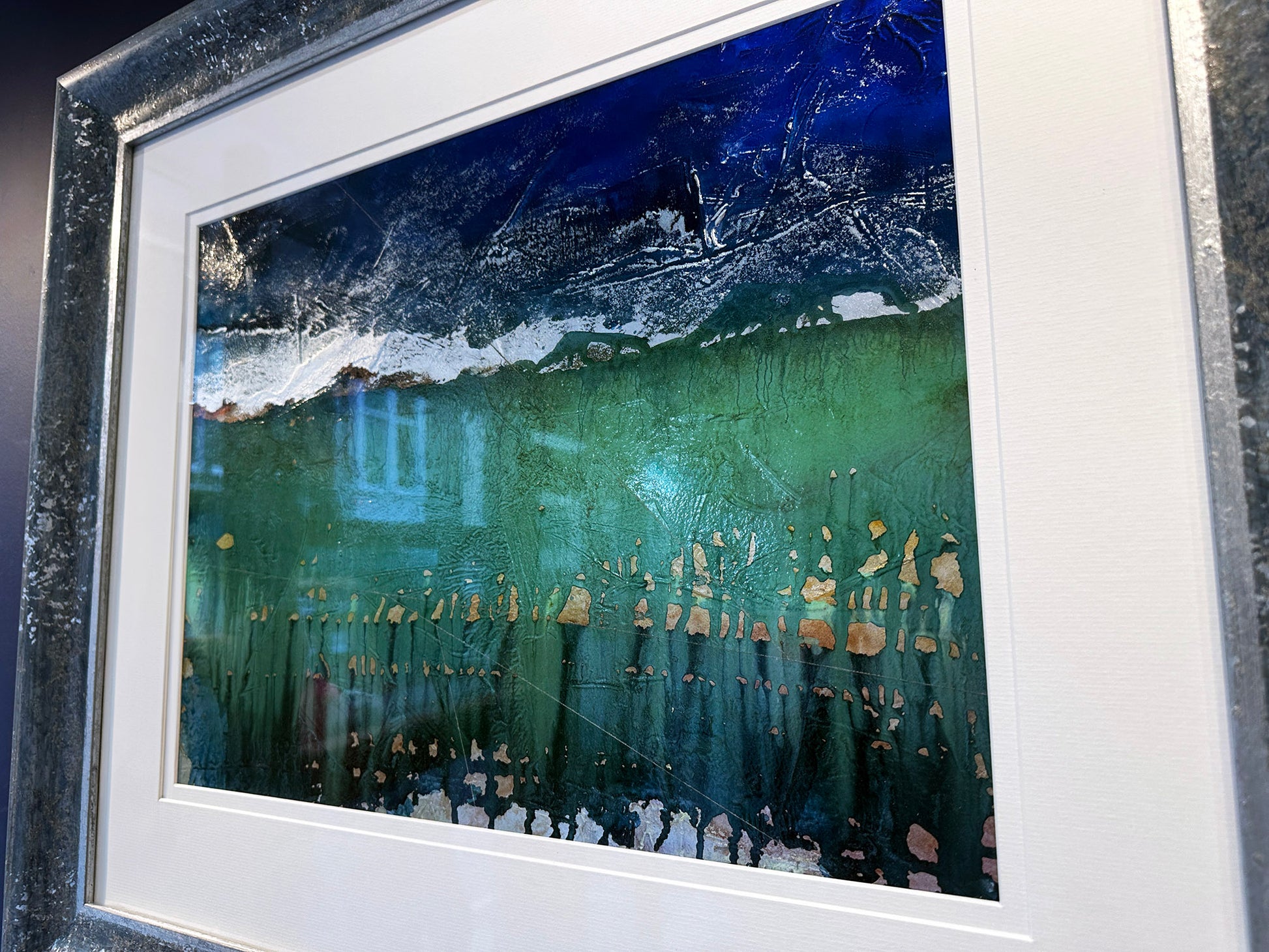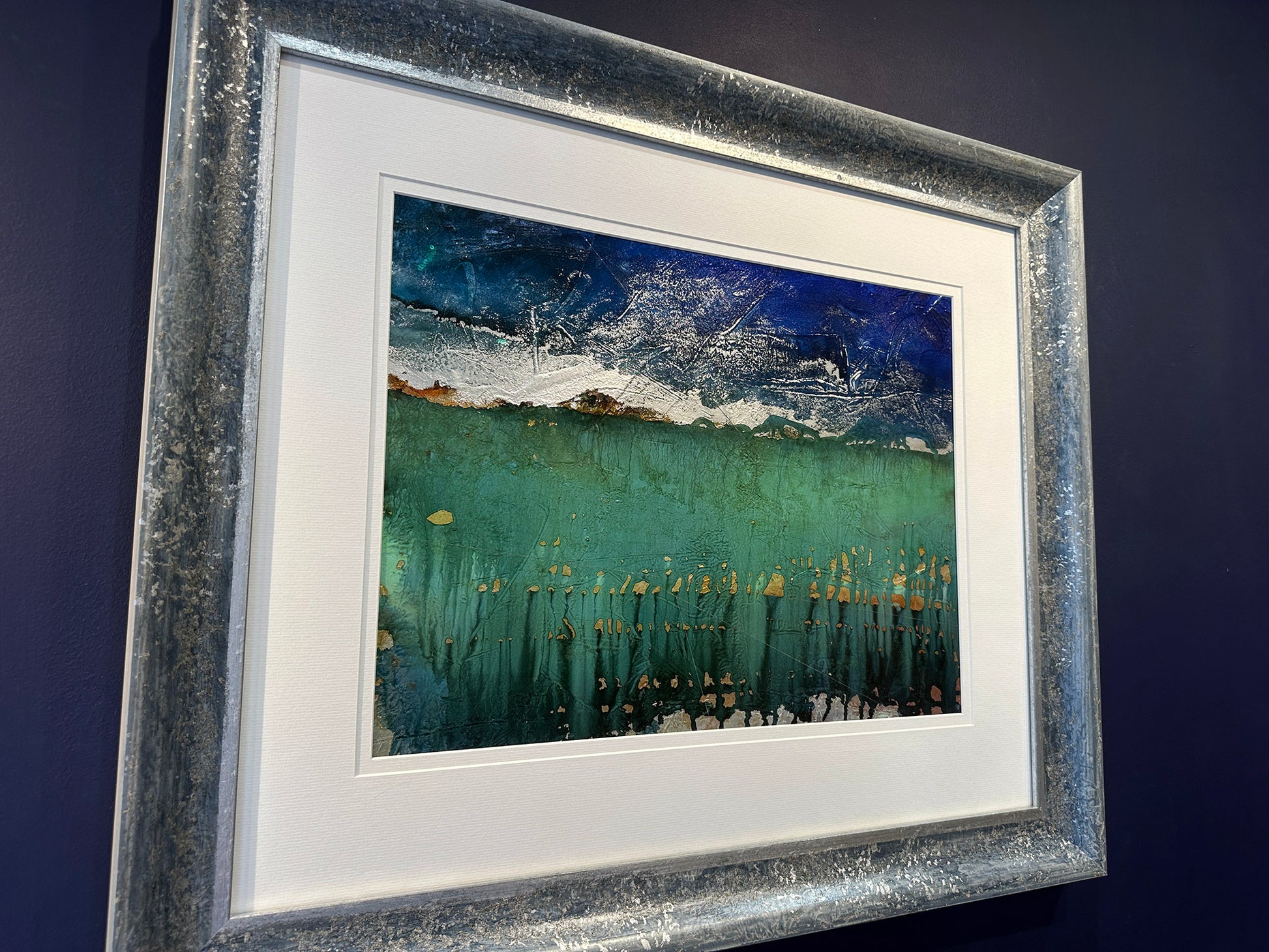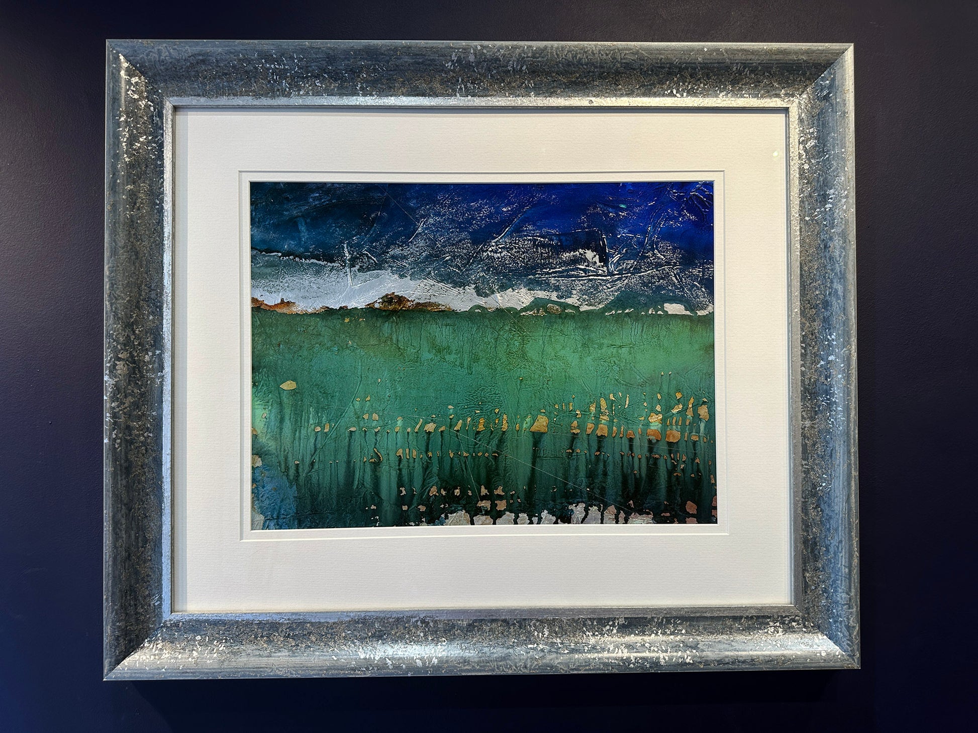 This luminous landscape invites the viewer into a dreamlike realm where nature’s elements dissolve into abstraction. A rich swathe of emerald green stretches across the canvas like a fertile plain, above which snowy peaks emerge in silver-white relief, textured with glints of metallic sheen. The dramatic indigo sky shimmers with layered tonal depth, offering a cool contrast to the grounded greens and copper accents below. Delicate golden flecks dance across the foreground like scattered petals or sunlit reflections. The distressed silver frame adds a modern elegance, catching light from every angle and echoing the crisp highlights within the piece. A quiet and powerful composition – evocative of tranquil spaces, shifting weather, and the elusive memory of wide-open places.