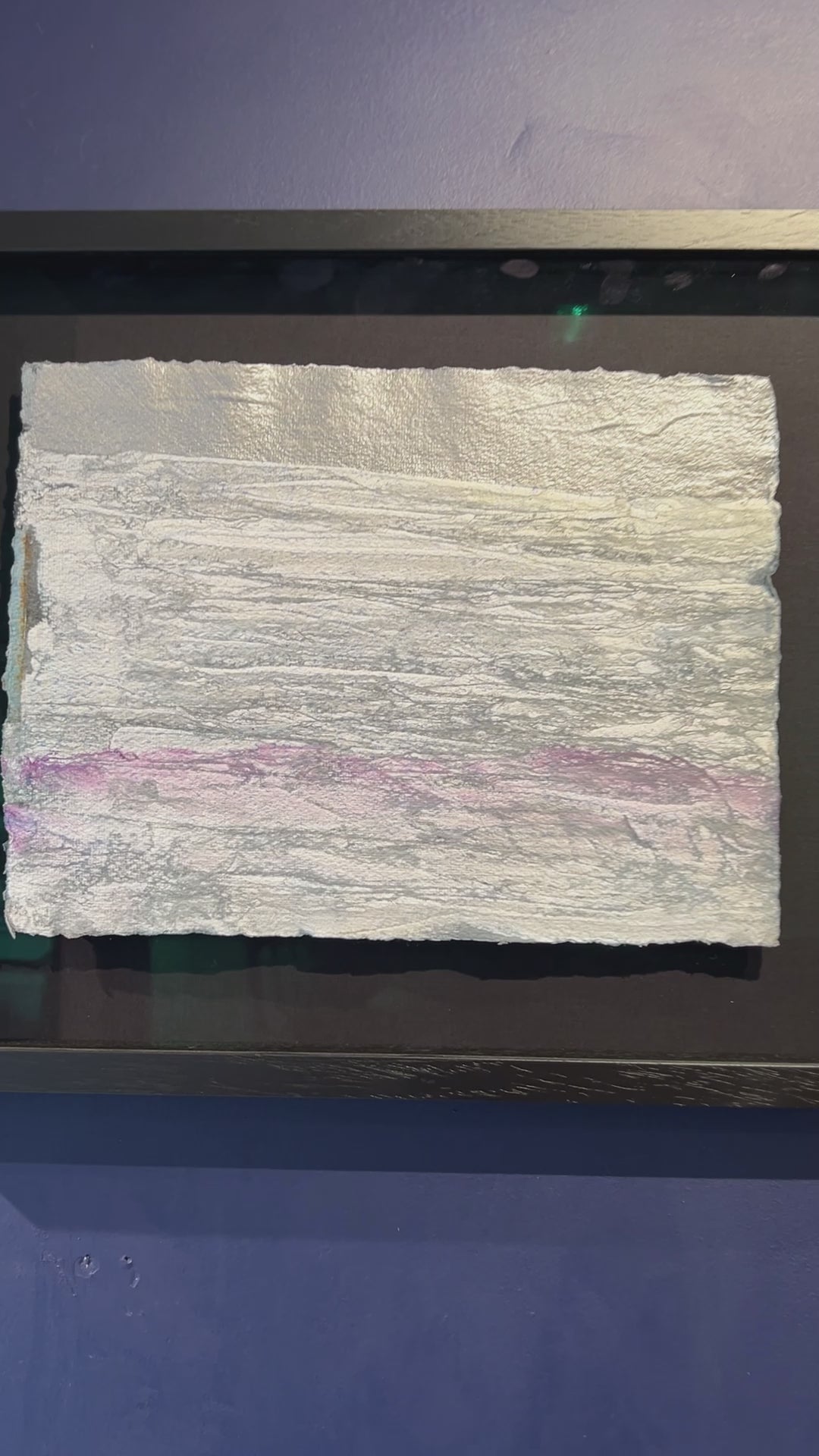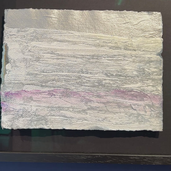 This glimmering abstract evokes the serene hush of a snowy plain under soft twilight. Layers of silvery-white texture, laid across handmade paper, mimic wind-swept drifts or glacial rock, while a gentle line of lavender-pink runs near the base, hinting at the last warmth of day. The crisp, torn edge of the paper adds natural movement and contrast against the sleek black shadow-box frame. With its shimmering surface and subtle tonal shifts, this work feels at once minimal and meditative – a quiet, contemporary reminder of winter’s calm and the beauty found in stillness.